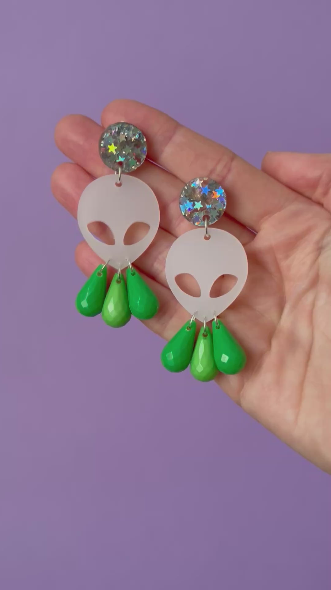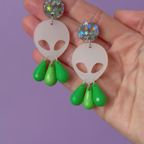 Frosted white alien faces with faceted teardrop beads and silver star holo glitter discs.