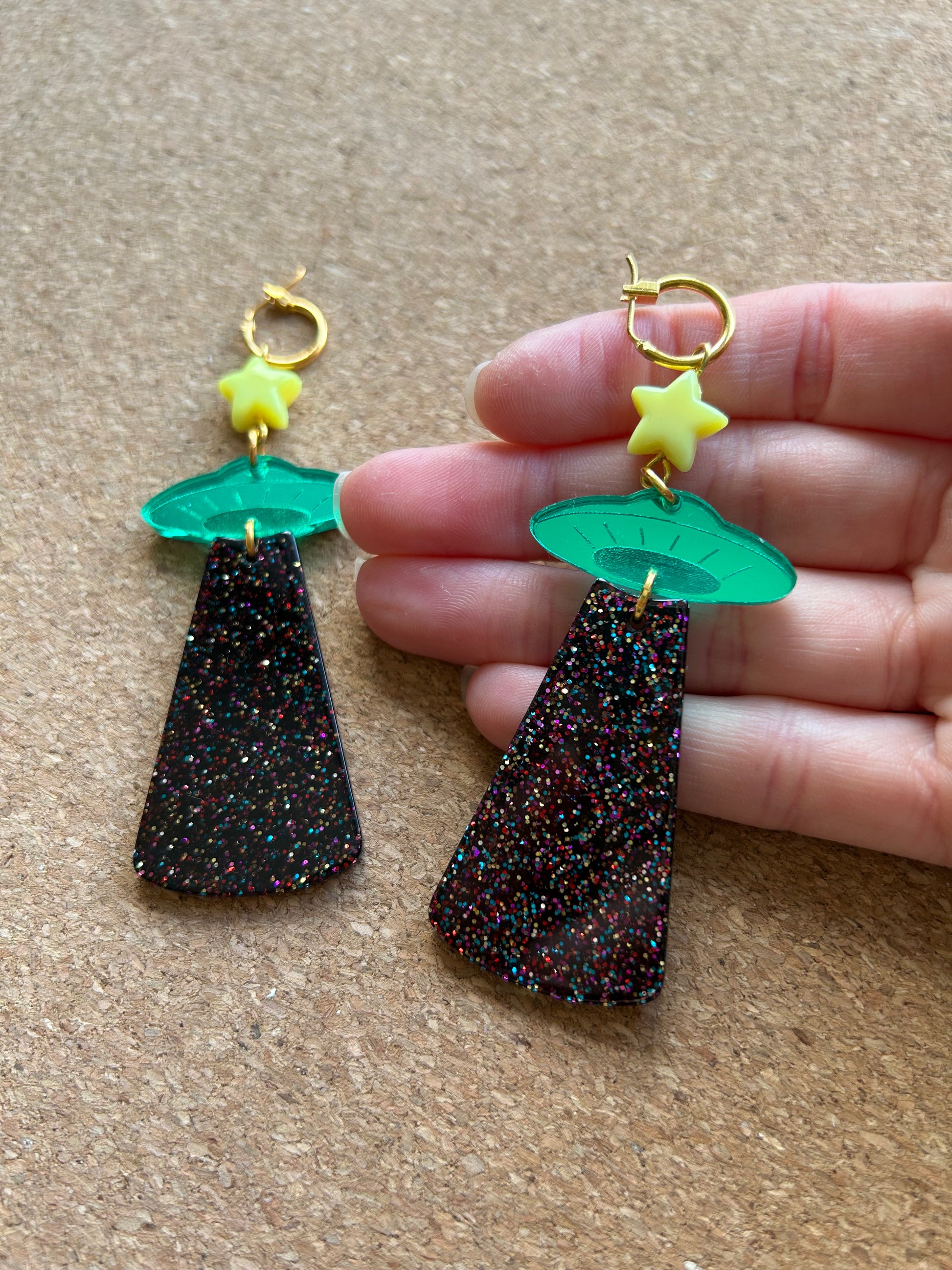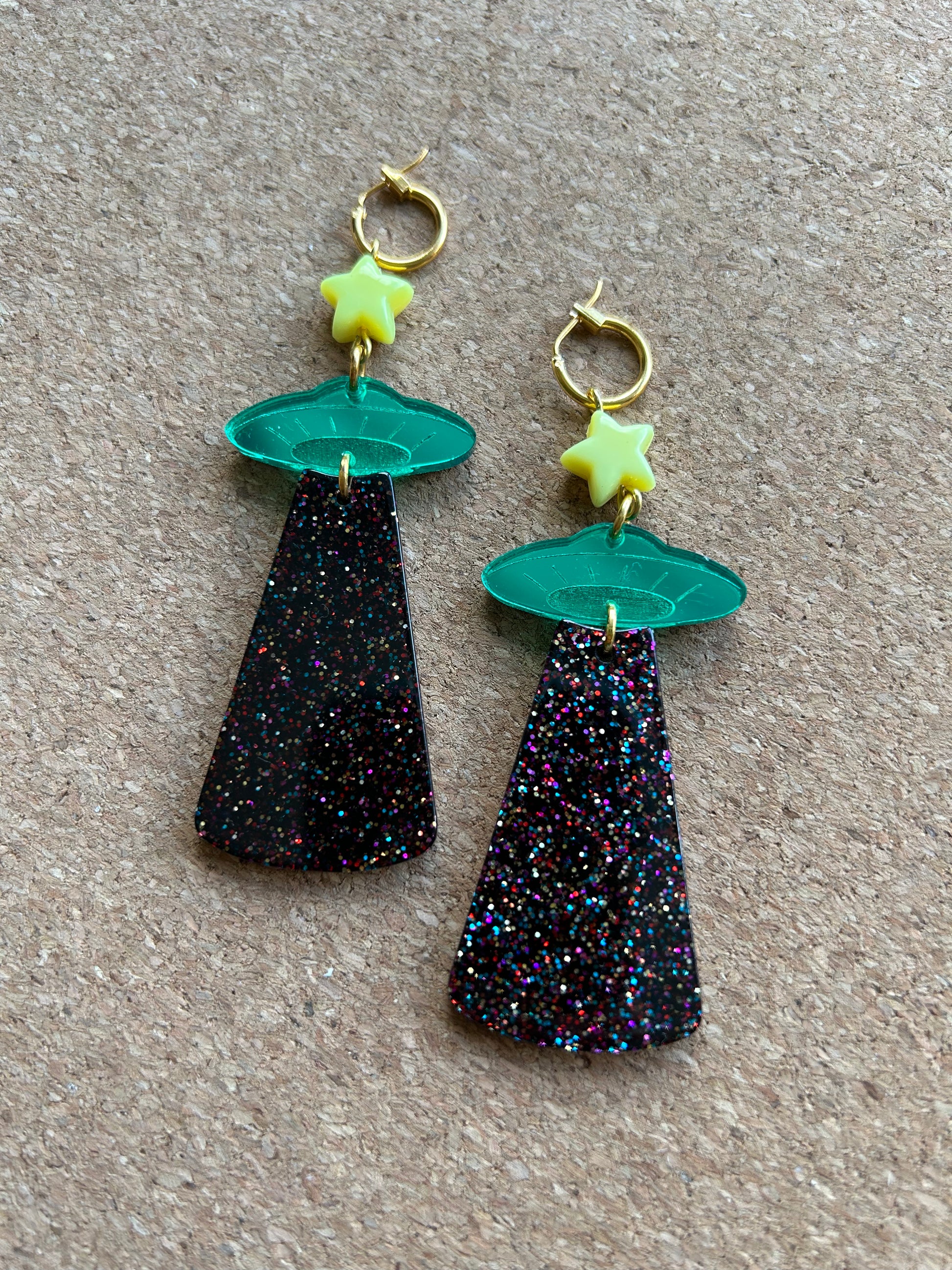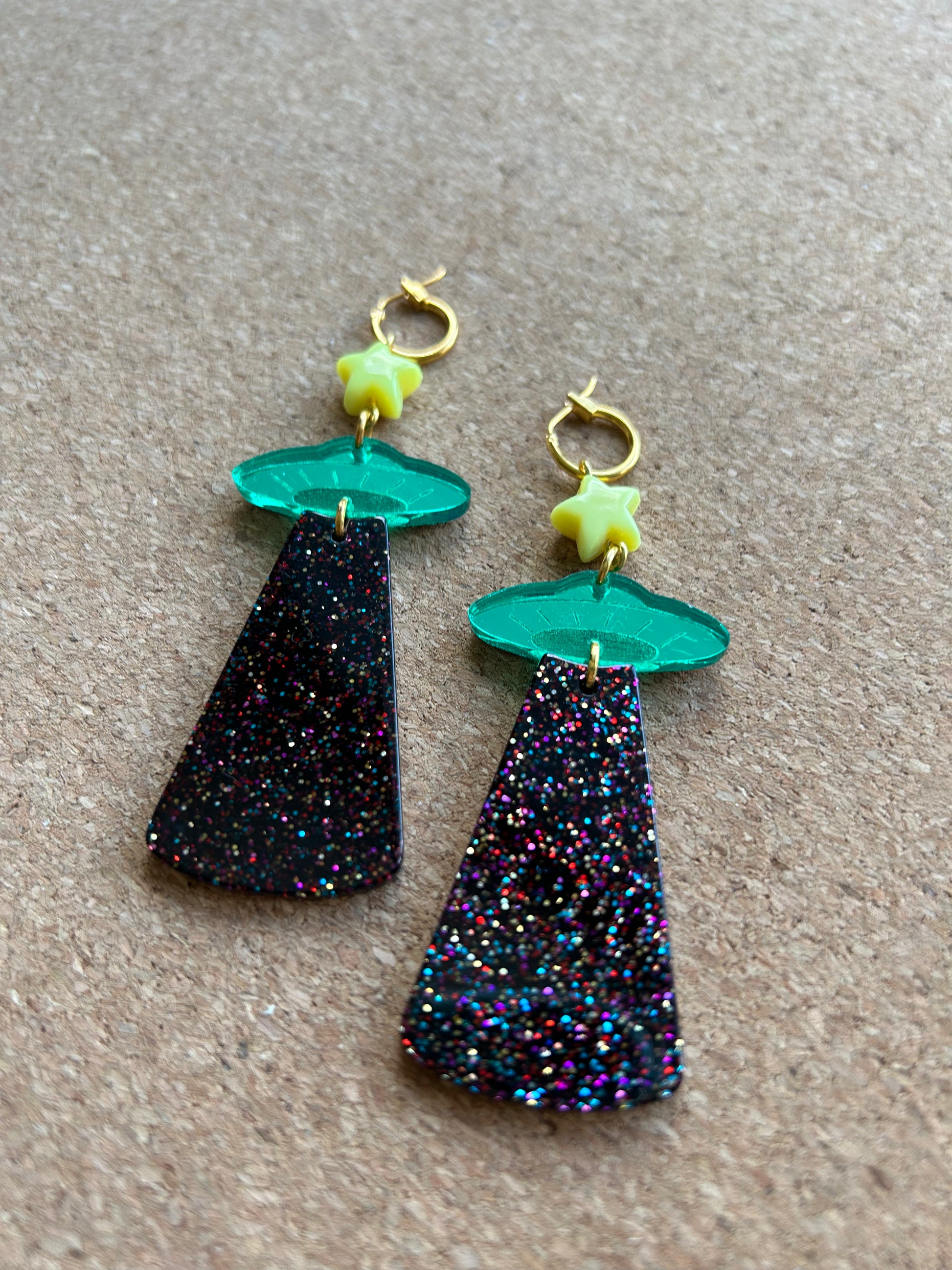 These are upgraded versions of a classic design. Gold metal hoops, plastic yellow star beads with green mirror UFOs and multicoloured glitter resin drops.