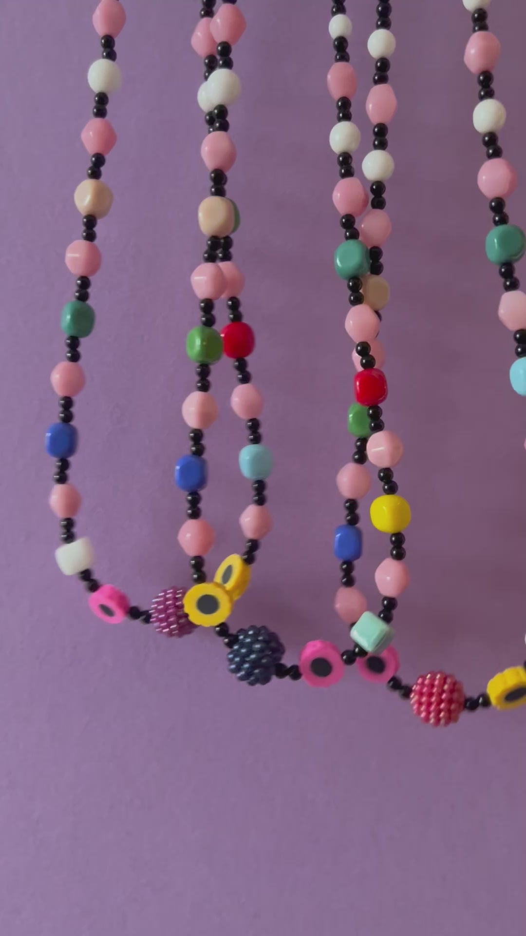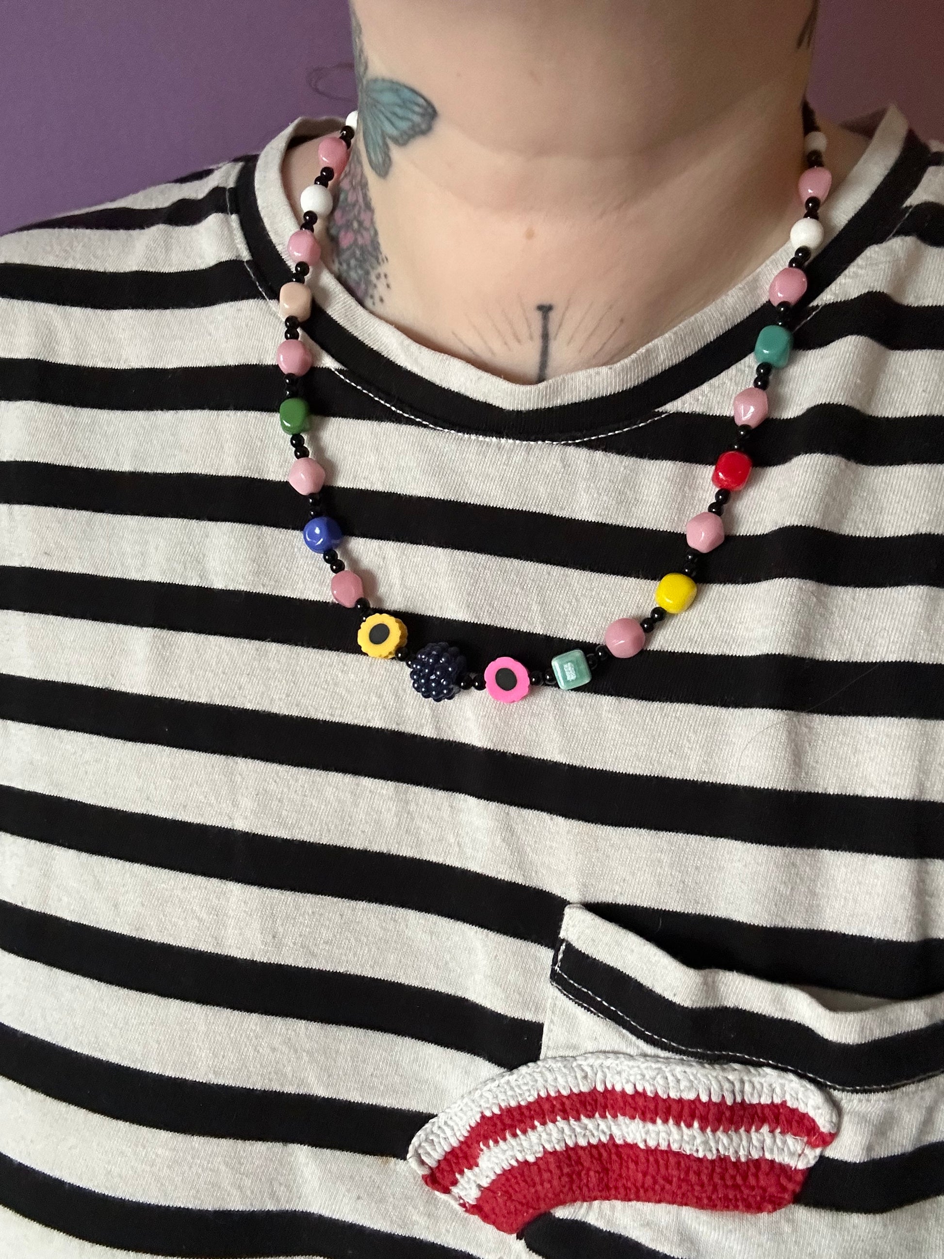 These beautiful necklaces have been made using a mix of fimo, plastic and vintage glass beads resembling liquorice allsorts and dolly mixtures. They are strung on thin wire with a lobster clasp. Each necklace is slightly difference and you can pick based on the main bobbly bead colour. The colours are plum, navy and raspberry.