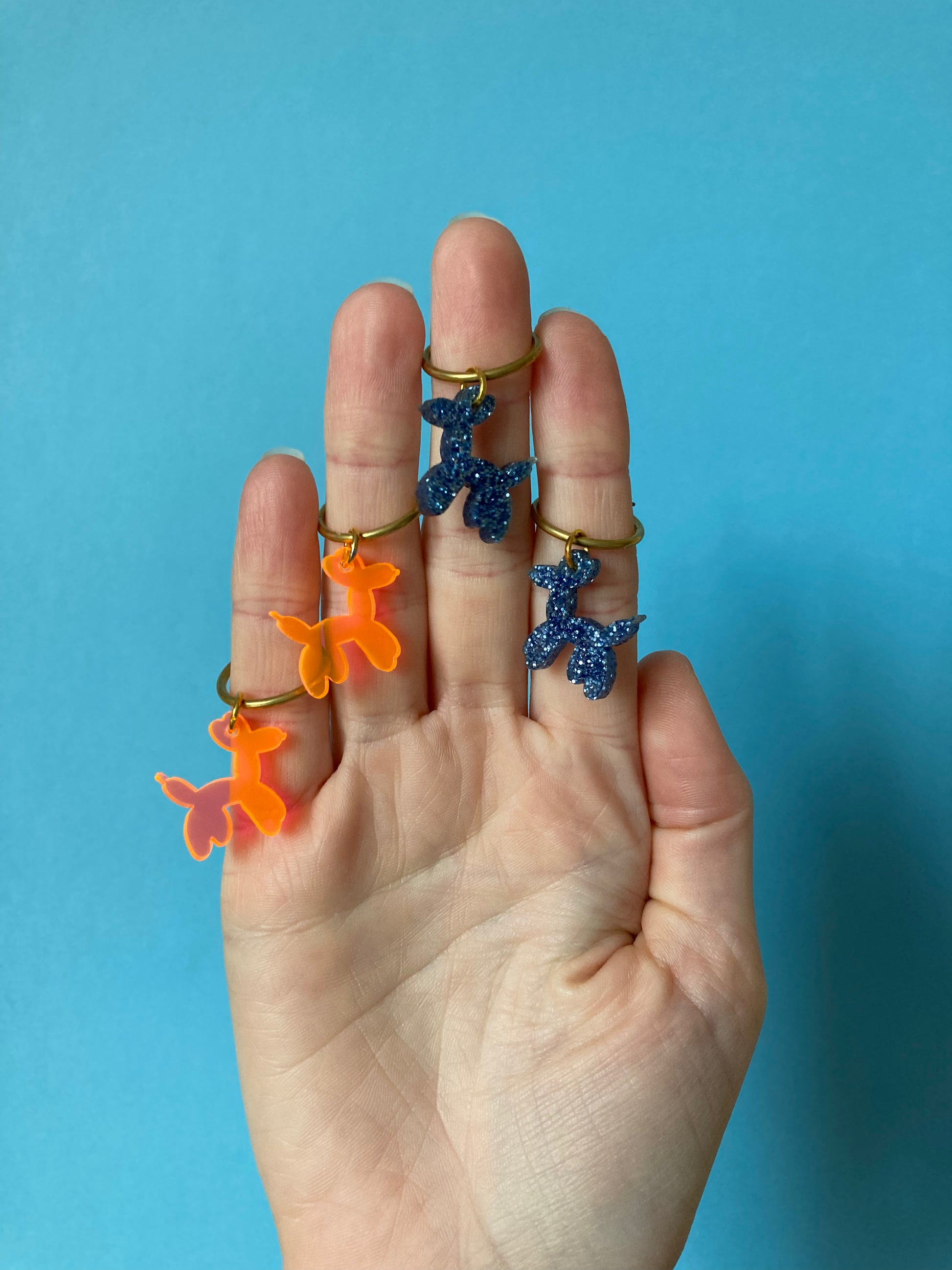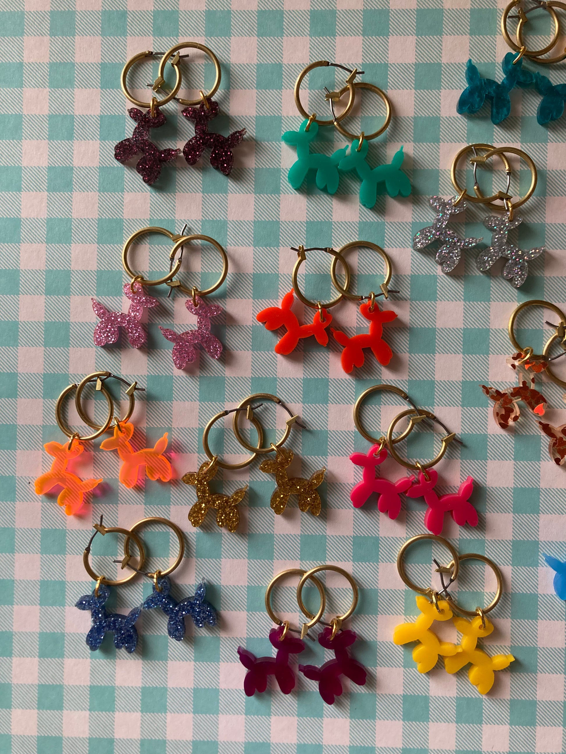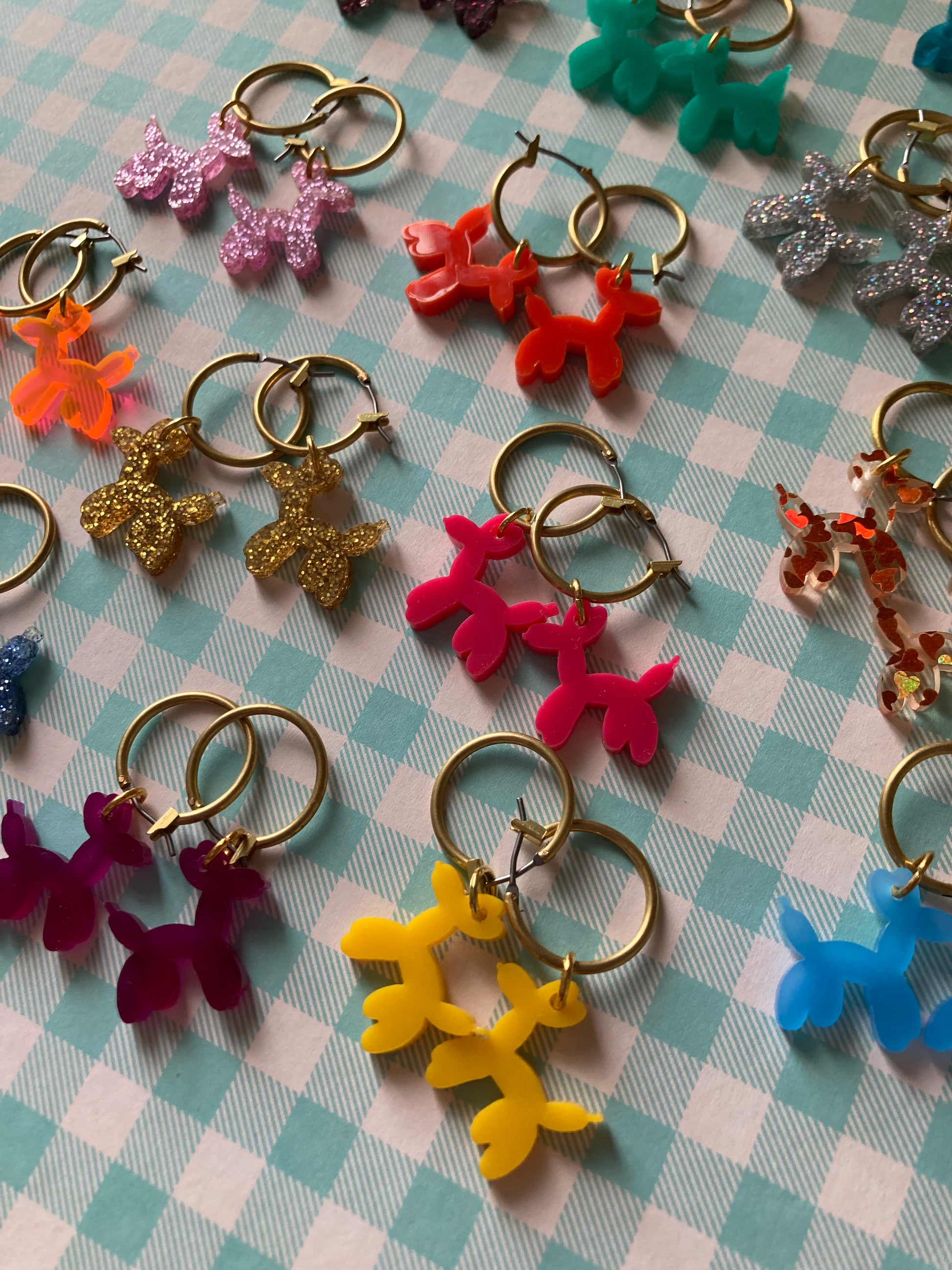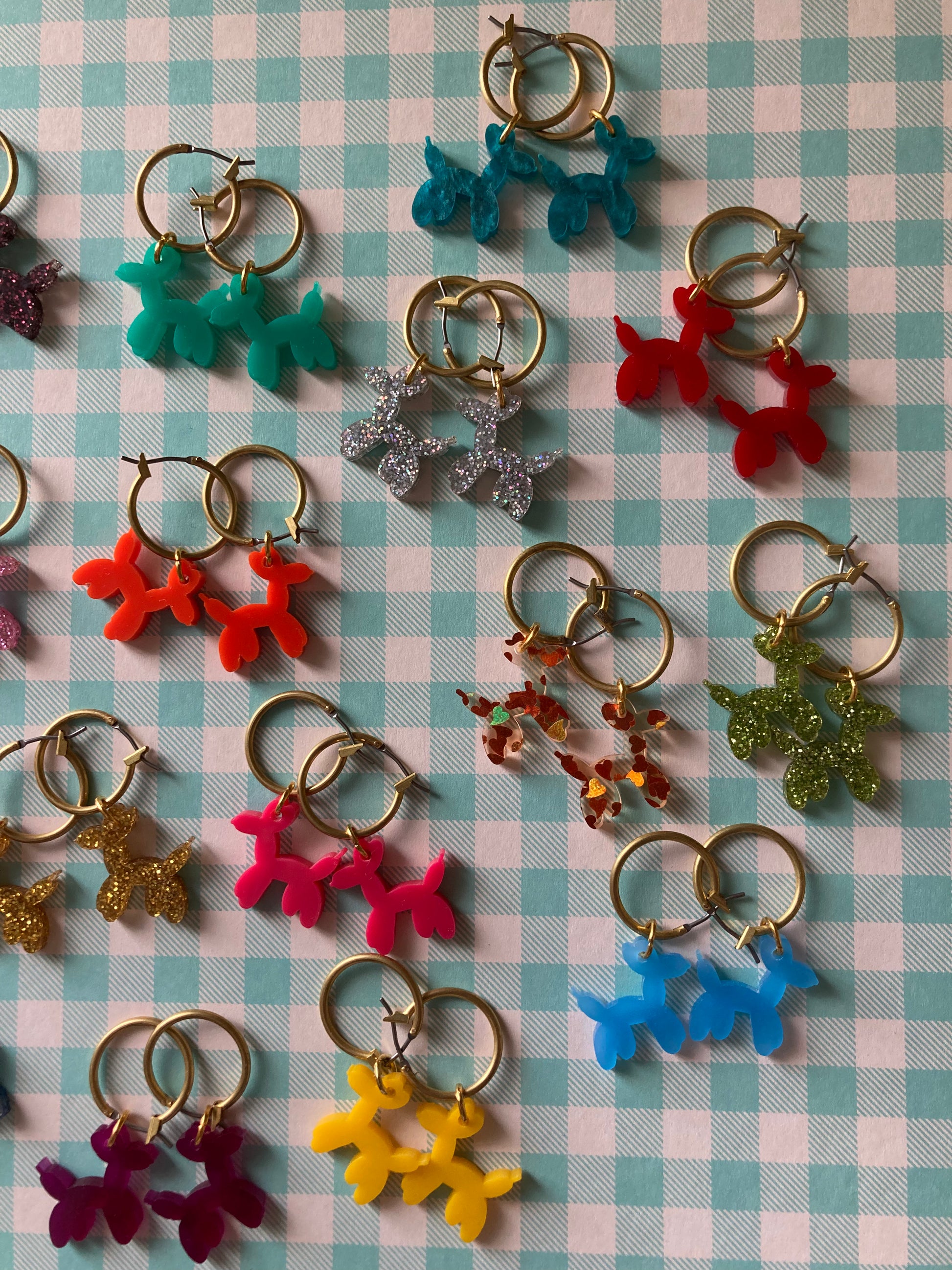 These little cuties remind me of childhood birthday parties and bringing balloon animals home with a slice of cake! These charms are dangling from tarnished brass hoops in the following colours: