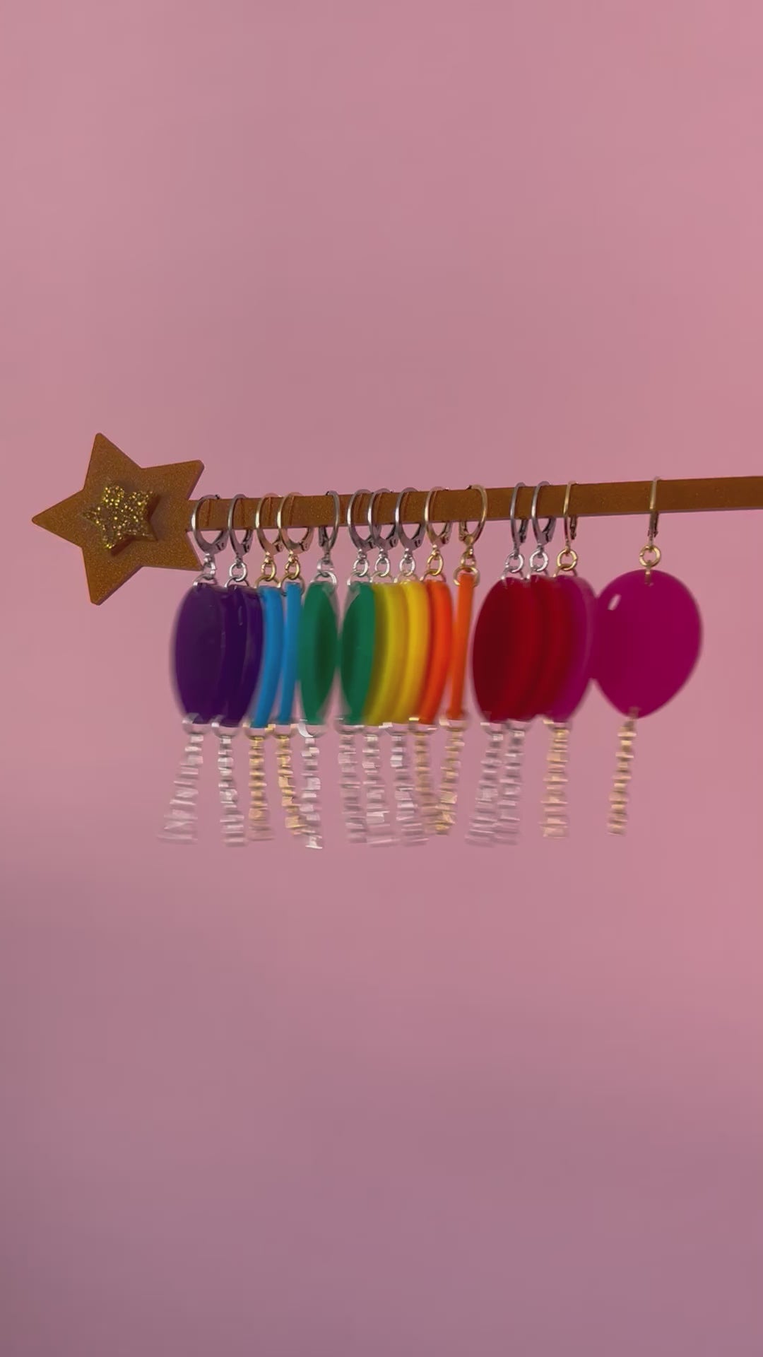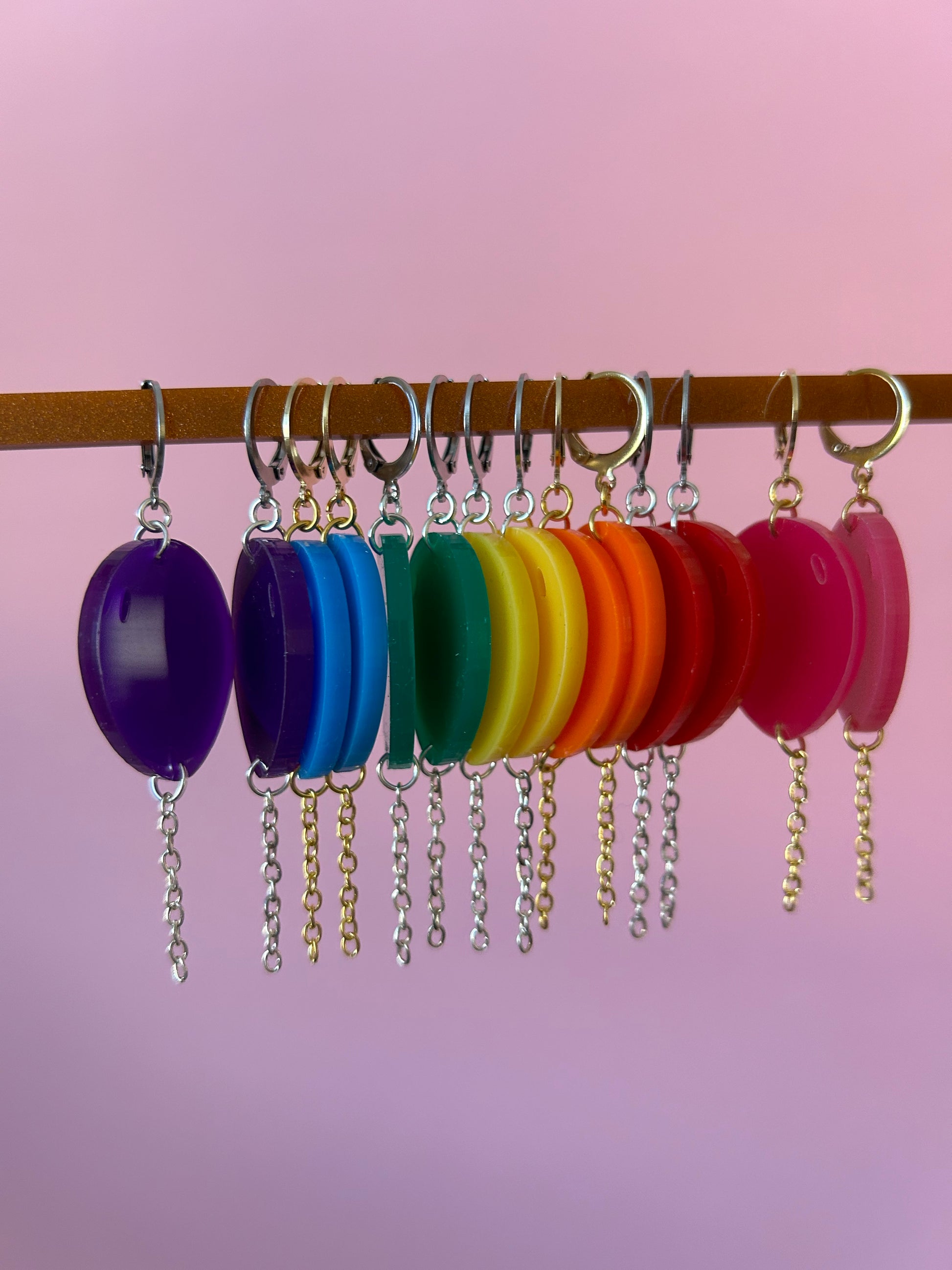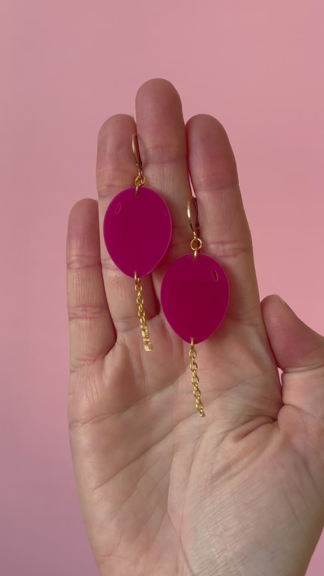 These little acrylic balloon earrings are suspended from lever back hoops with thin chain danglies! Available in purple, blue, green, yellow, orange, red and magenta. Please see pictures as some earrings have gold metal findings and some have silver metal findings.