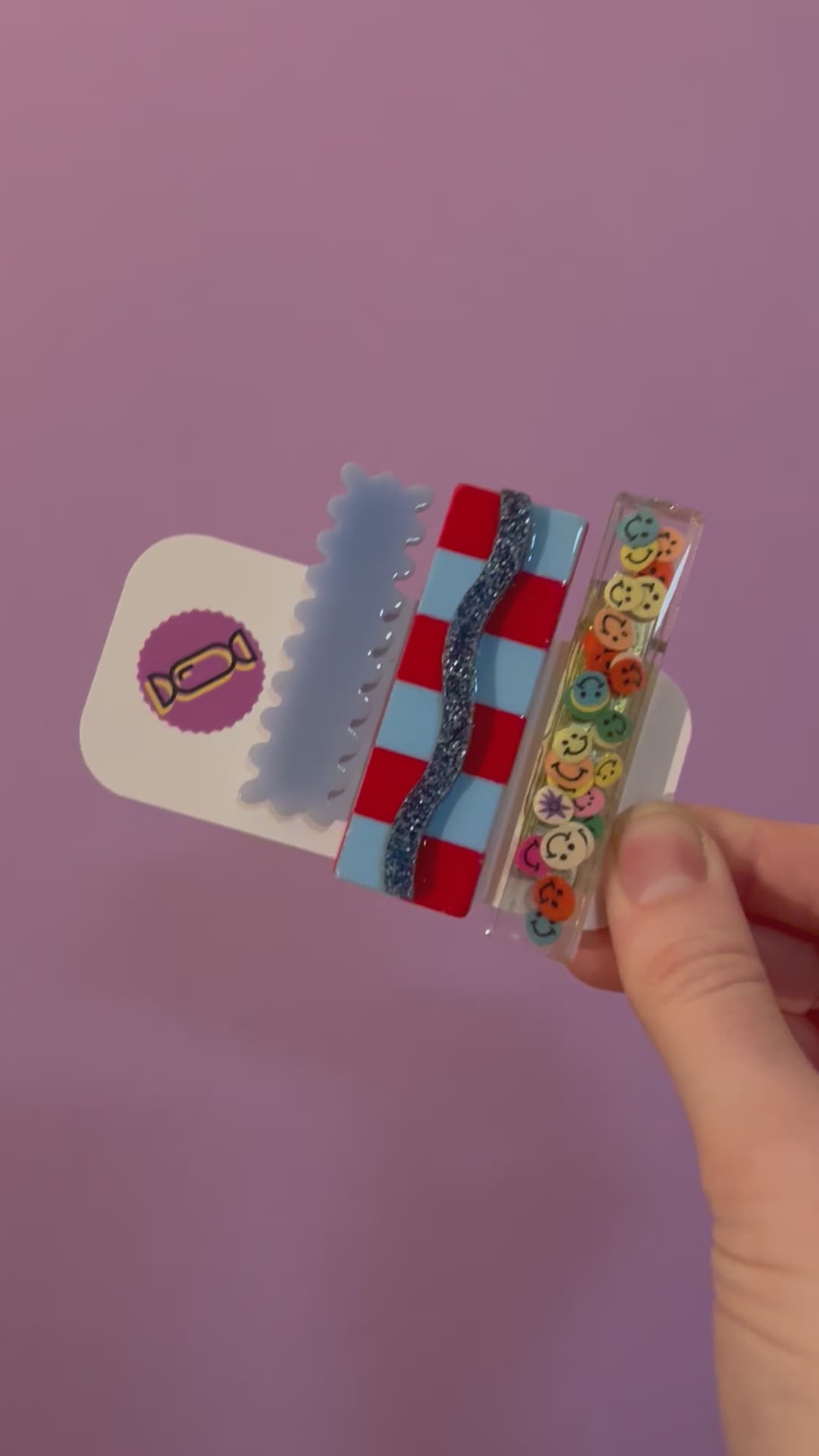 Set 1. Blush frilly clip, red & pink check slide with blue glitter acrylic and smiley resin slide.