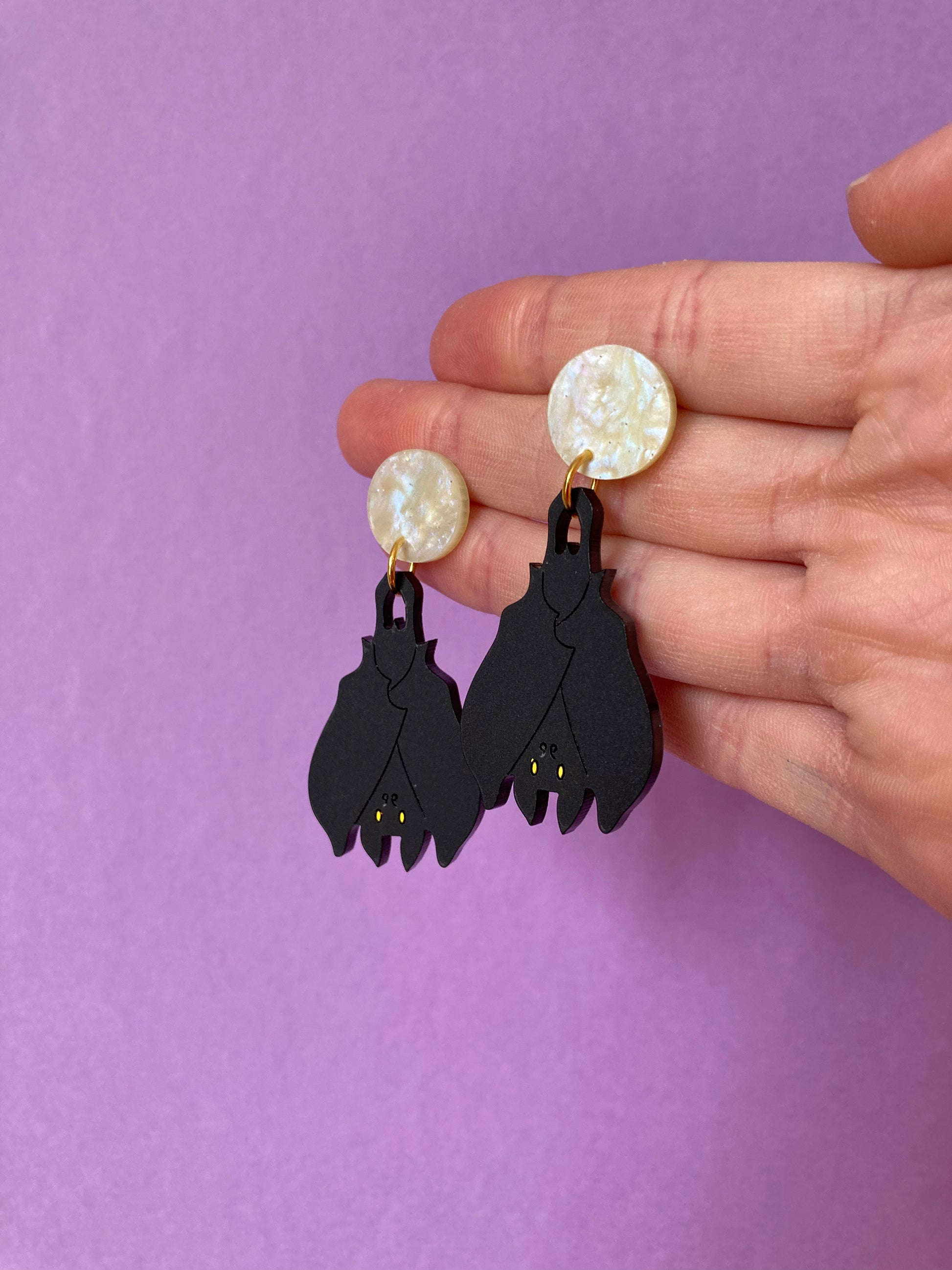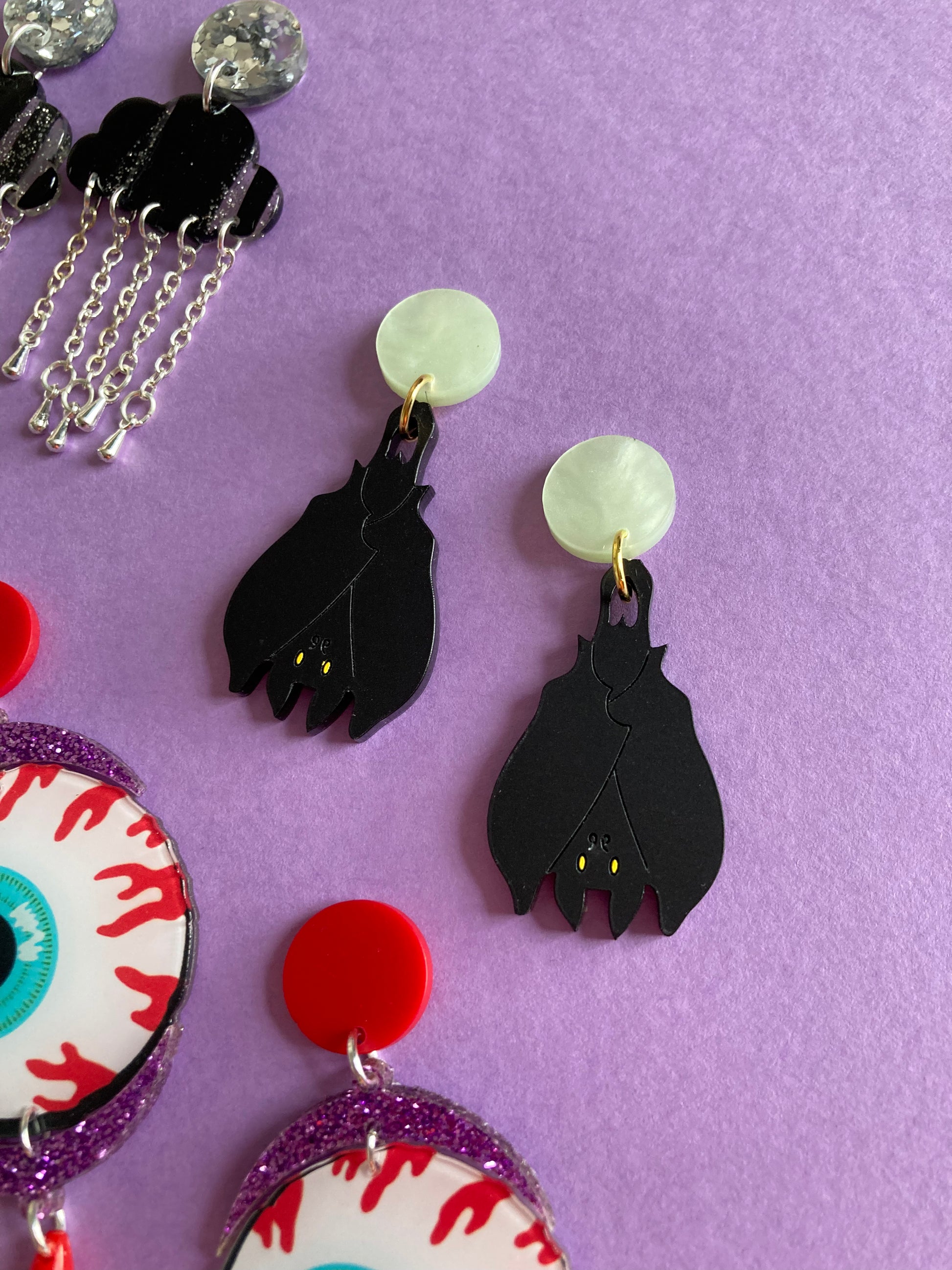 Matte black hanging bats with yellow eyes suspended from pale yellow swirly moon discs.