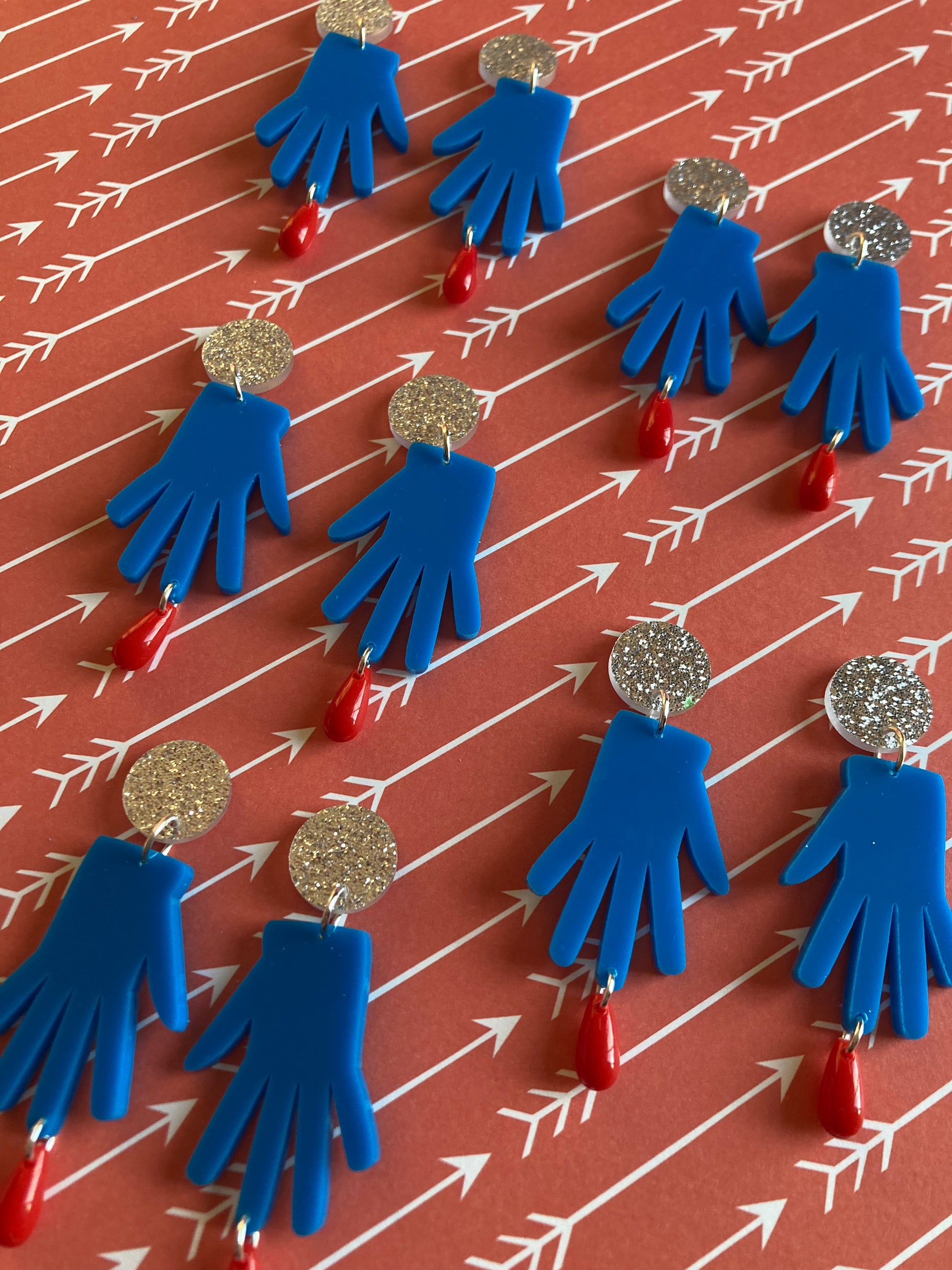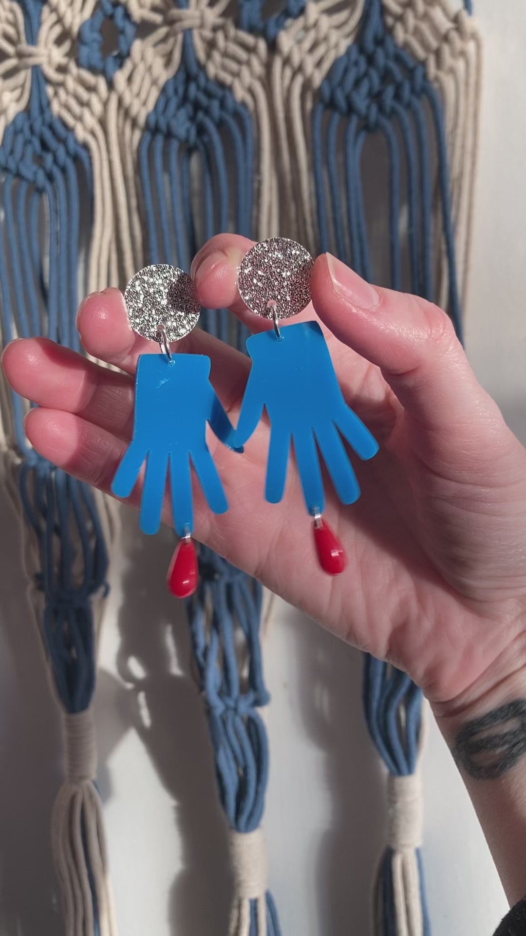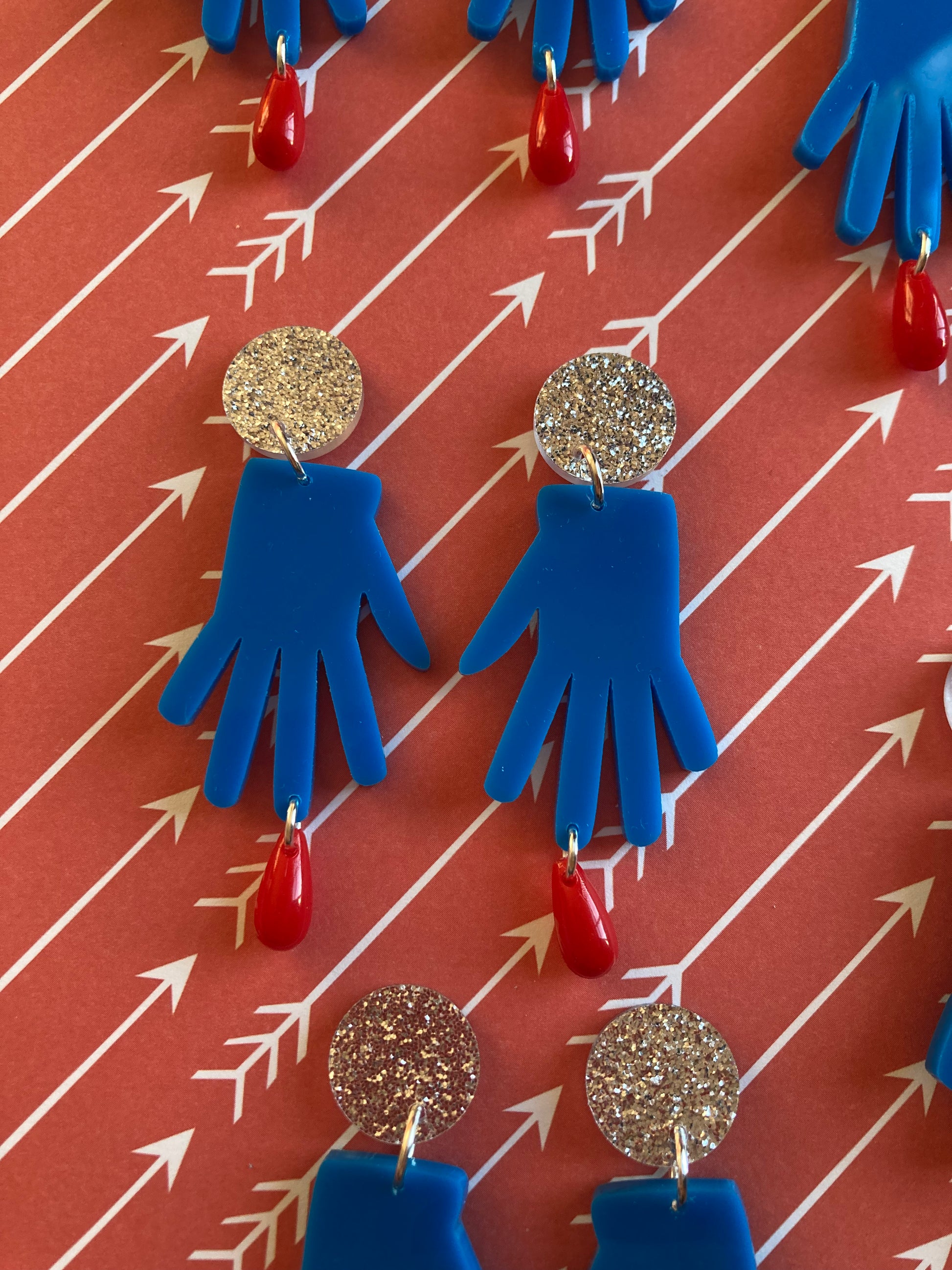 These earrings are reminiscent of my job as a scrub nurse with blue acrylic gloves, silver glitter discs and a drop of blood made with vintage red teardrop beads.