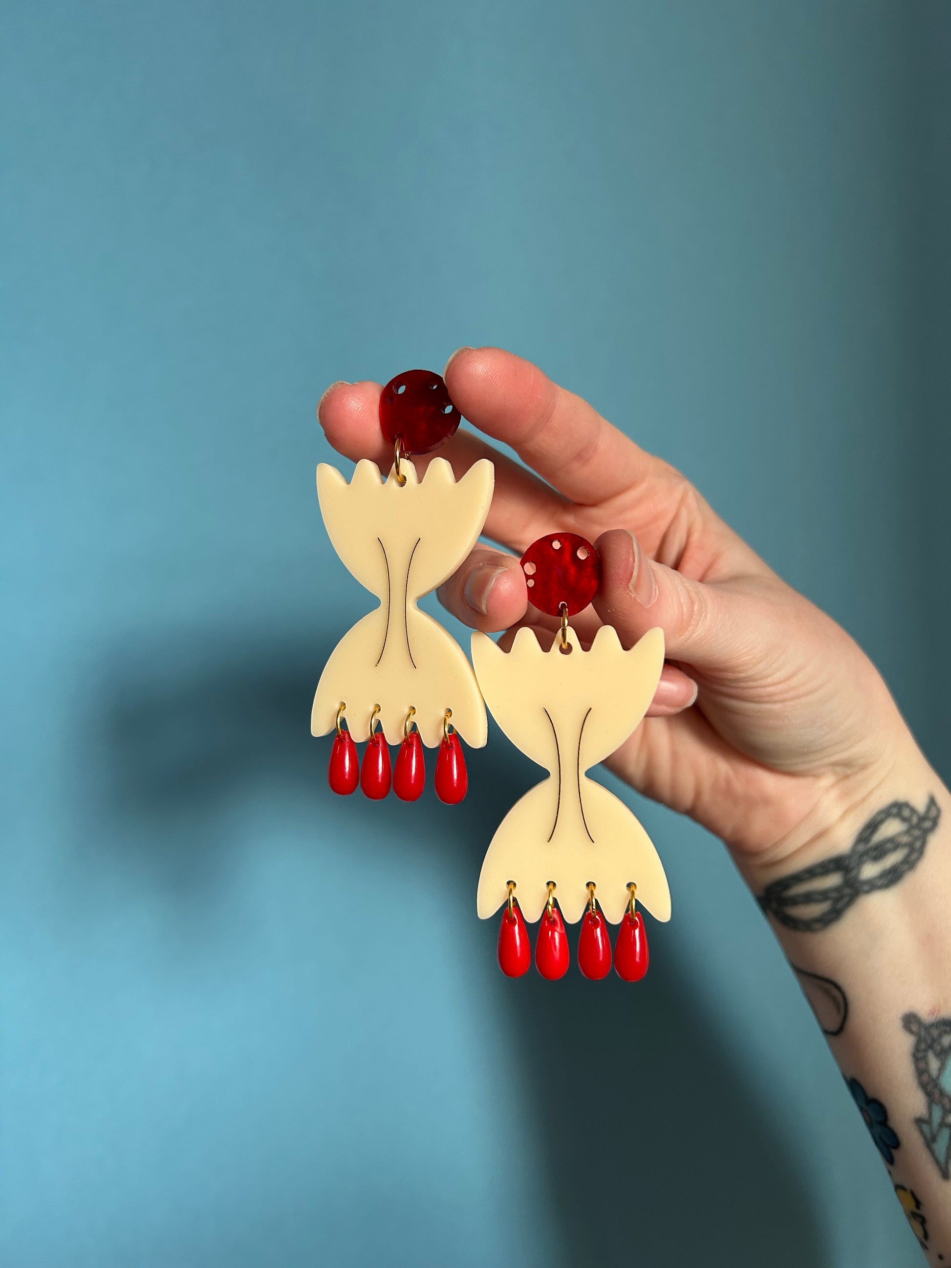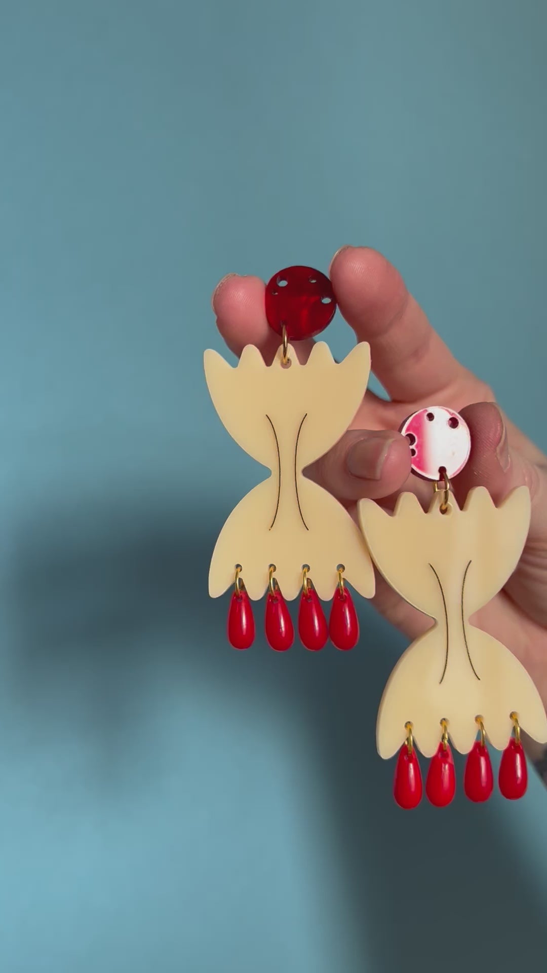 Aren't these amazing?! Big acrylic engraved pasta bow earrings with vintage plastic red teardrop beads and suspended from marbled red 'meatball' tops!