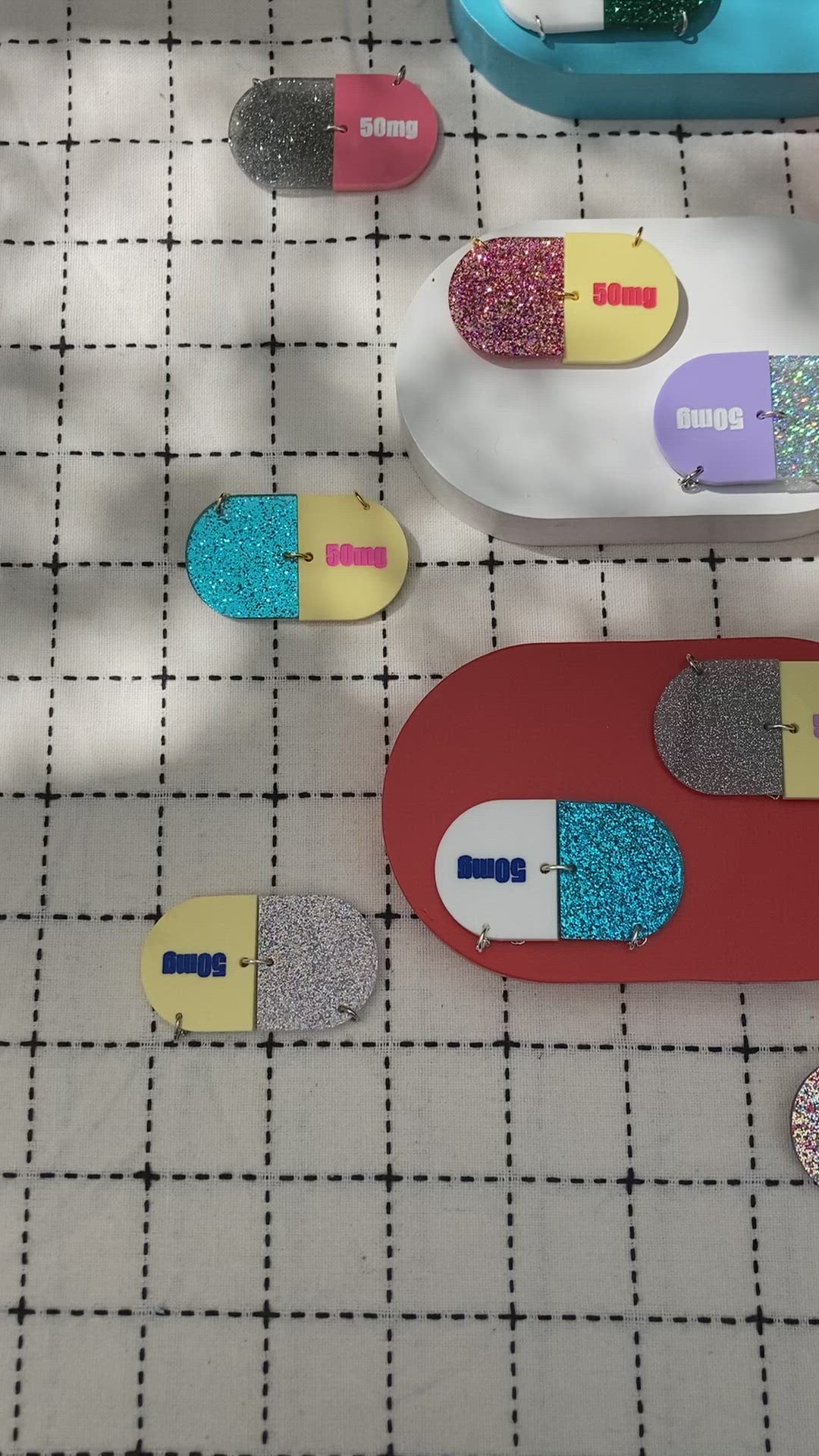 The ultimate Candy Pill accessory is a Big Pill necklace! One half is glittery and the other half is opaque acrylic with the engraving '50mg'.