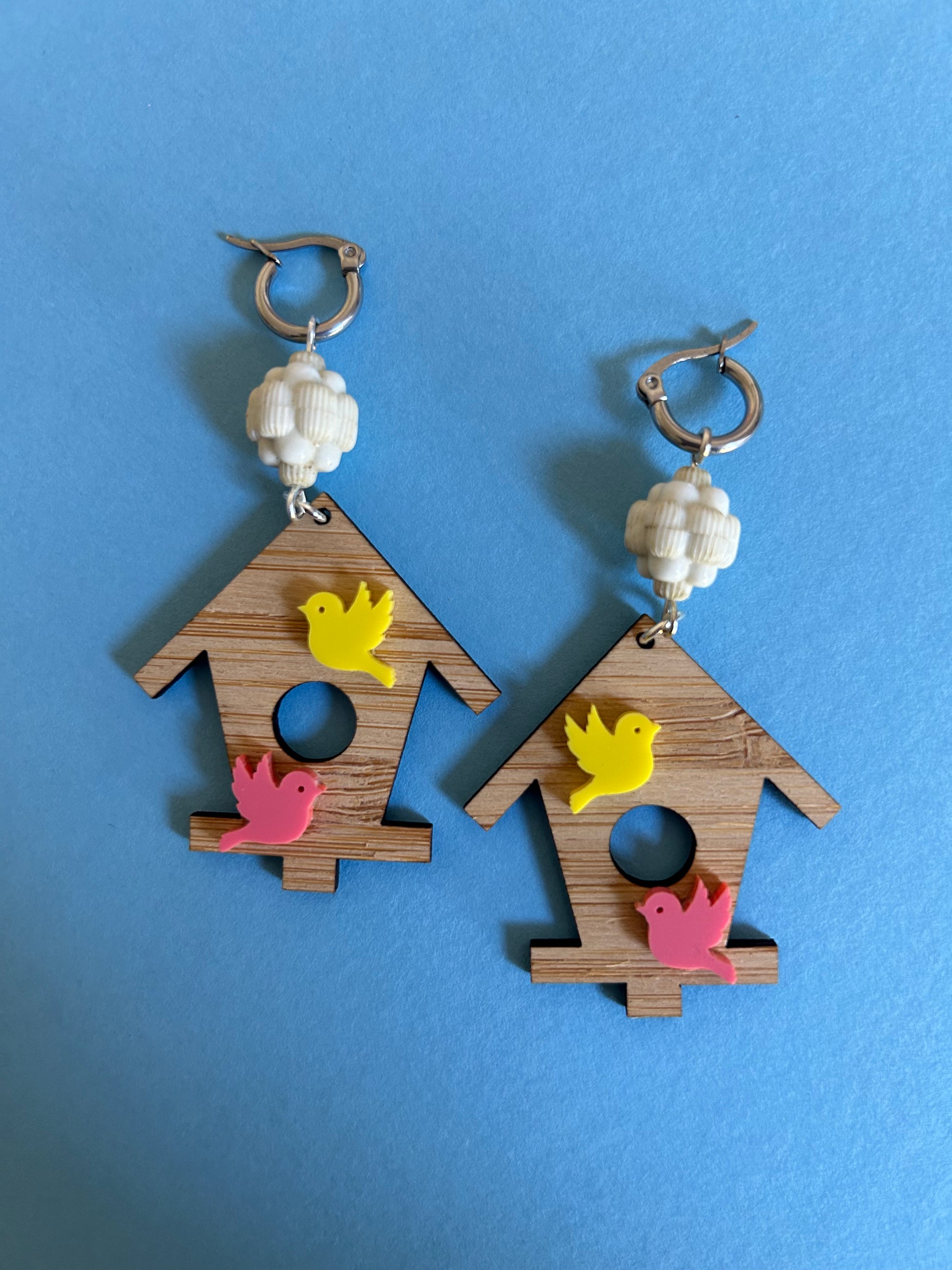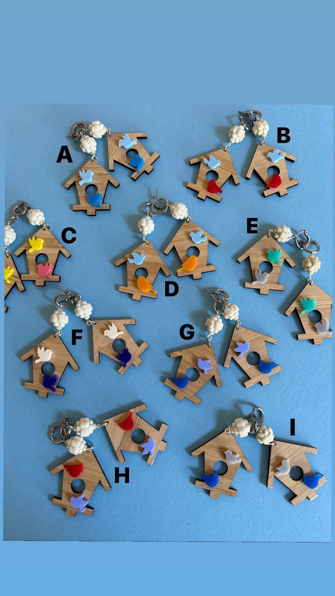 Wooden birdhouses with acrylic birds suspended from hoops with vintage cream beads that look like clouds. Each pair is a different colour which are alphabetised in the last picture.