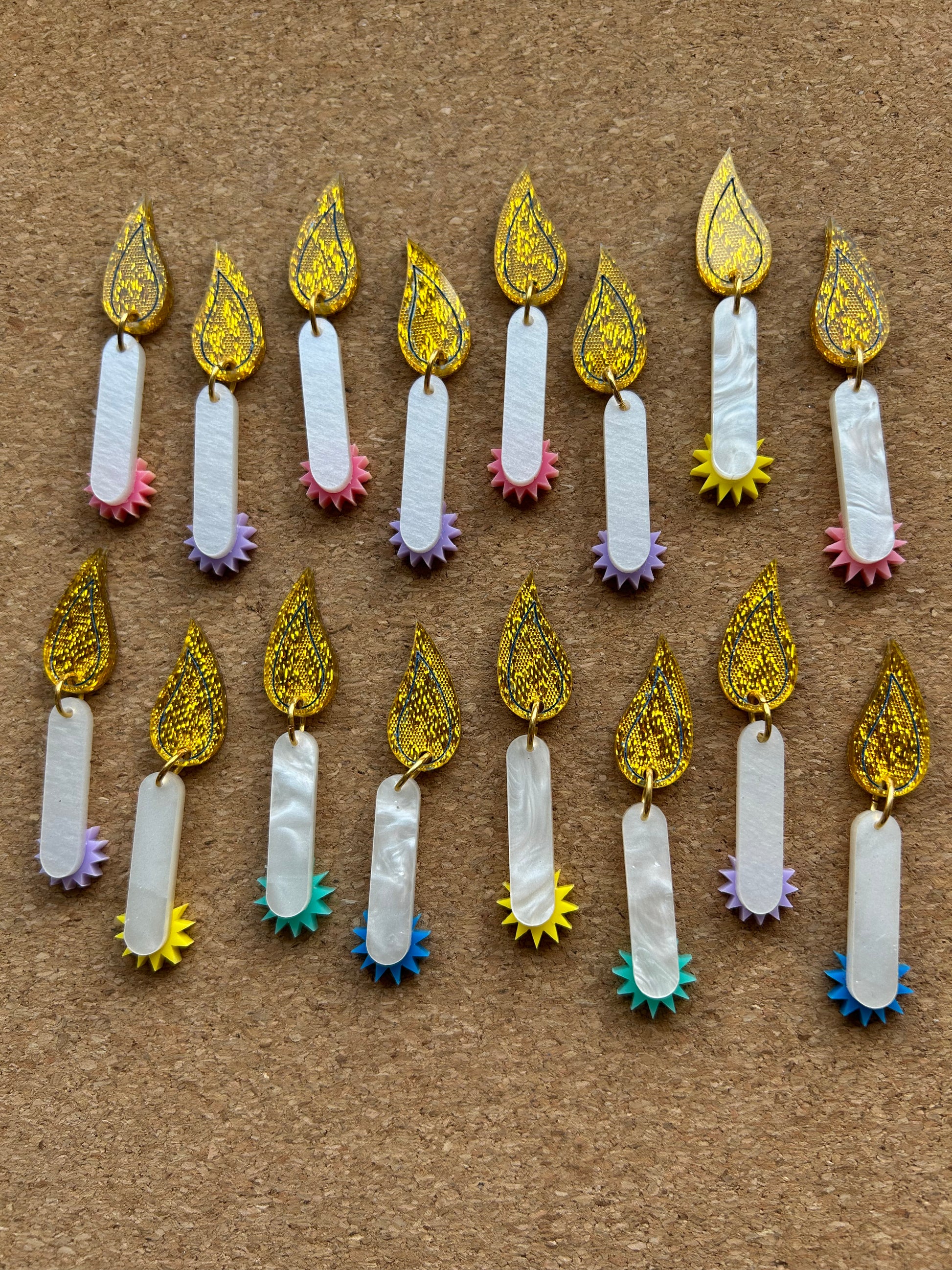 These are upgrades to Candy Pill classics. Pearlescent candlesticks, spiky acrylic bases and sparkly flame tops. Each pair has different colour bases for a funky twist. Colour options: