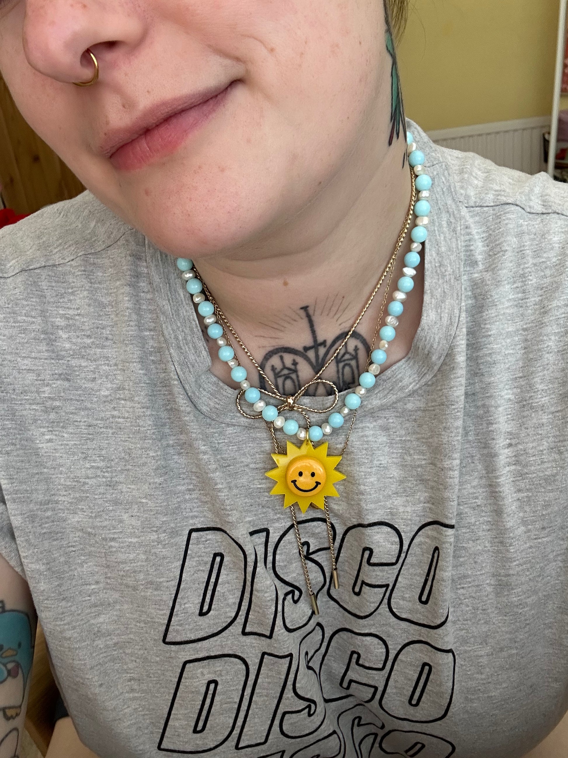 These are super cute and perfect for the summer! Smiley face cabochons on yellow laser cut acrylic starbursts threaded on beading wire with freshwater pearls and blue plastic beads with a lobster clasp. Available in three different shades of blue beads - Aqua, cornflower and bold (left to right in the second picture).