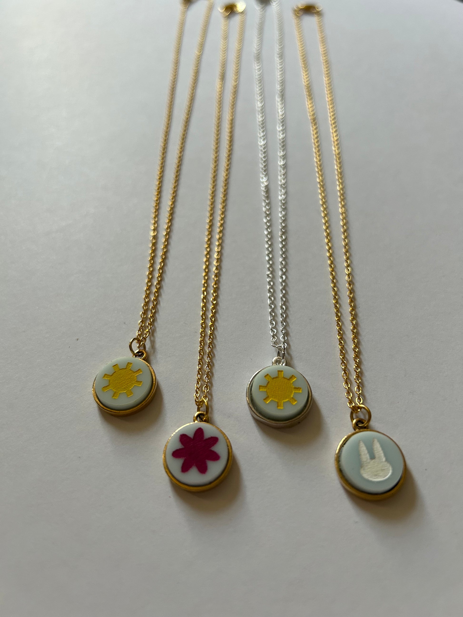 Teeny round engraved acrylic cameos in gold or silver metal frames with matching metal chain. The acrylic is the palest blue and the charm options are: