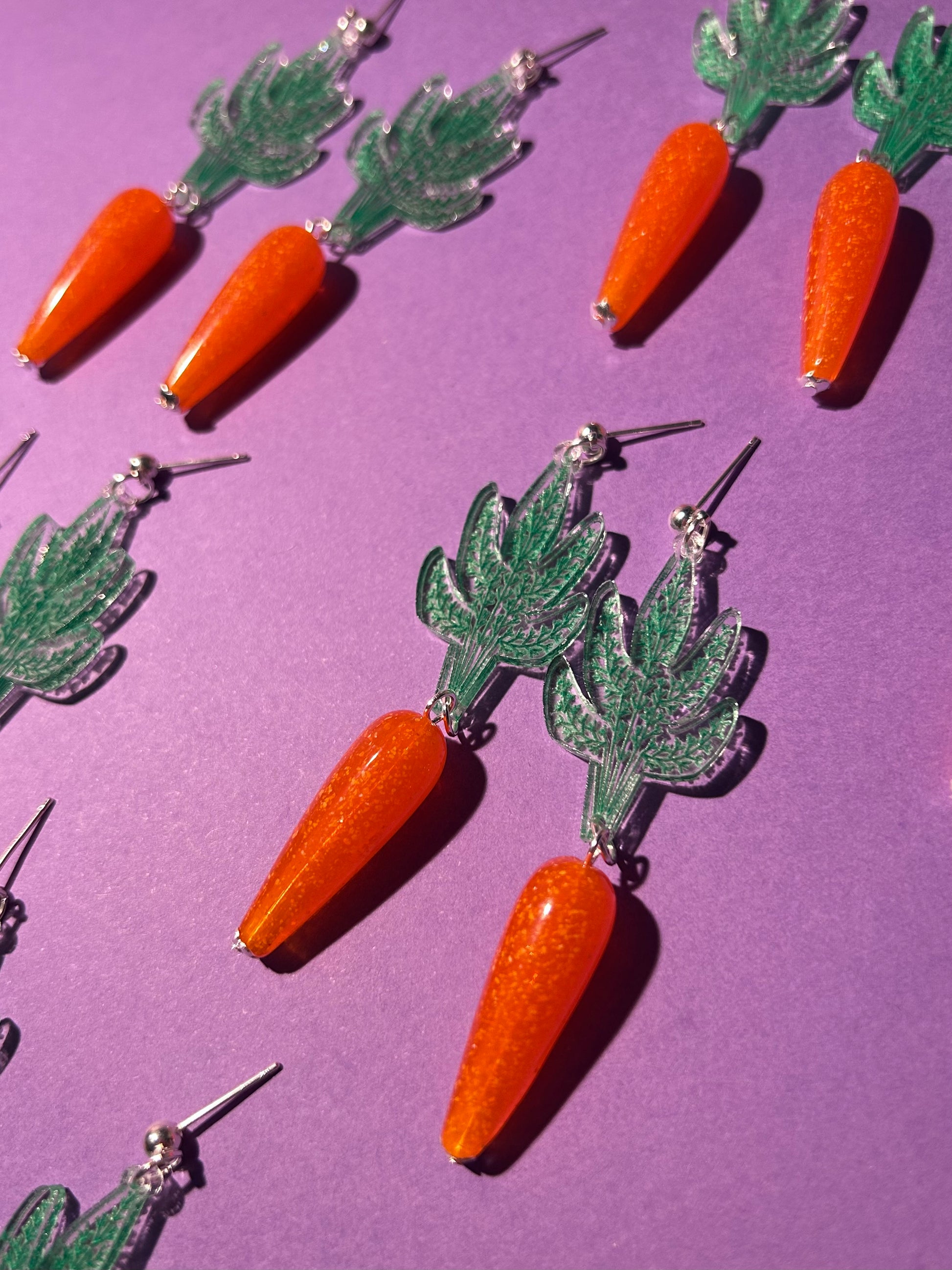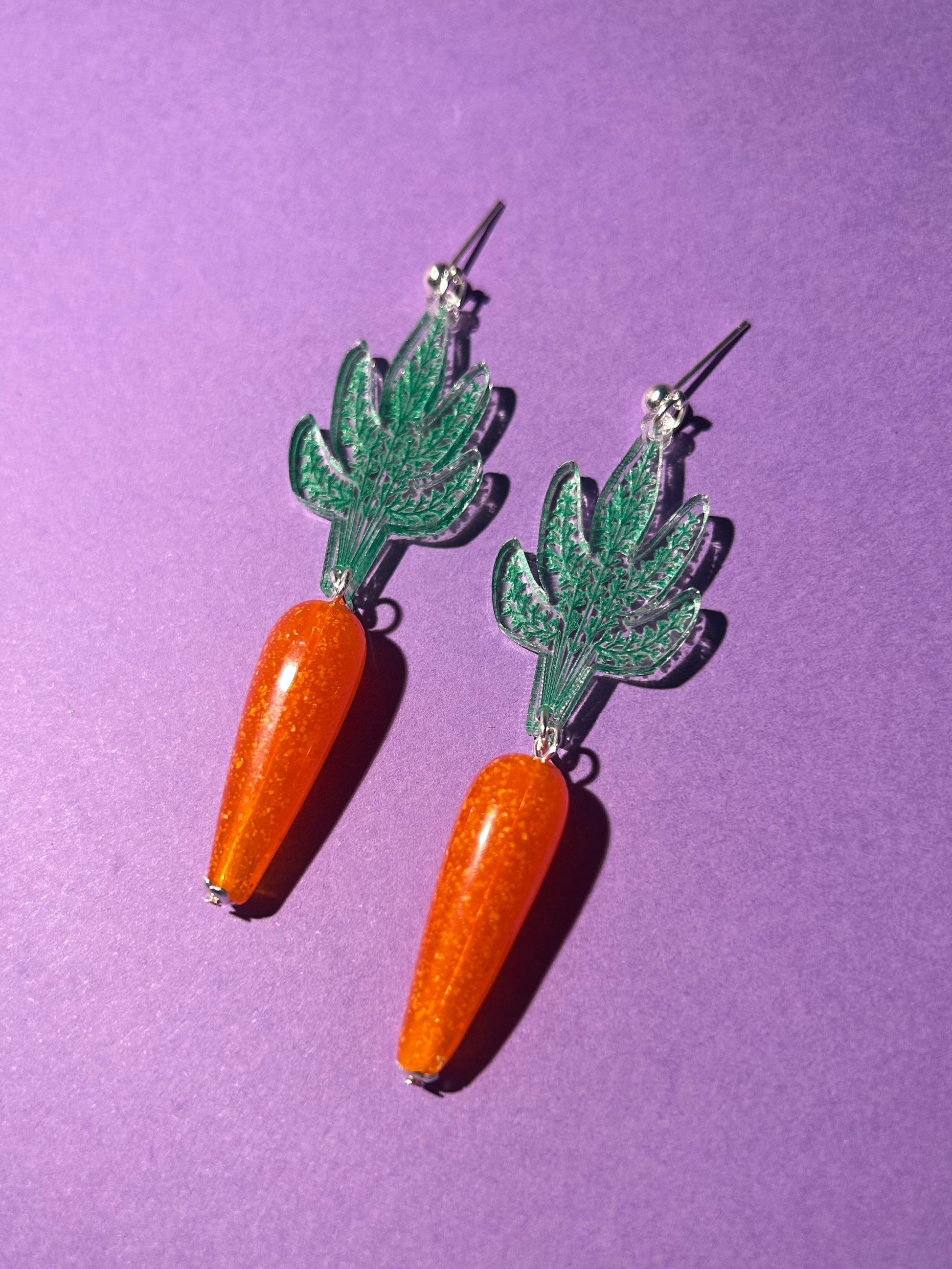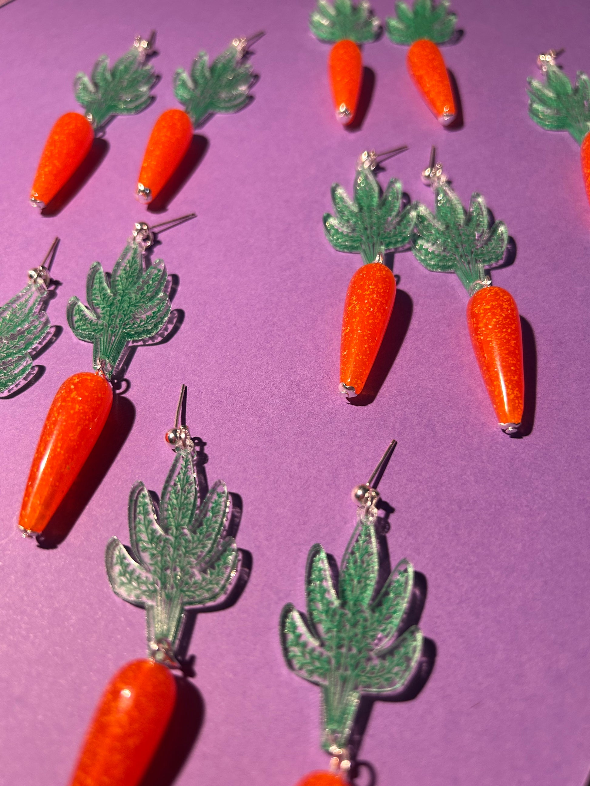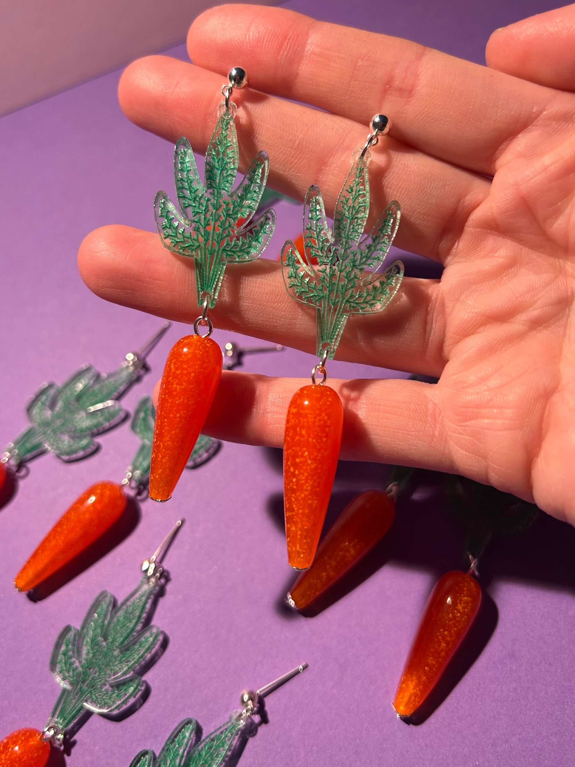I got these plastic speckled orange beads from a vintage seller and decided they looked like carrots! So I painstakingly decided an intricate leaf design and cut it on clear acrylic, filled the engraving with green acrylic and hung these on silver dot studs. They are slightly heavier due to the bead but still comfortable to wear and make a real statement!
