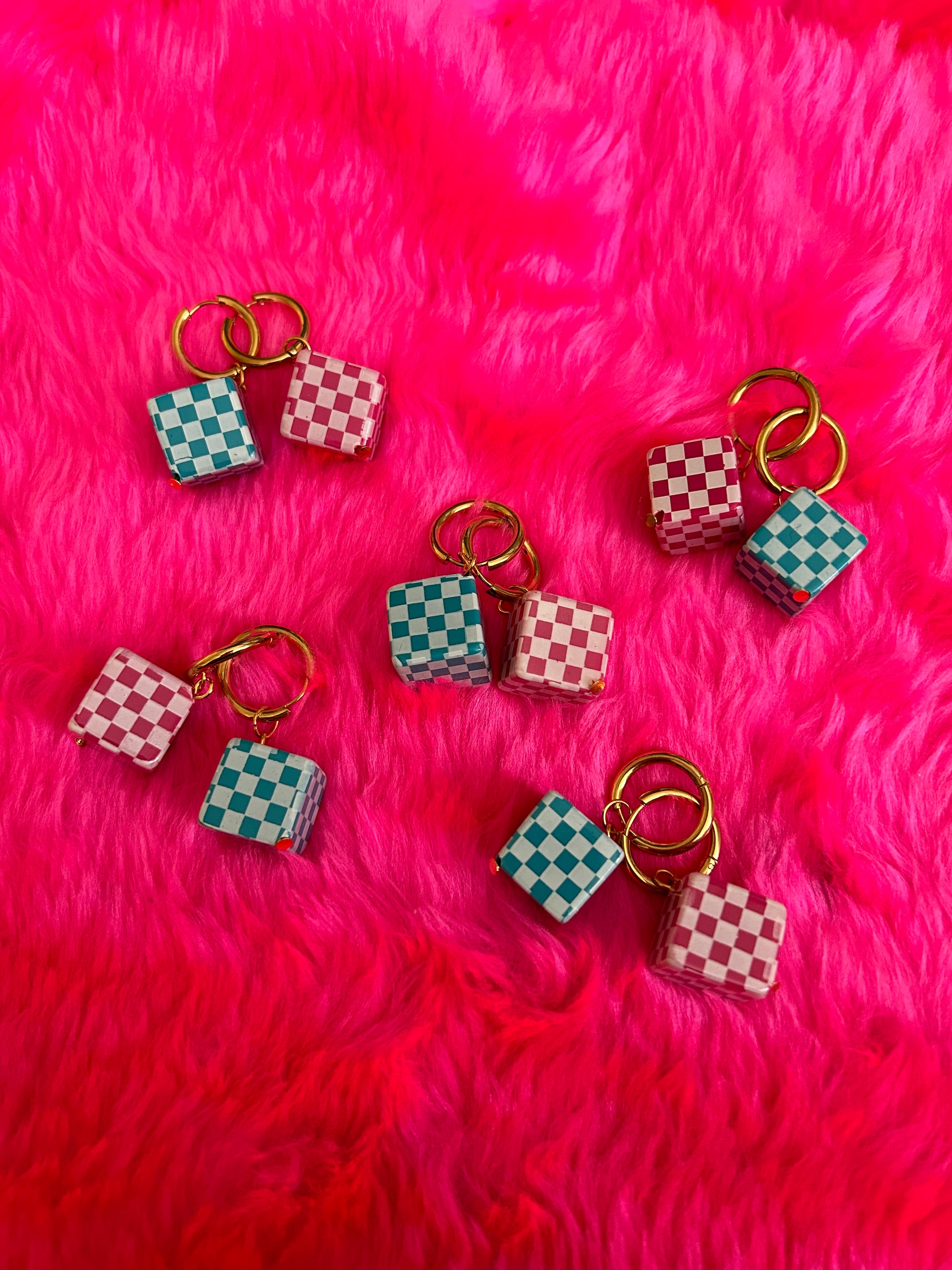 I got these chequered beads from vintage elasticated bracelets and thought they would look super cute on hoops in odd pairs. Each pair has one turquoise cube and one magenta cube. These are a little heavier than most of my pieces but they're still comfortable to wear.