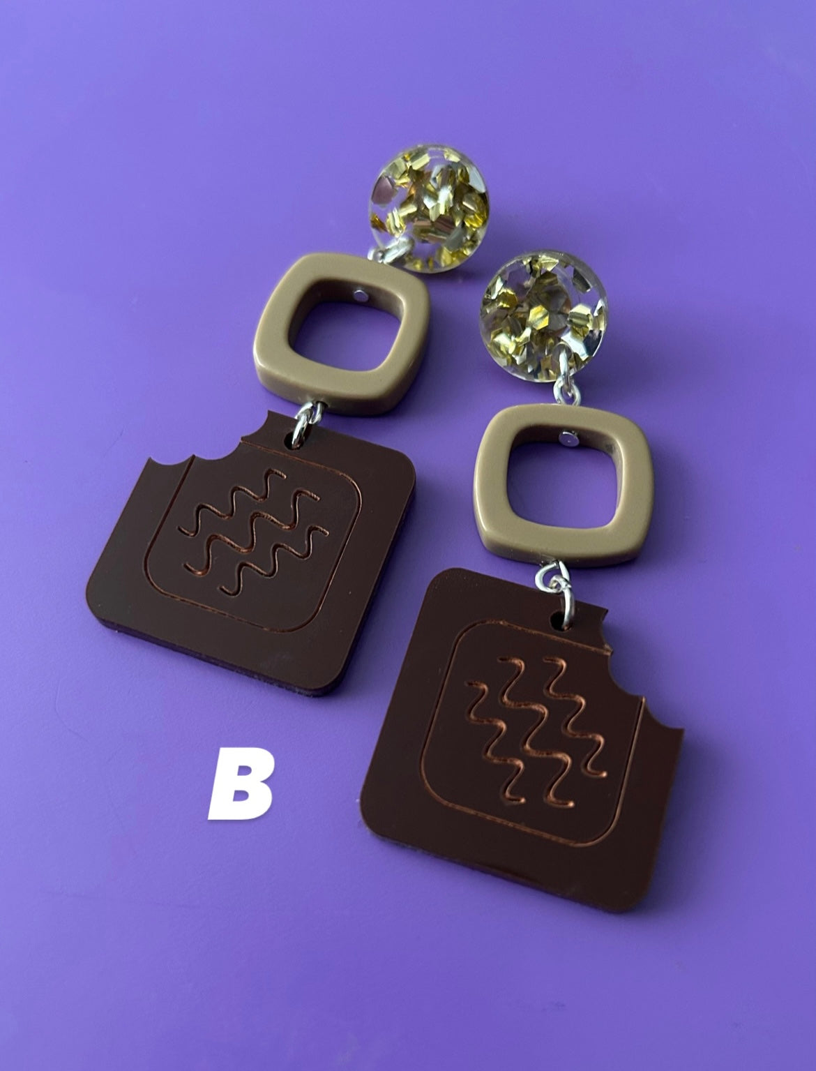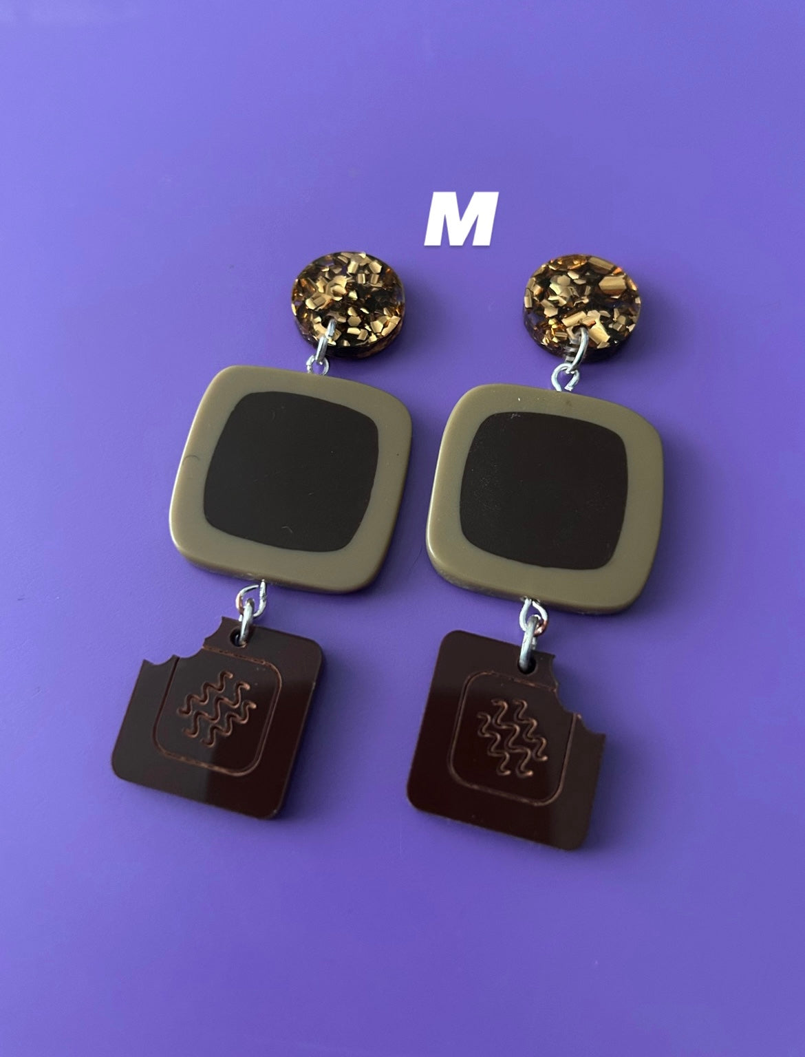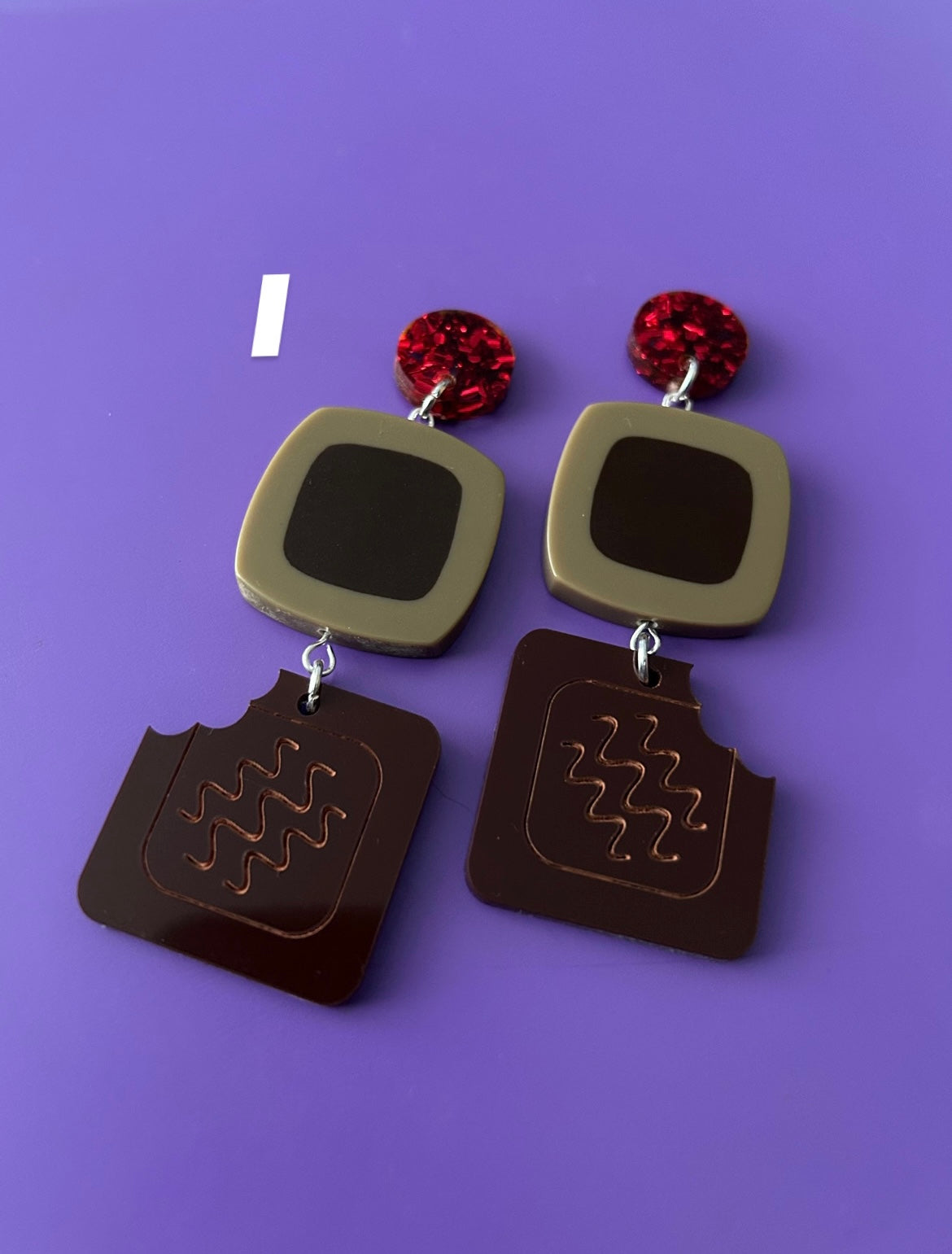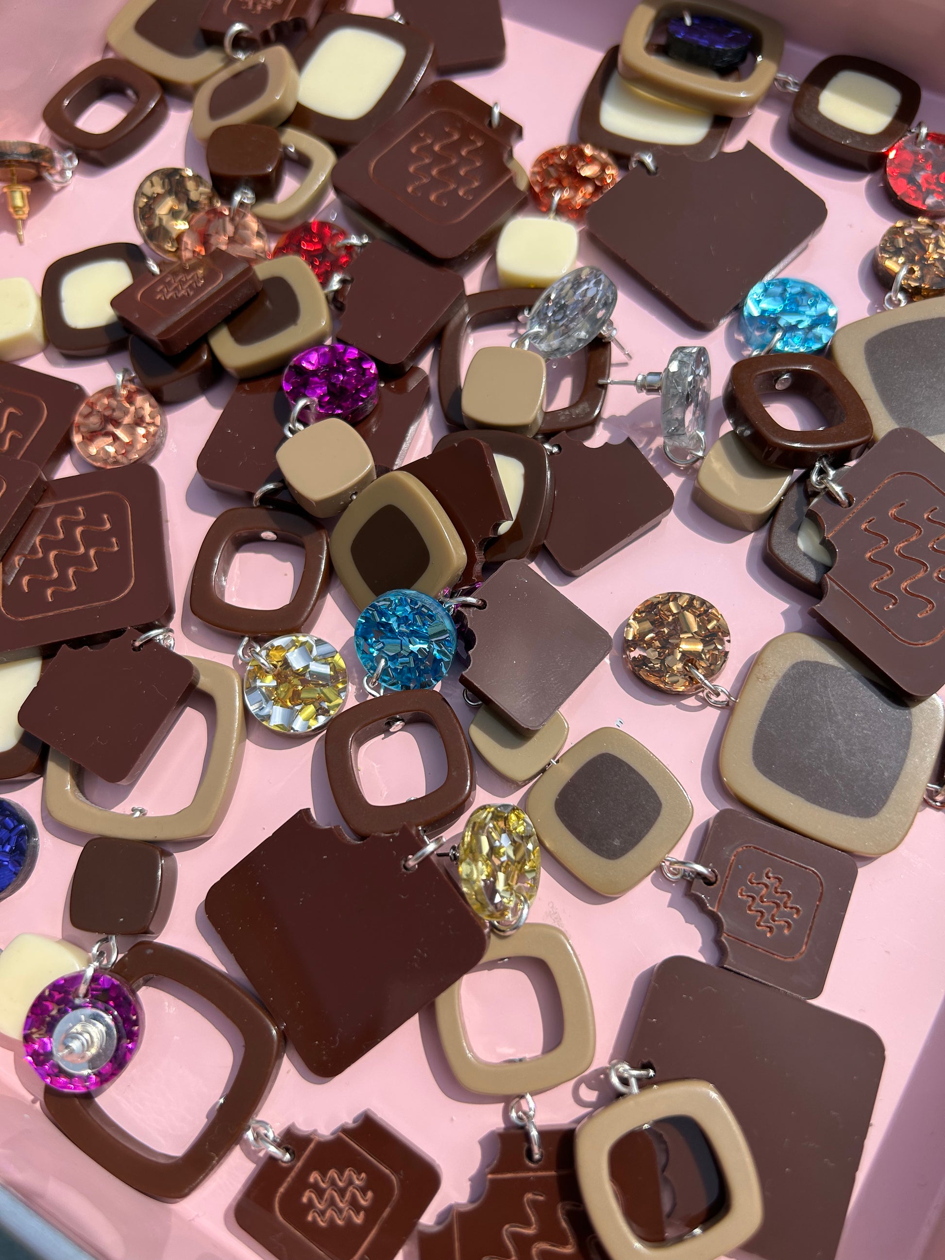 Chocolate box earrings made with chunky glitter discs, secondhand plastic beads and laser cut acrylic chocolate charms! Options are alphabetised, please see pictures.