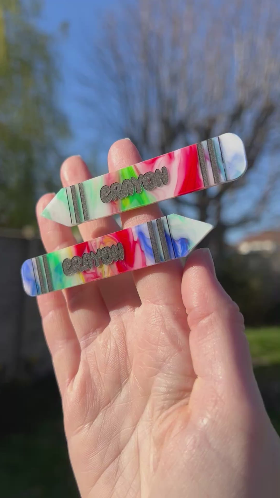 This gorgeous multi-colour swirly marbled acrylic is perfect for these engraved crayon hair slides. Sold as a pair on crocodile clip backings.