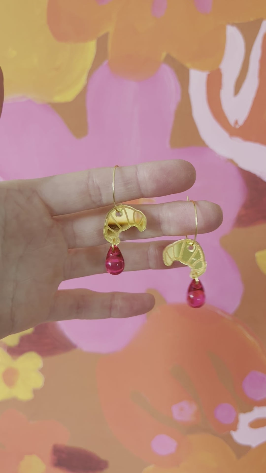 Gold mirror acrylic croissant earrings with vintage magenta pink plastic beads on thin gold metal hoops.