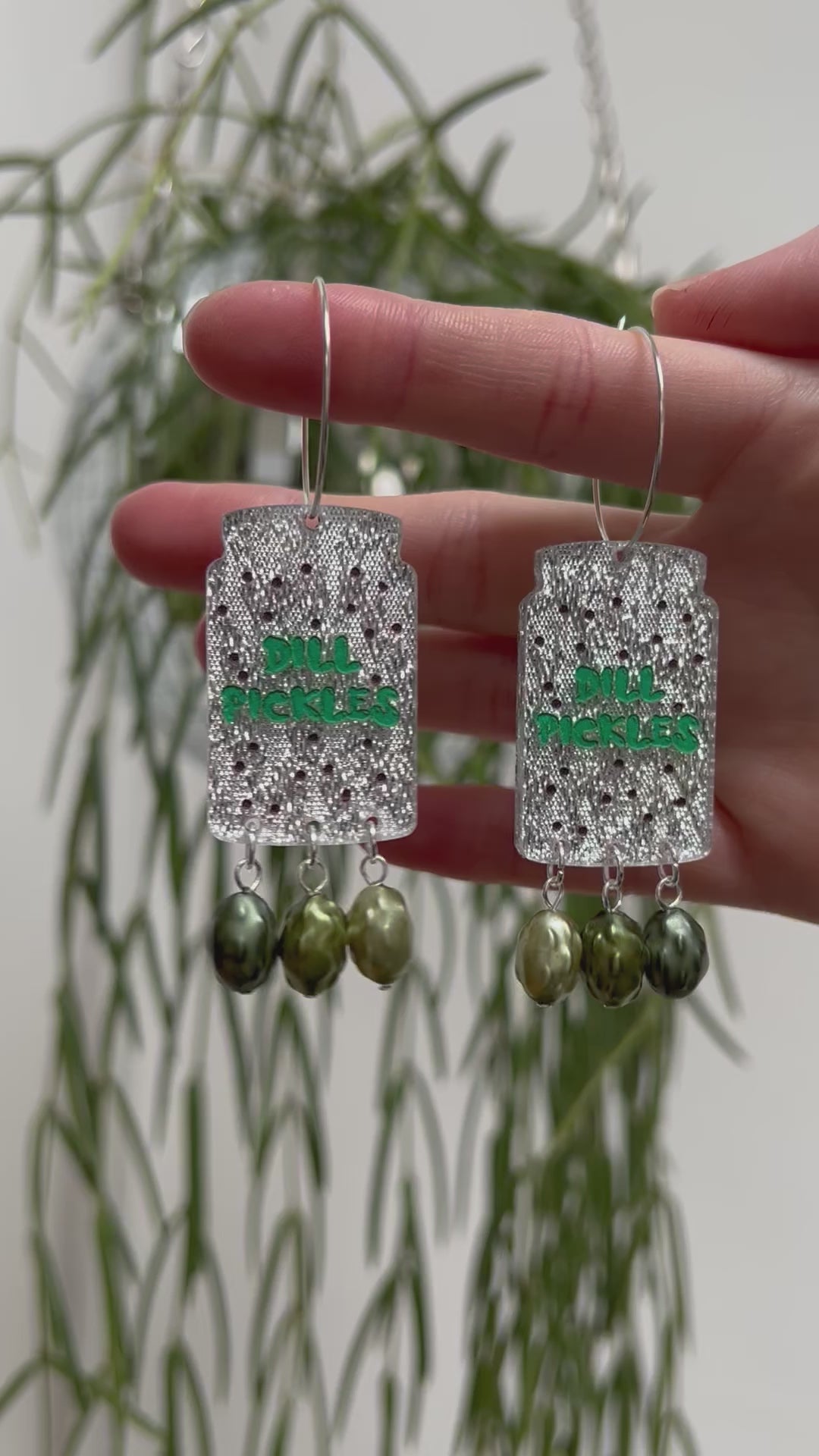 I got a vintage plastic beaded necklace in a charity shop and thought the beads looked JUST like pickles! I designed and cut pickle jar earrings engraved with peppercorns and 'DILL PICKLES' on the front. These are strung on thin metal hoops and they're adorable!