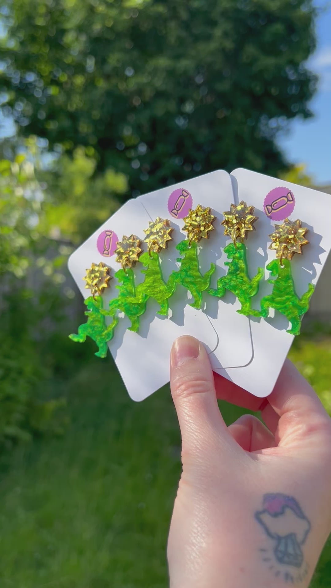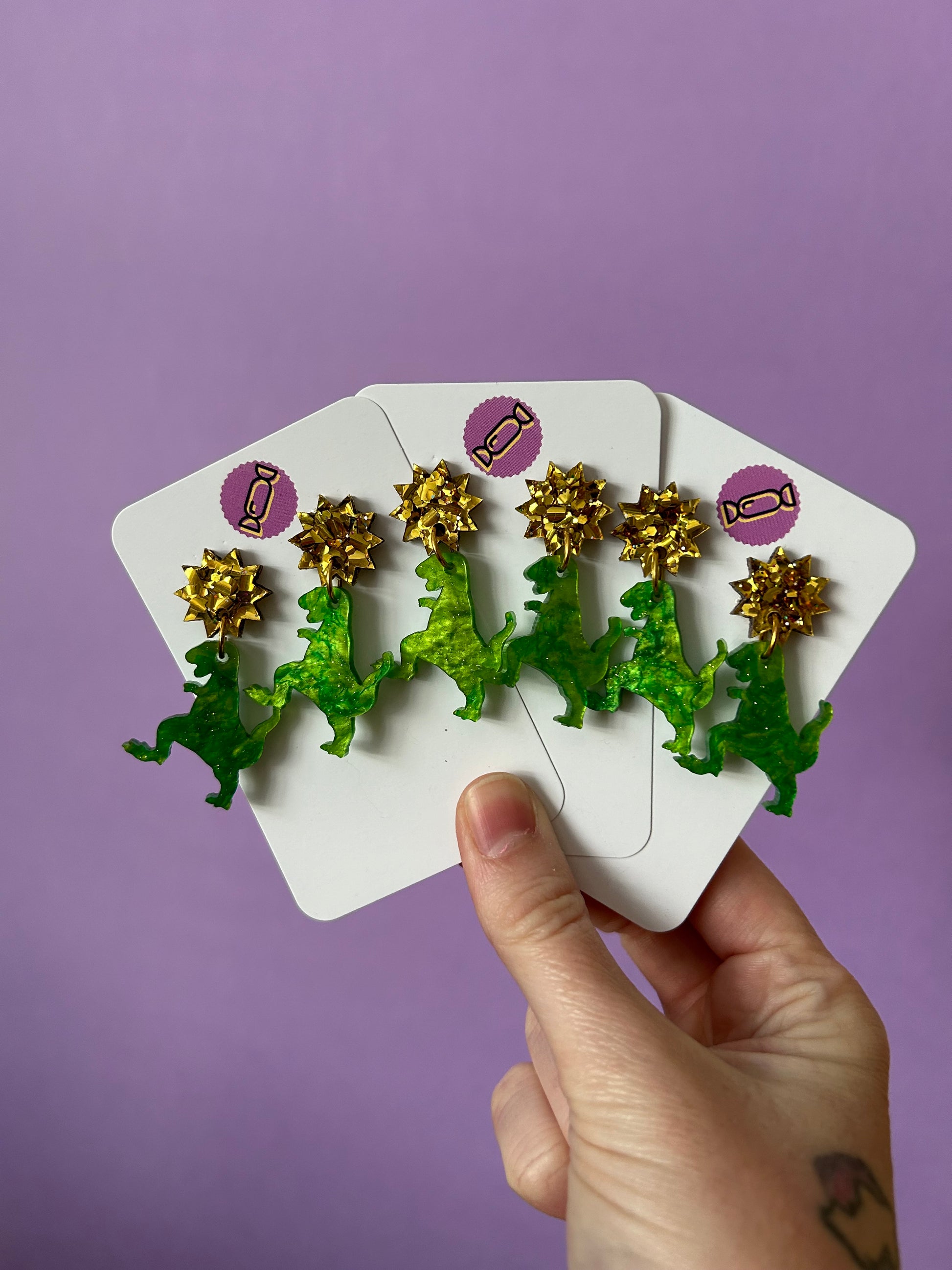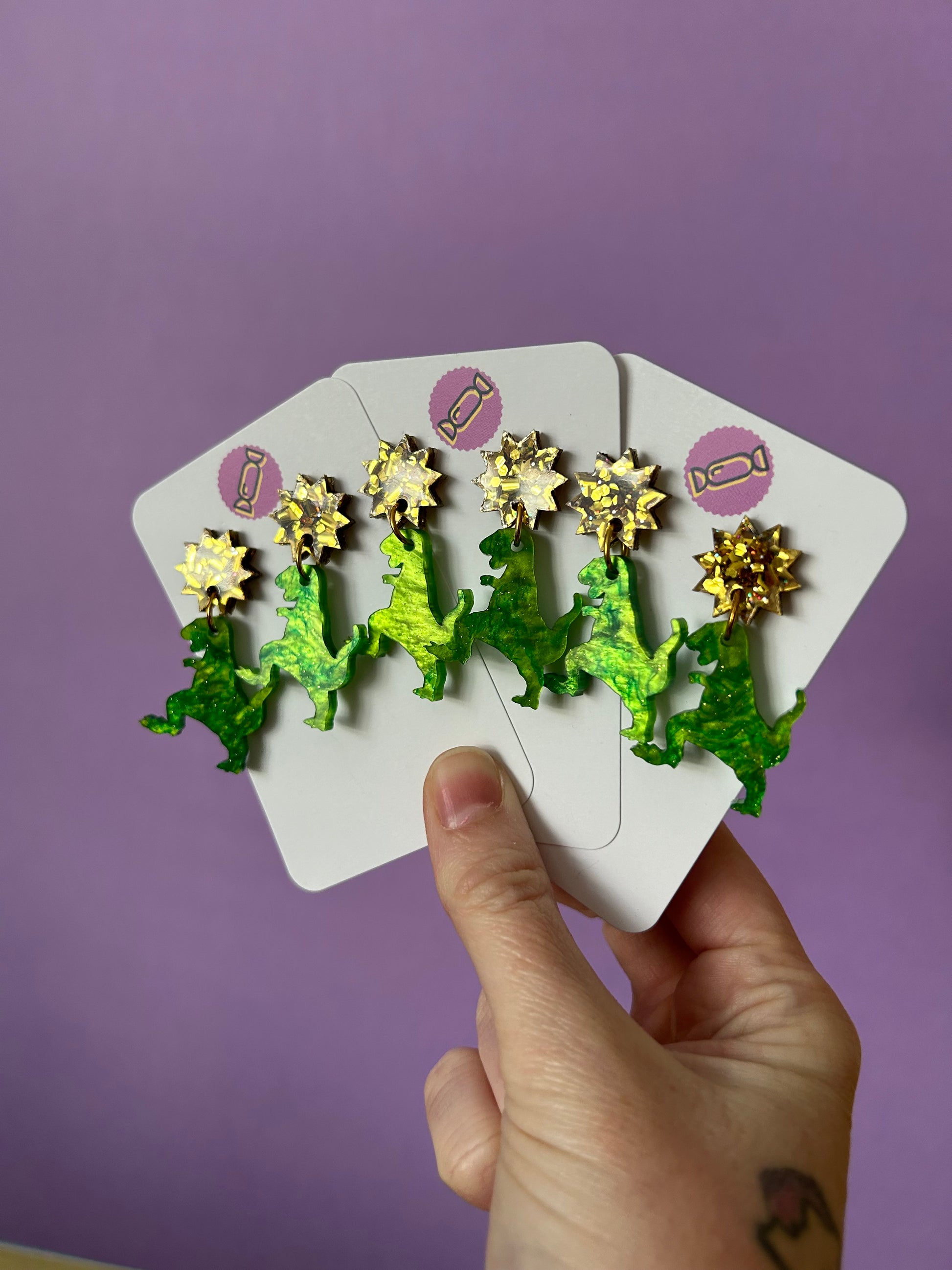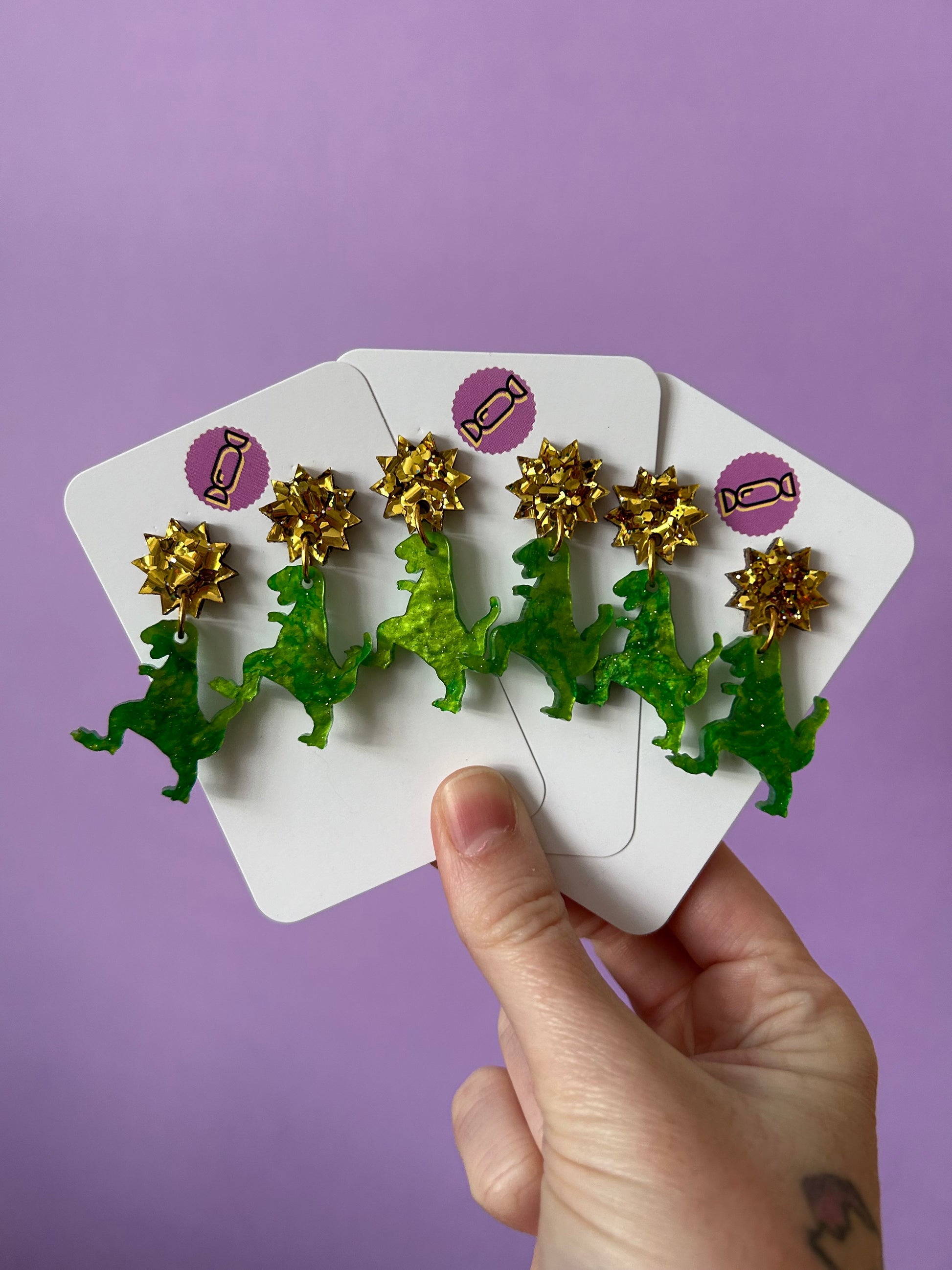 These little green marbled dinosaurs suspended from chunky gold glitter acrylic starbursts are super cute, lightweight and fun :) Another fab pocket money pick!