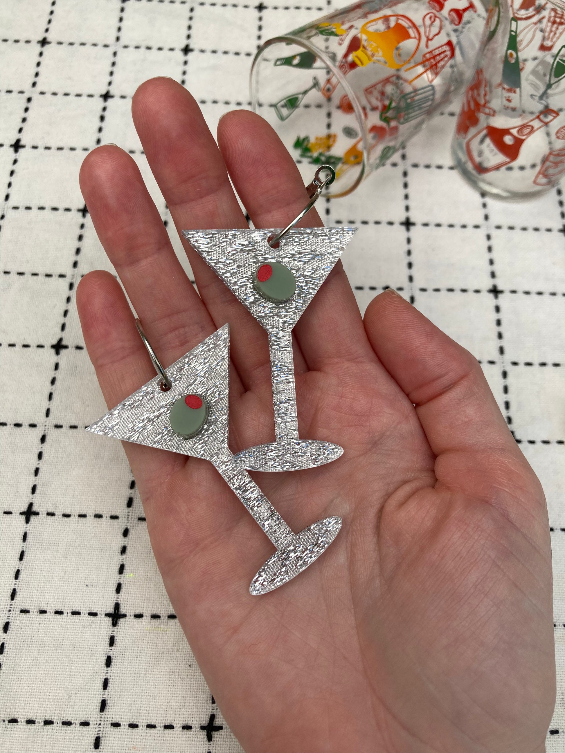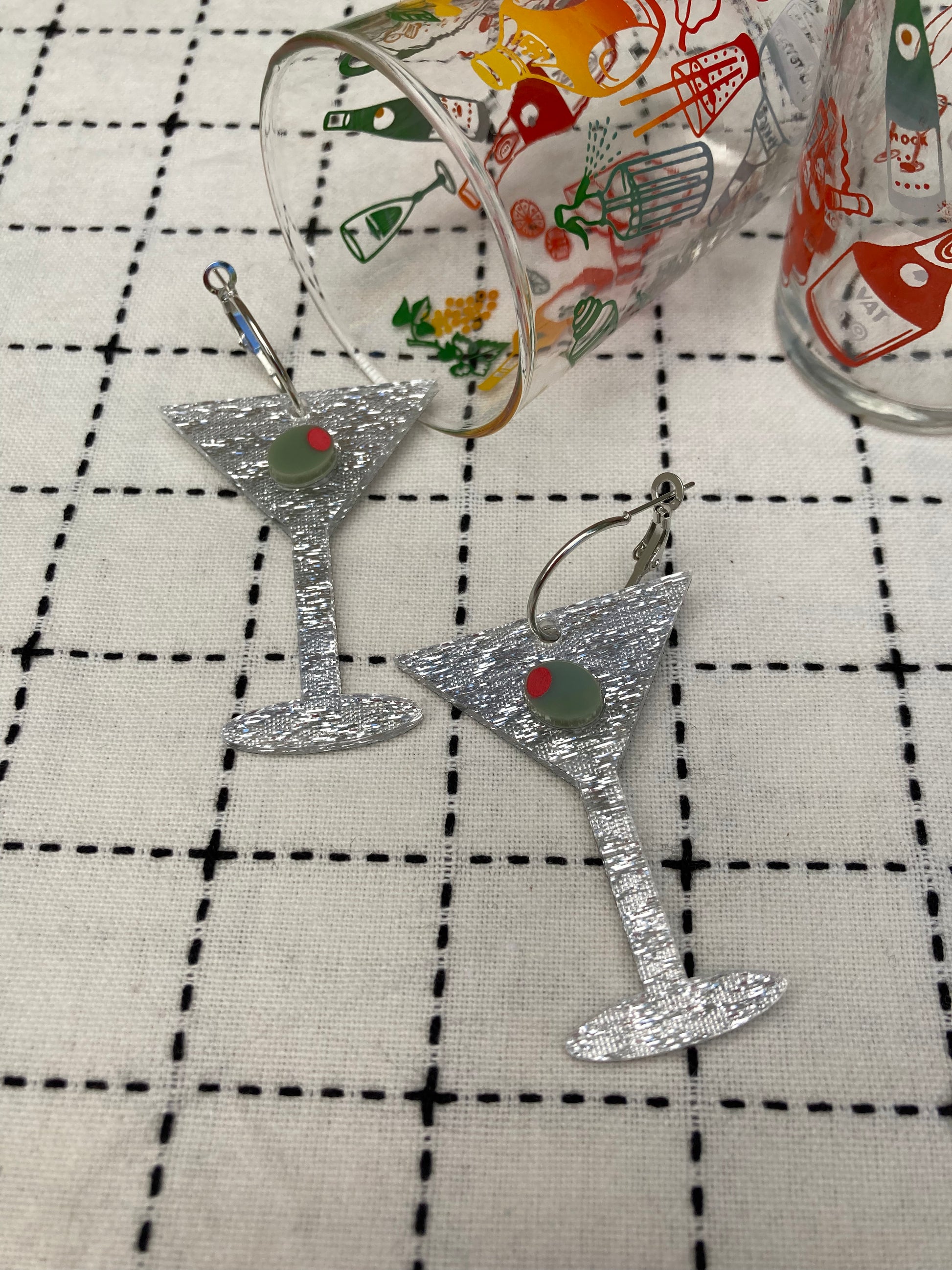 How dirty do you like your Martinis? Silver fabric acrylic martini glasses featuring mini stuffed olives suspended on silver metal hoops. They are pictured alongside the Cocktail Chimp Earrings.