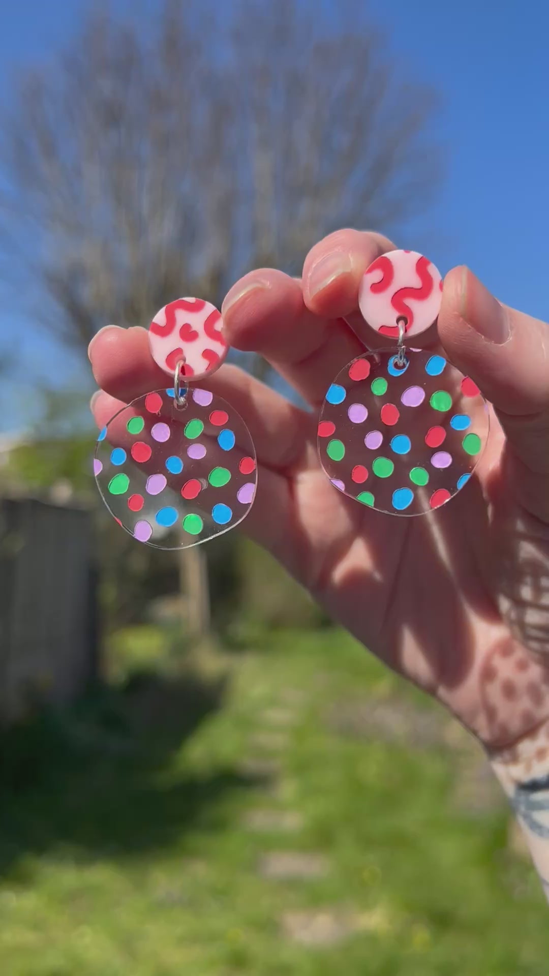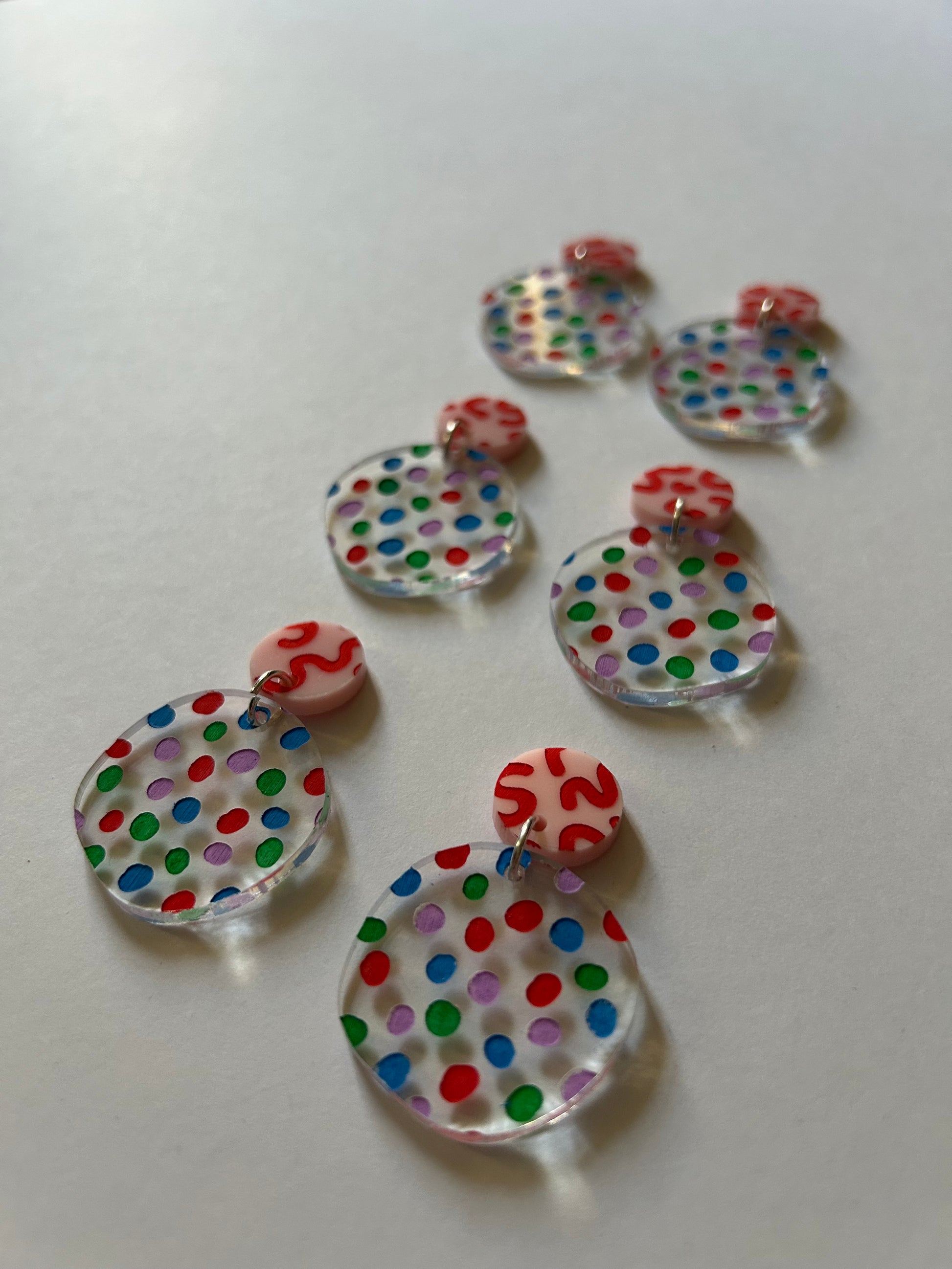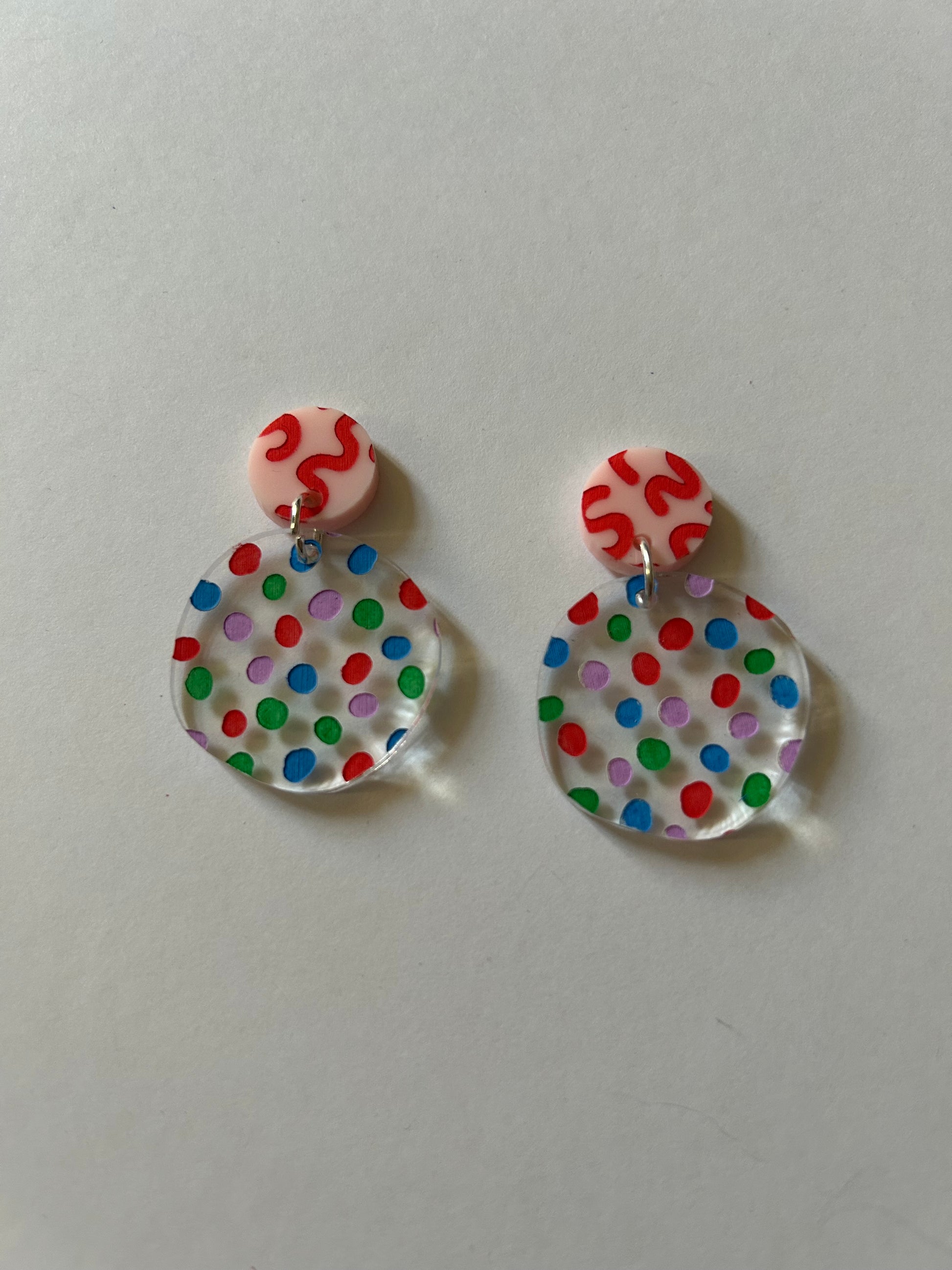 Pale pink discs engraved with red squiggles and clear acrylic charms engraved with lilac, blue, green and red dots! These are cute, lightweight and the perfect party accessory.