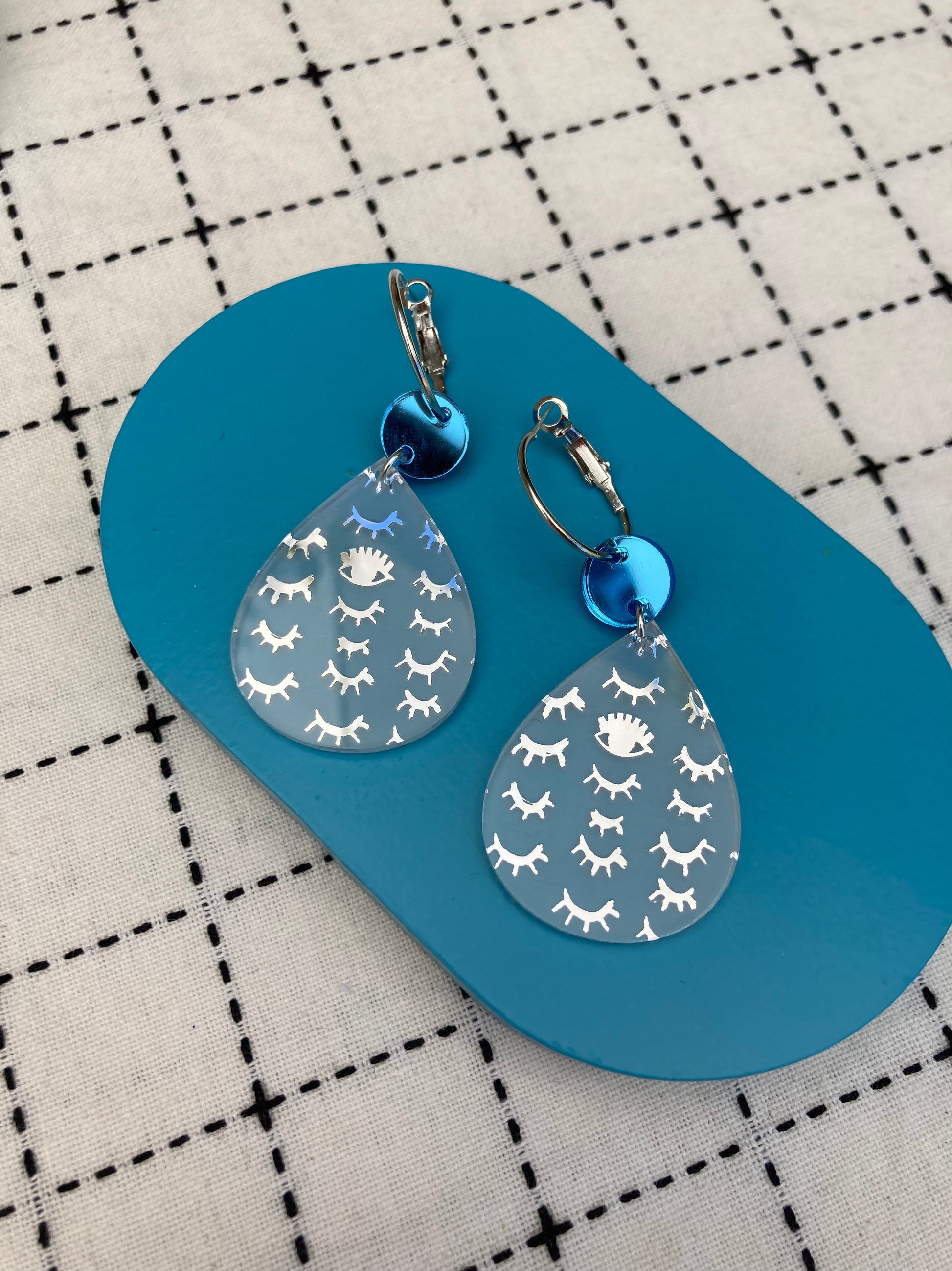 These earrings feature engraved eyelash silver mirror teardrops suspended from light blue mirror discs and silver metal hoops.