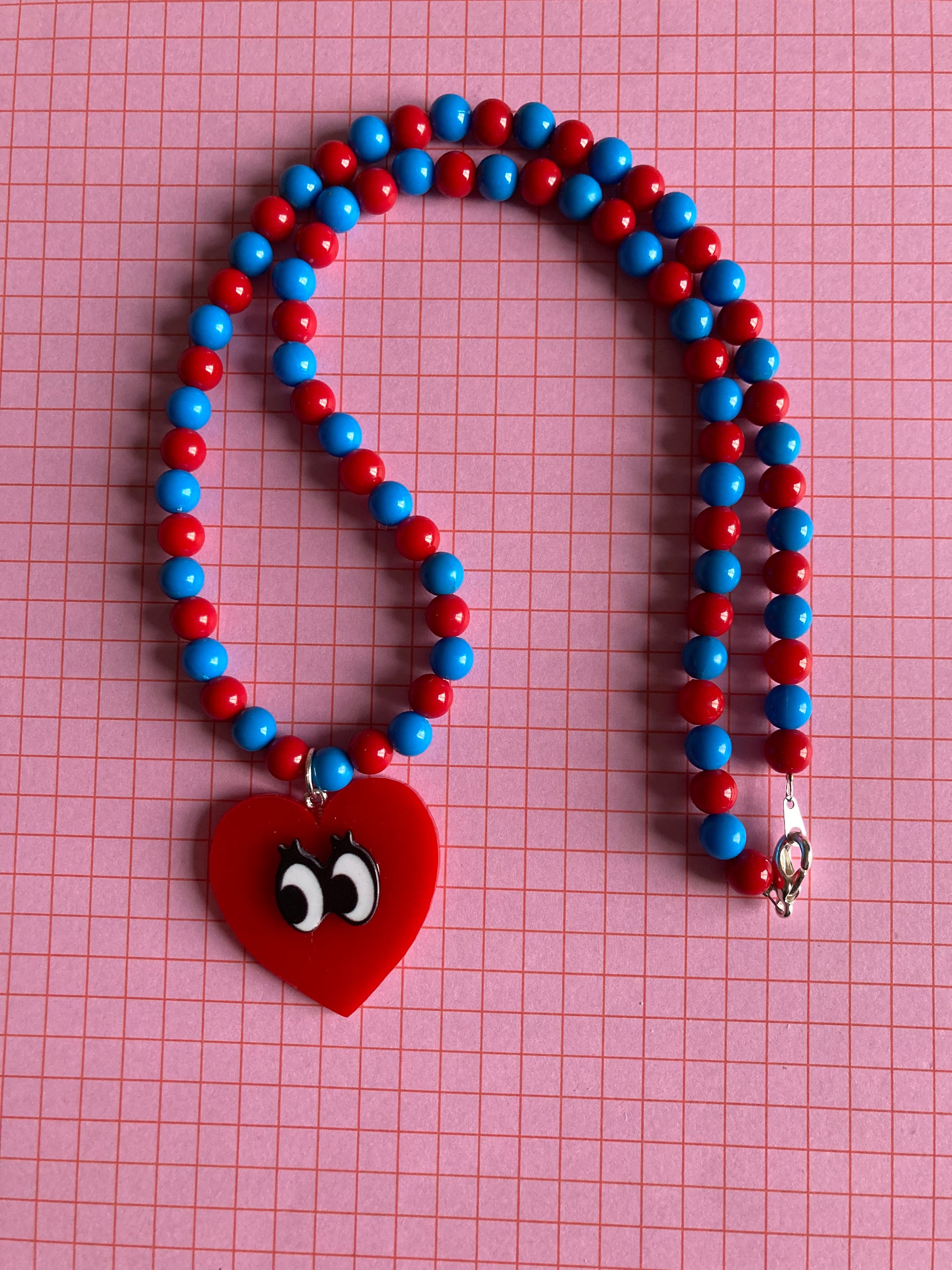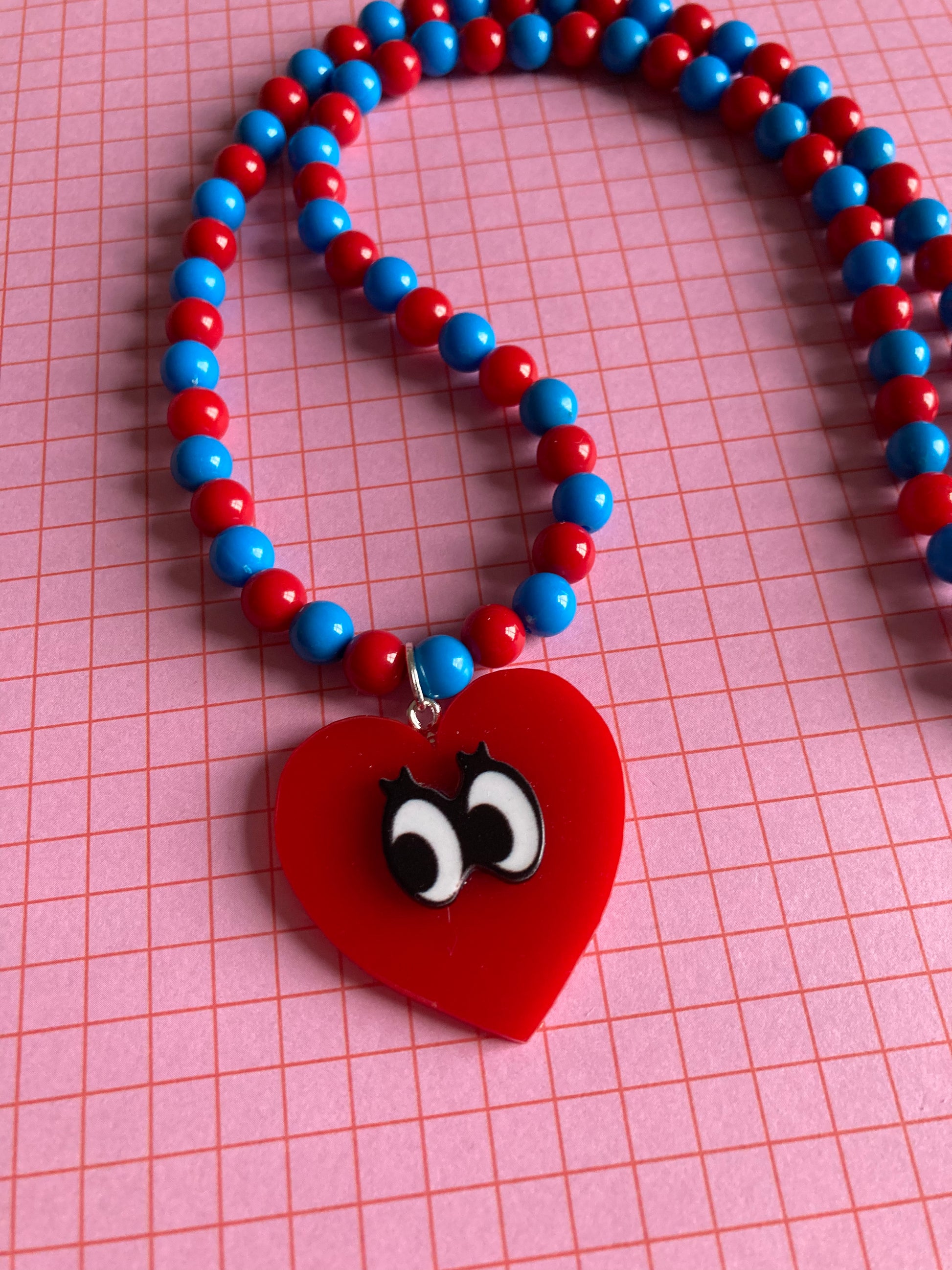 These cuties are made from laser cut acrylic hearts with cartoon eyes strung on wire with plastic beads and a lobster clasp.