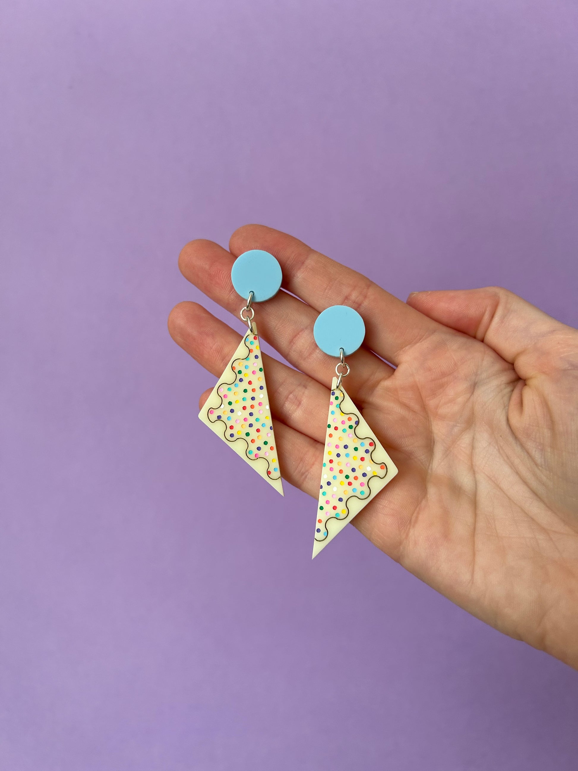 After spending time in Australia visiting family and seeing the sights I was inspired to make some cute acrylic goodies! The ultimate Aussie snack is of course fairy bread - made using hundreds & thousands which have been created in these earrings by engraving and painting lots of little dots. There are nine different options for the top stud colour for these earrings too! The choice is yours :)
