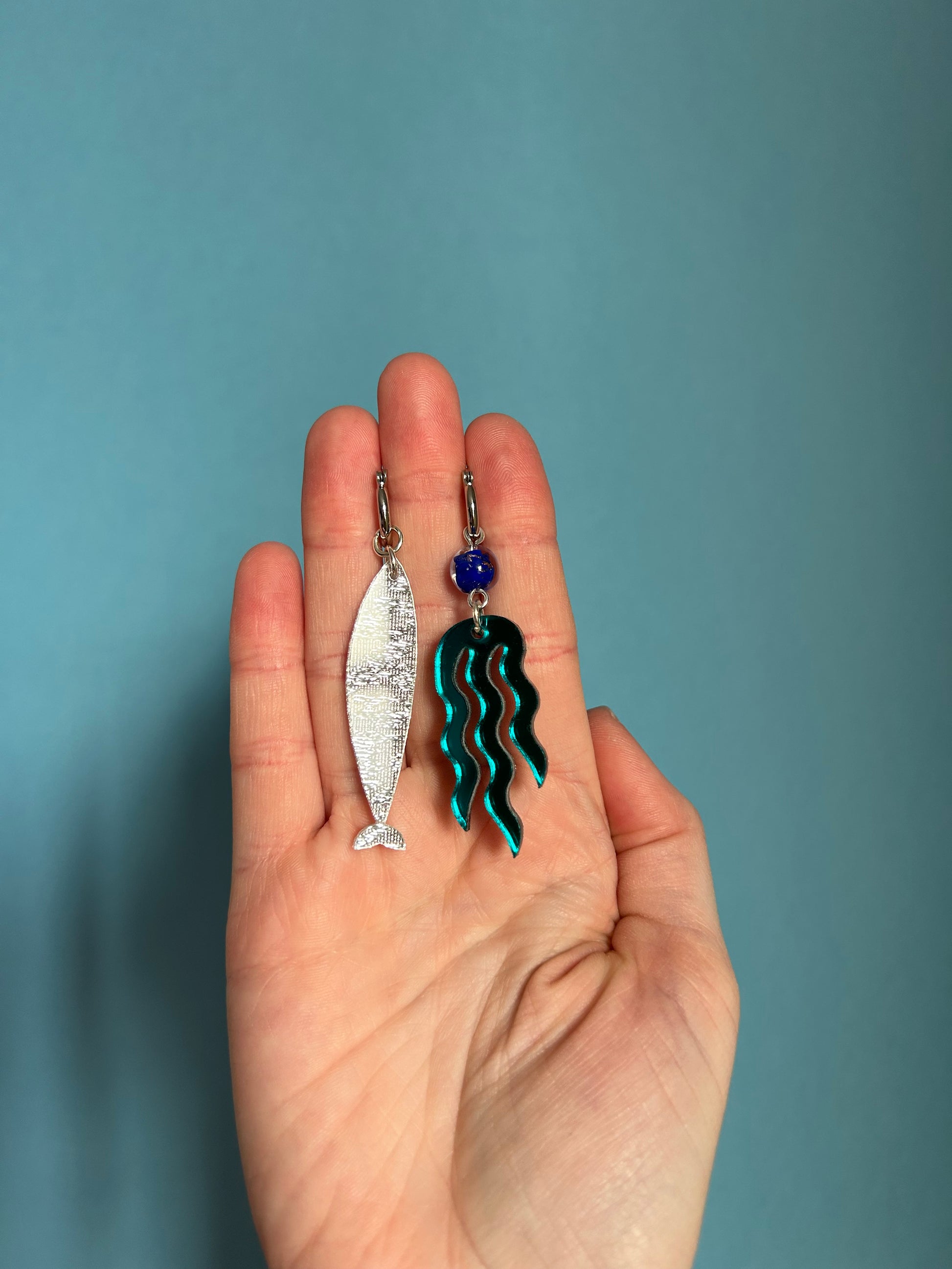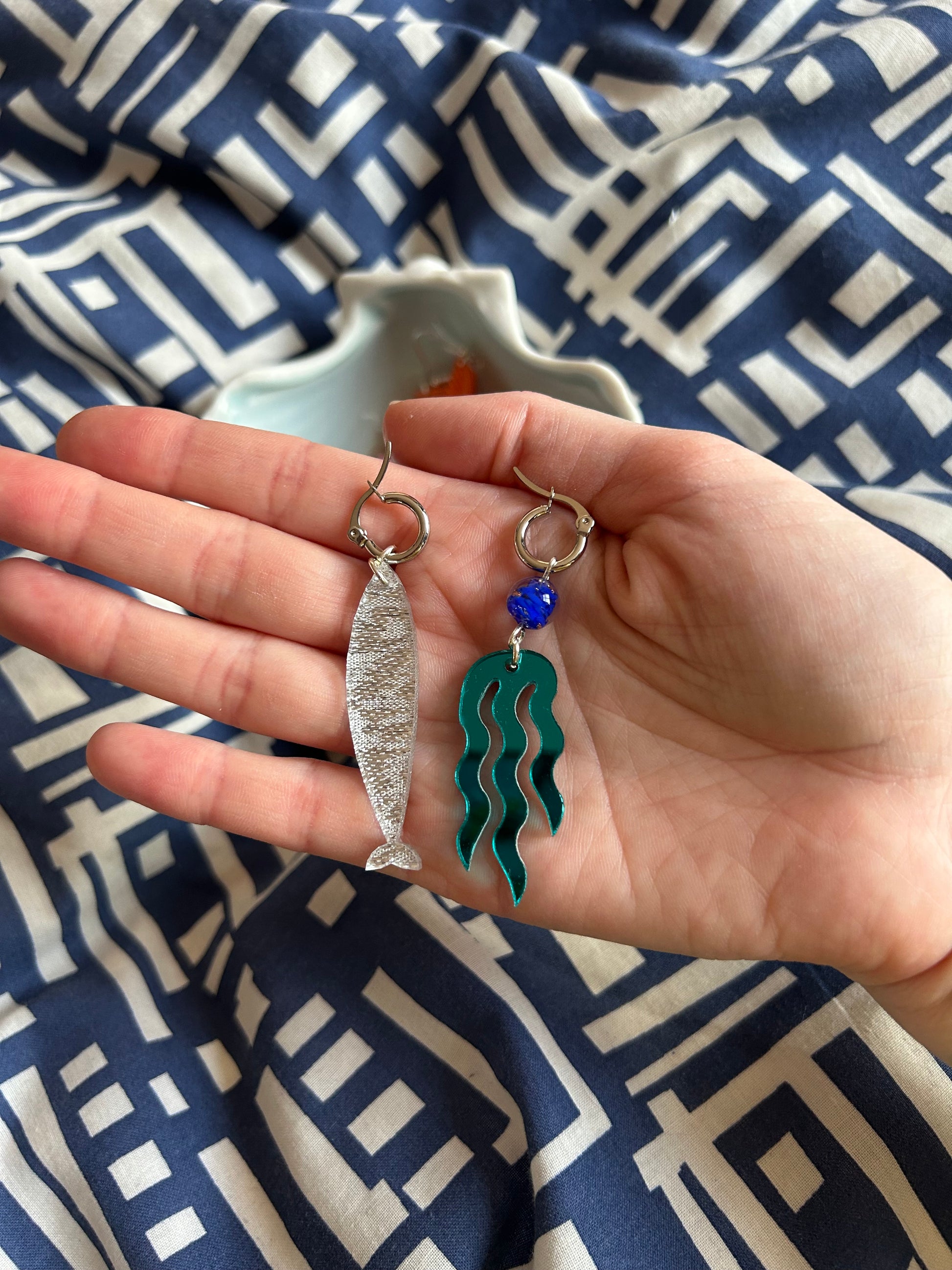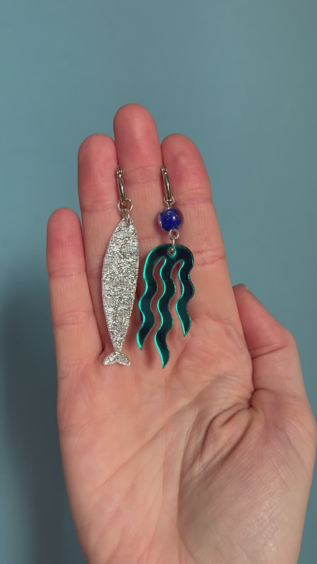 I love these little fishes made from silver fabric acrylic so I added teal mirror acrylic seaweed charms with vintage blue glass beads. They are hung on silver metal hoops. Each pair contains 1 fish charm and 1 seaweed charm for a Mediterranean twist!