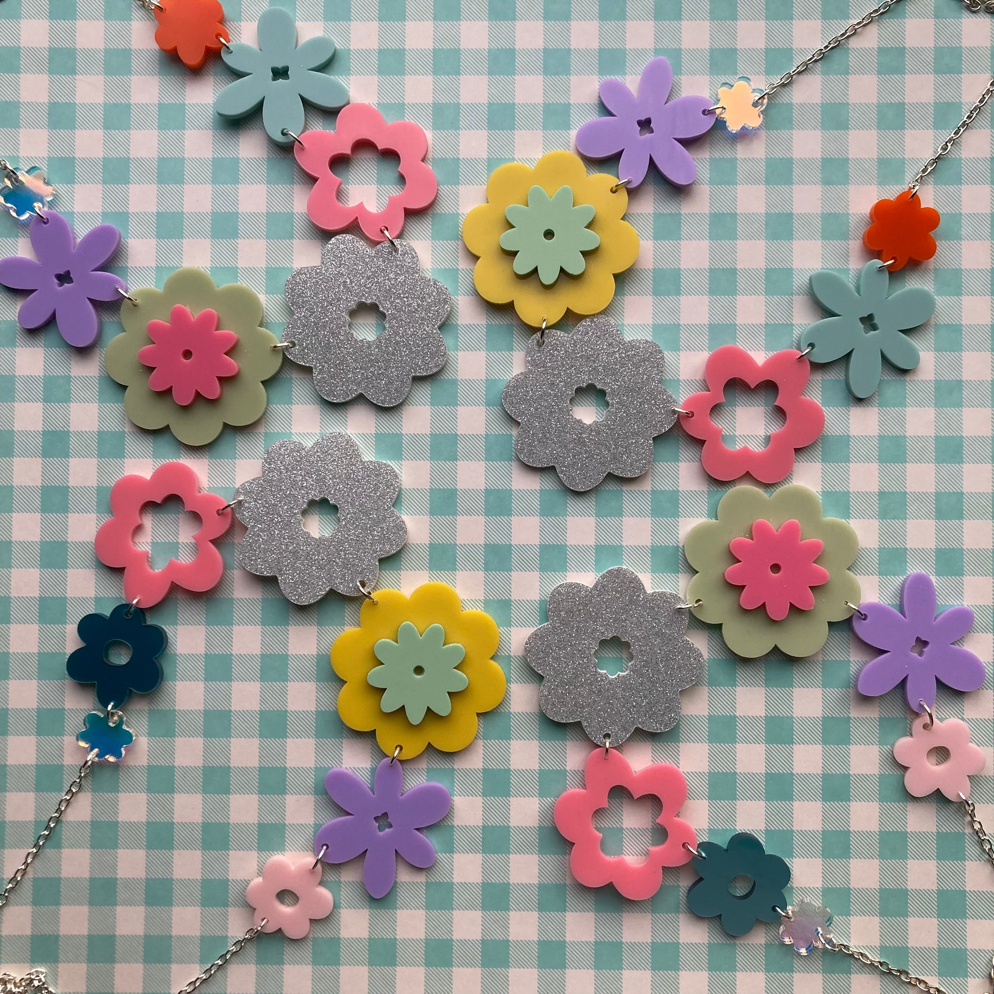 I made these necklaces from compiling a random mix of floral shapes in matte, opaque and glitter acrylic. All on a silver metal chain. Necklace will be chosen randomly unless a specific one is requested.