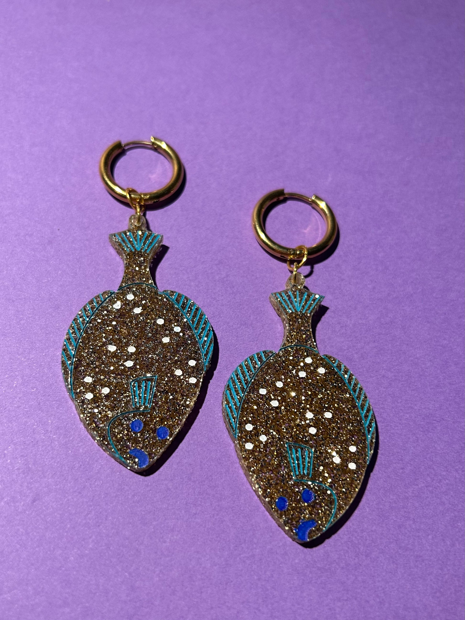 These flounder fish earrings are inspired by Rudy, a Bob's Burgers character. He has a stuffed flounder toy called Pancake. THese earrings are made from gold glitter acrylic, engraved and filled with acrylic paint and hung on chunky gold metal hoops.