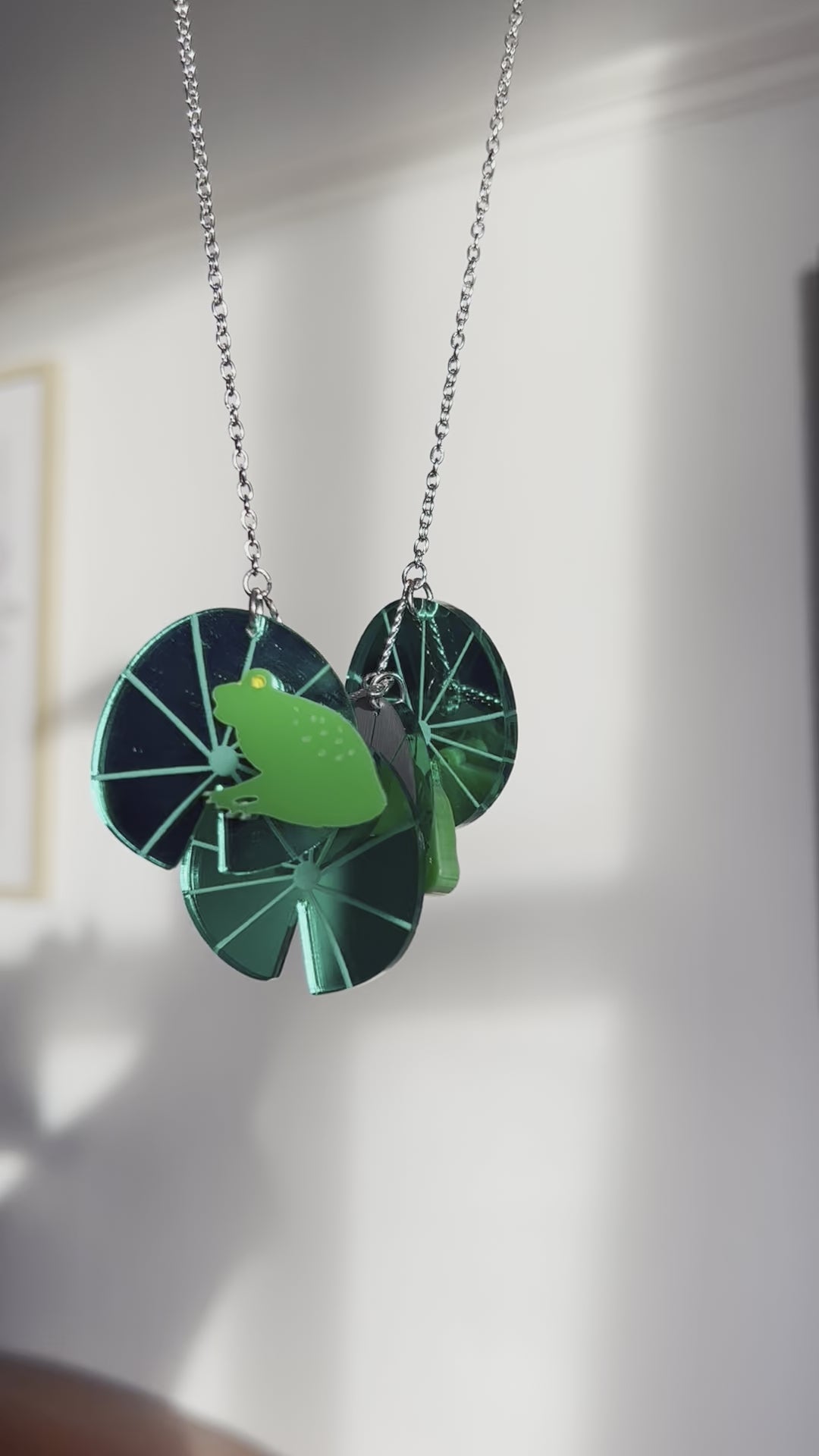 Green mirror lily pads with green acrylic frogs on a silver plated chain. Each lily pad is separated by a twisted silver bar. They hang in a layered manner also.