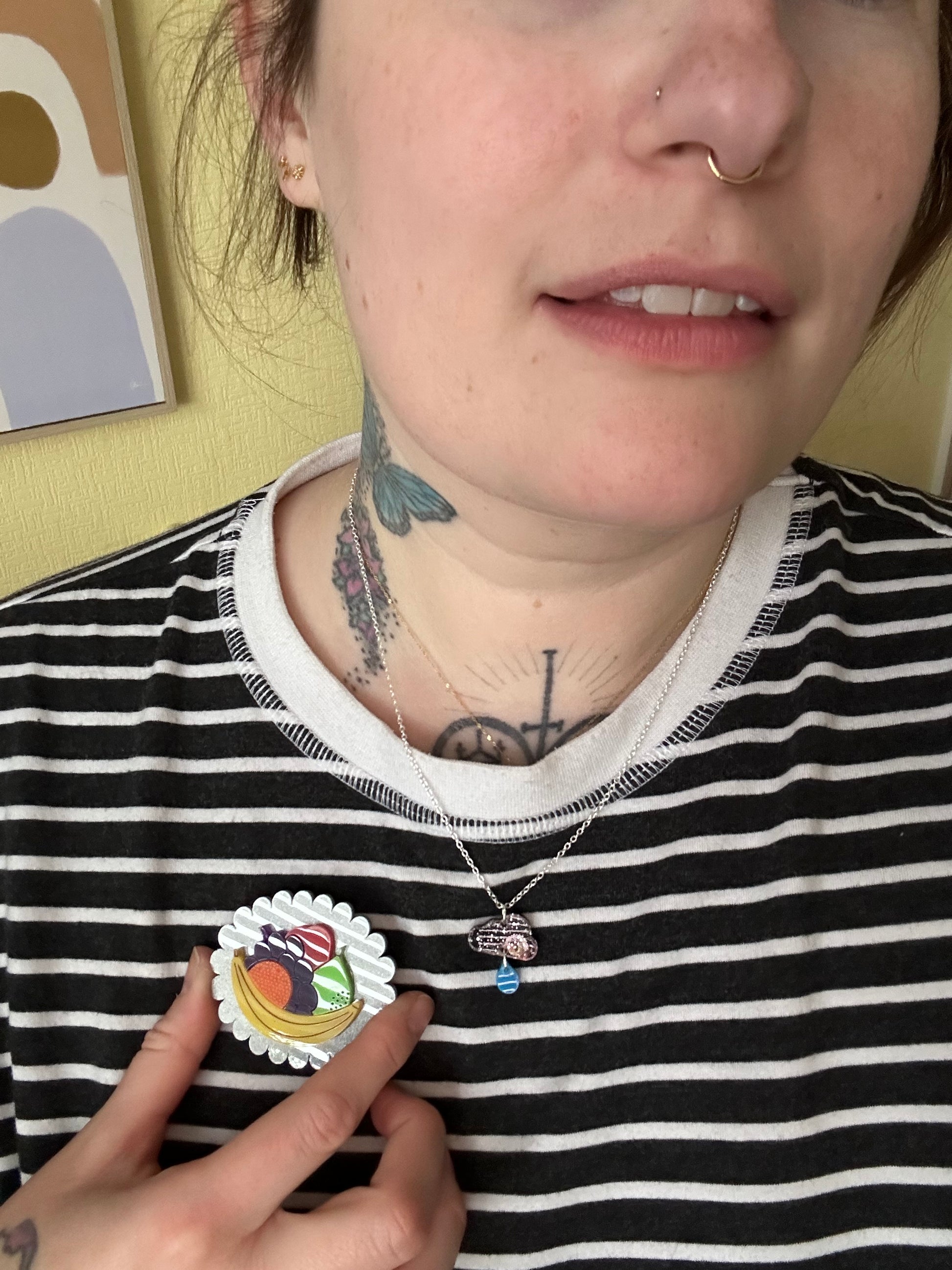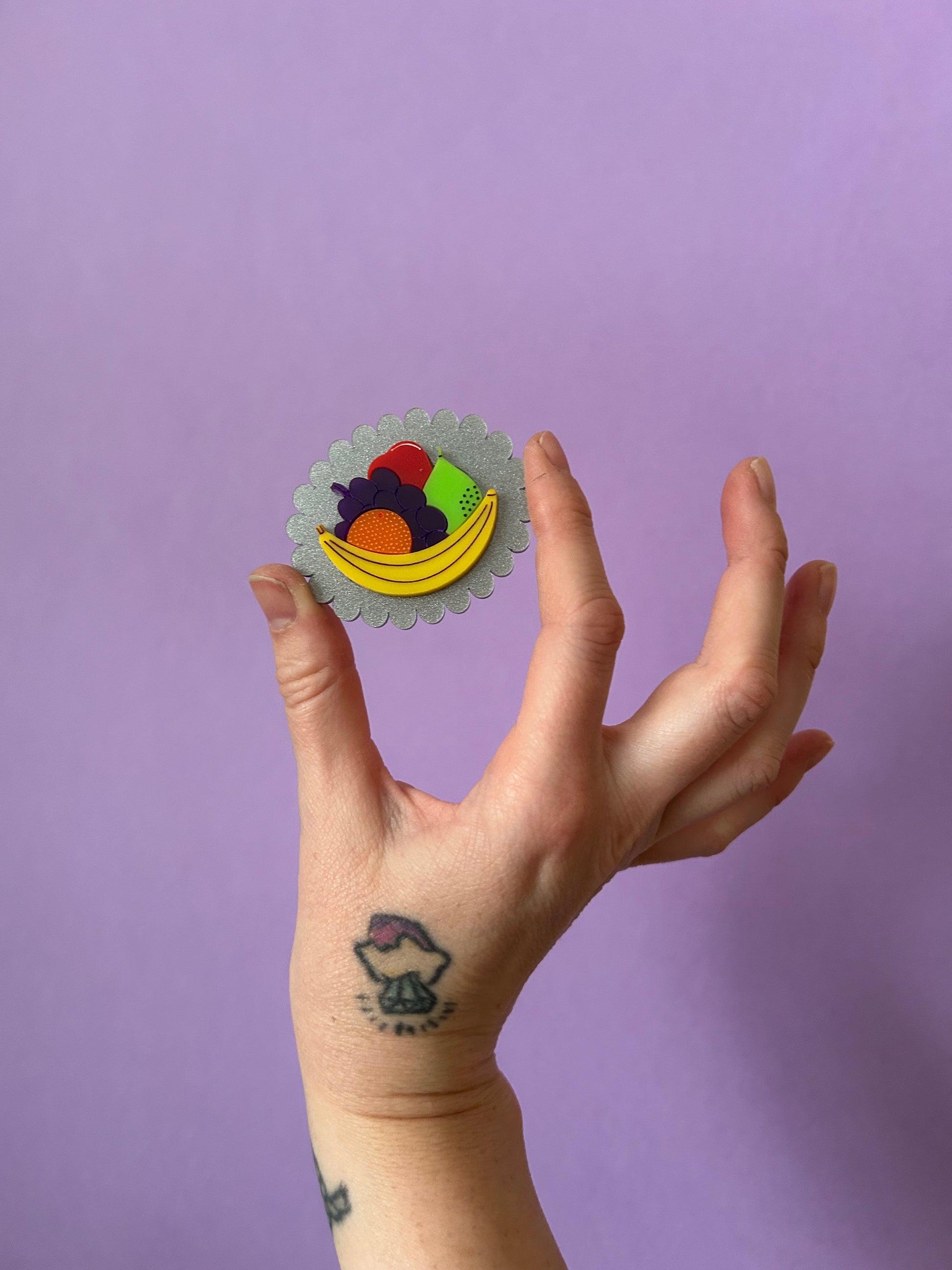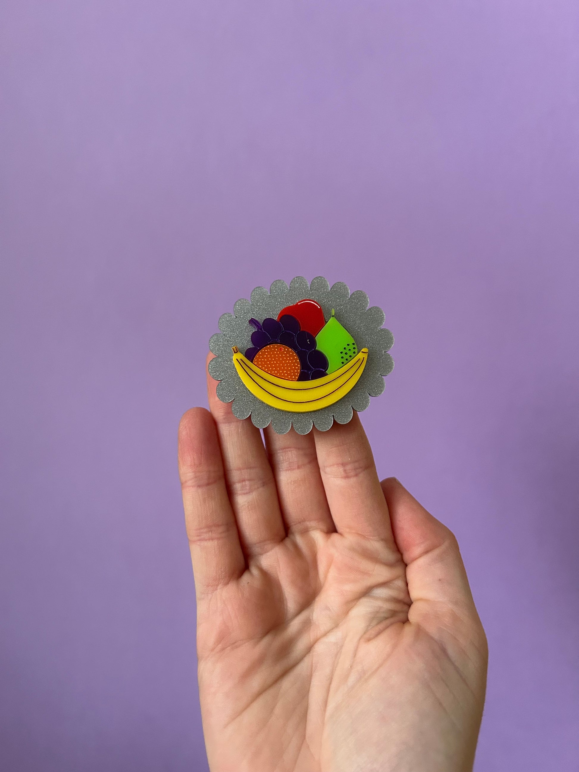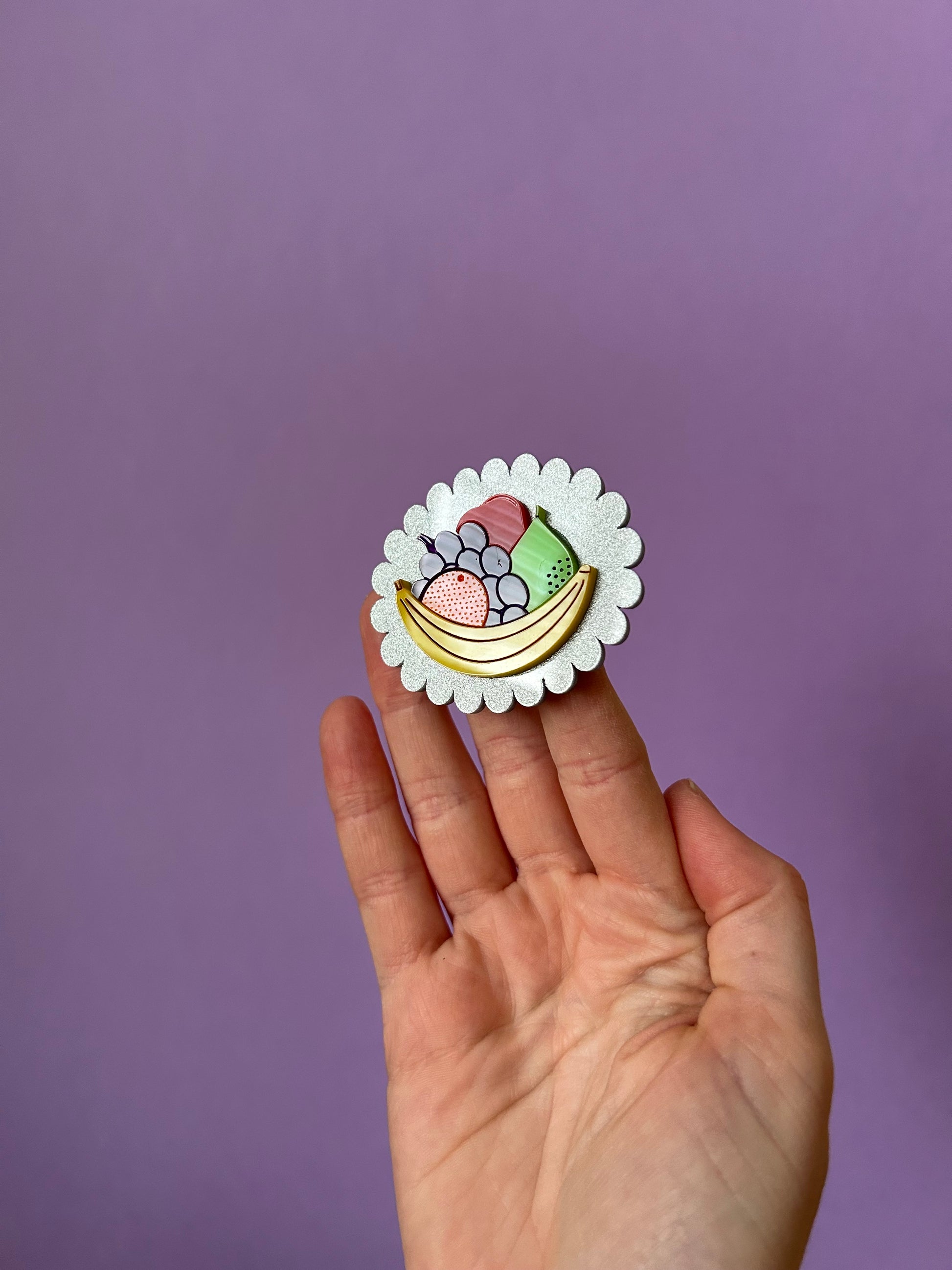 Frilly silver shimmery silver acrylic brooch with laser cut fruits including banana, grapes, apple, orange and pear.