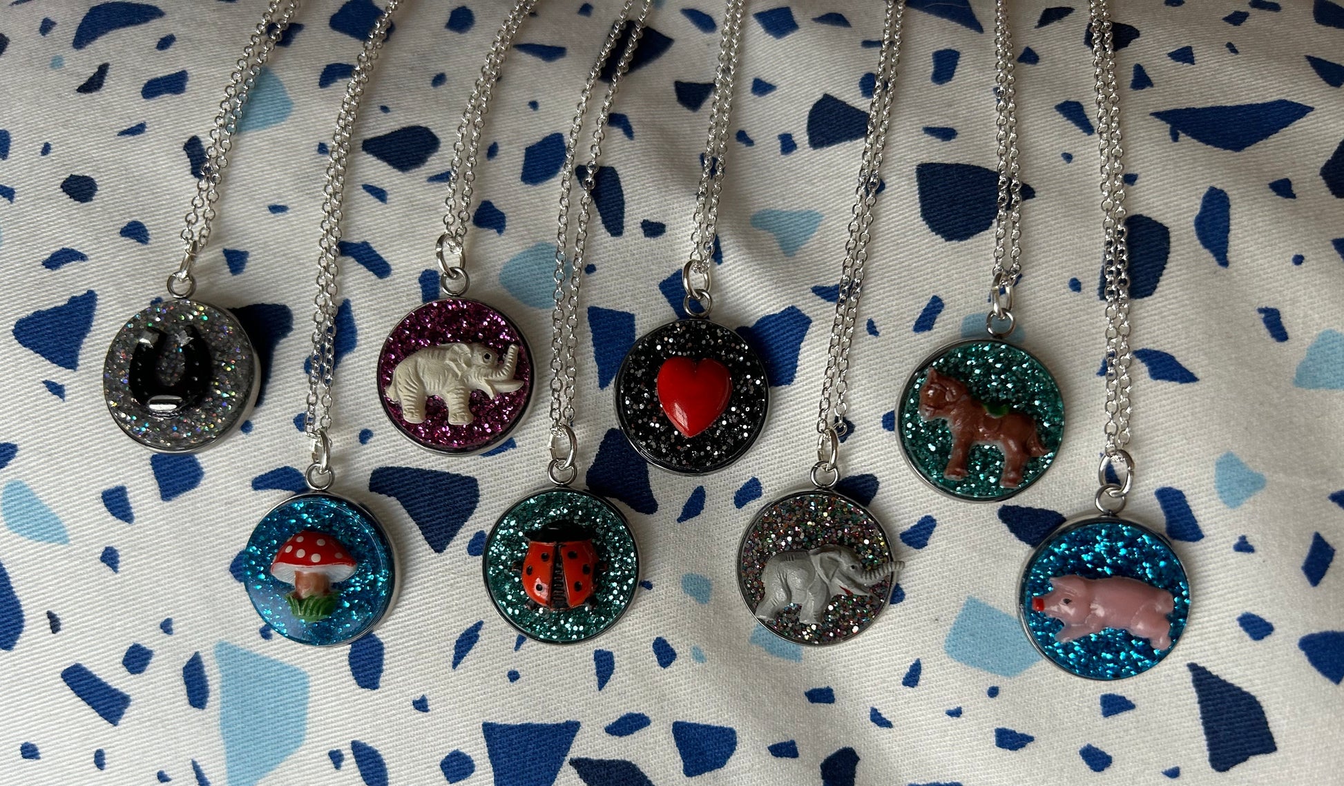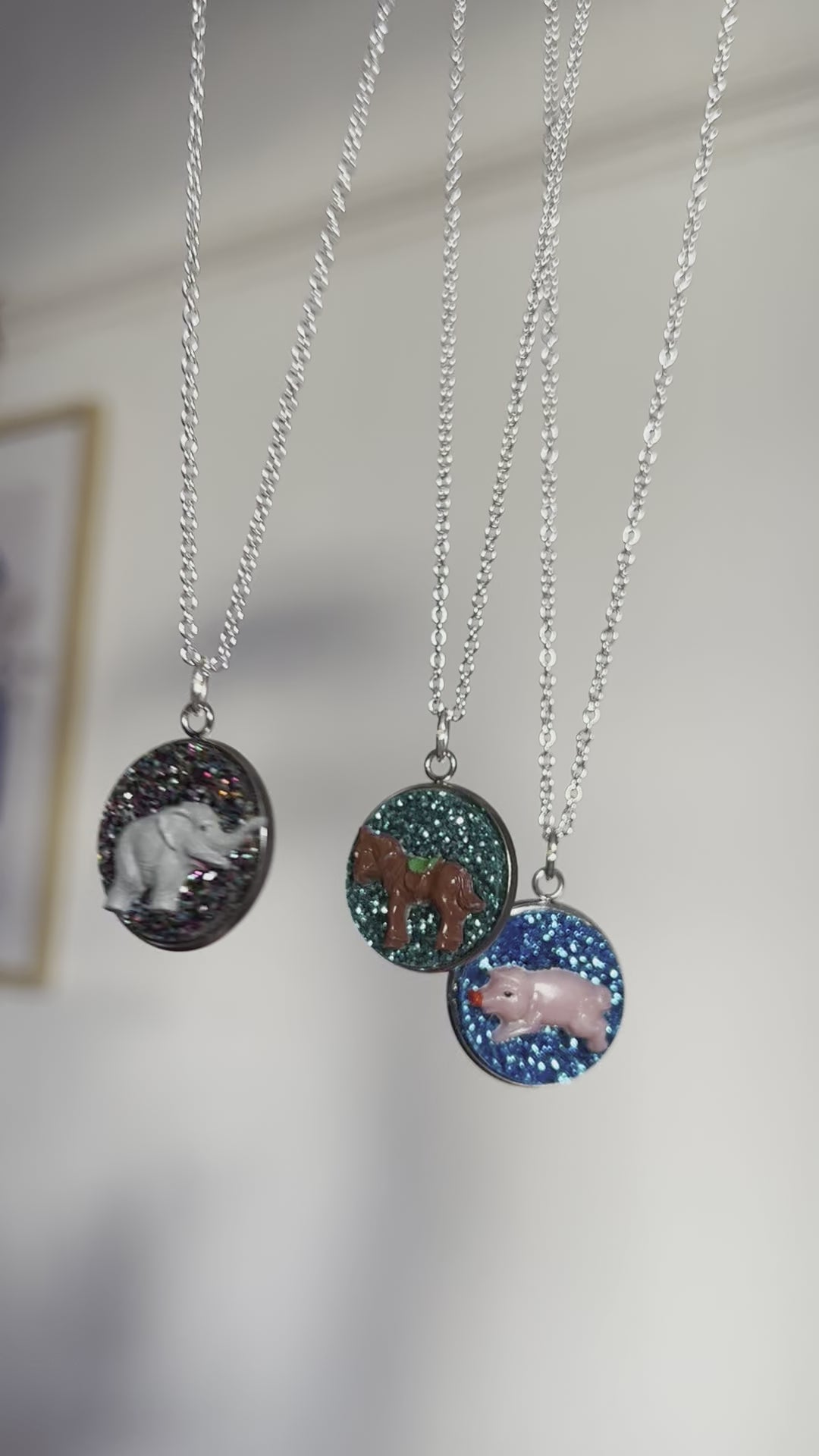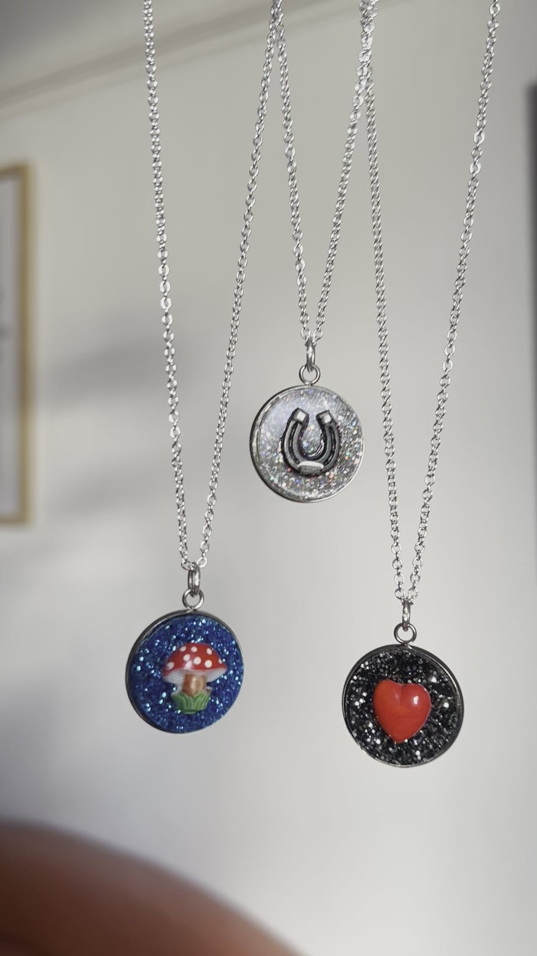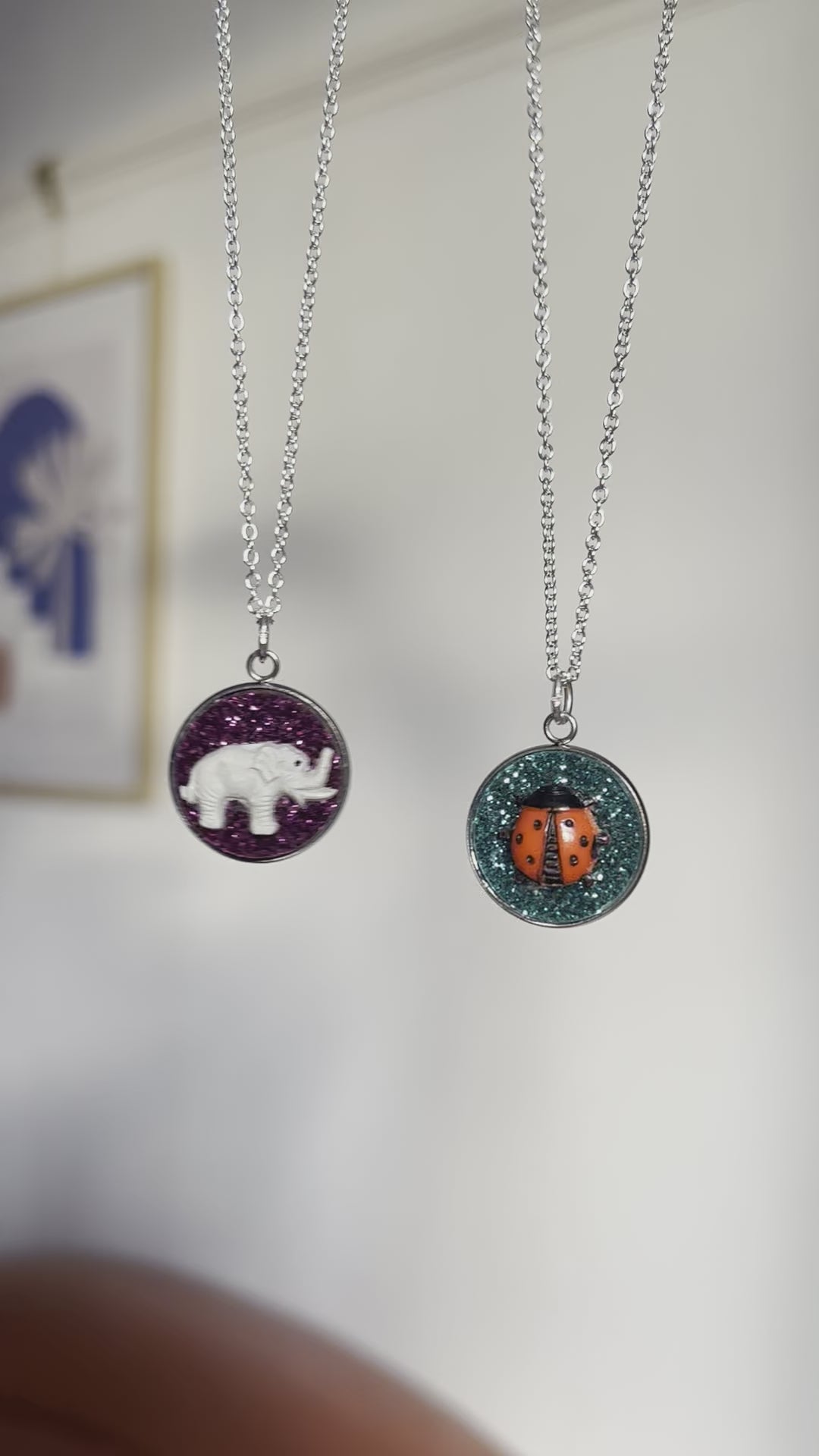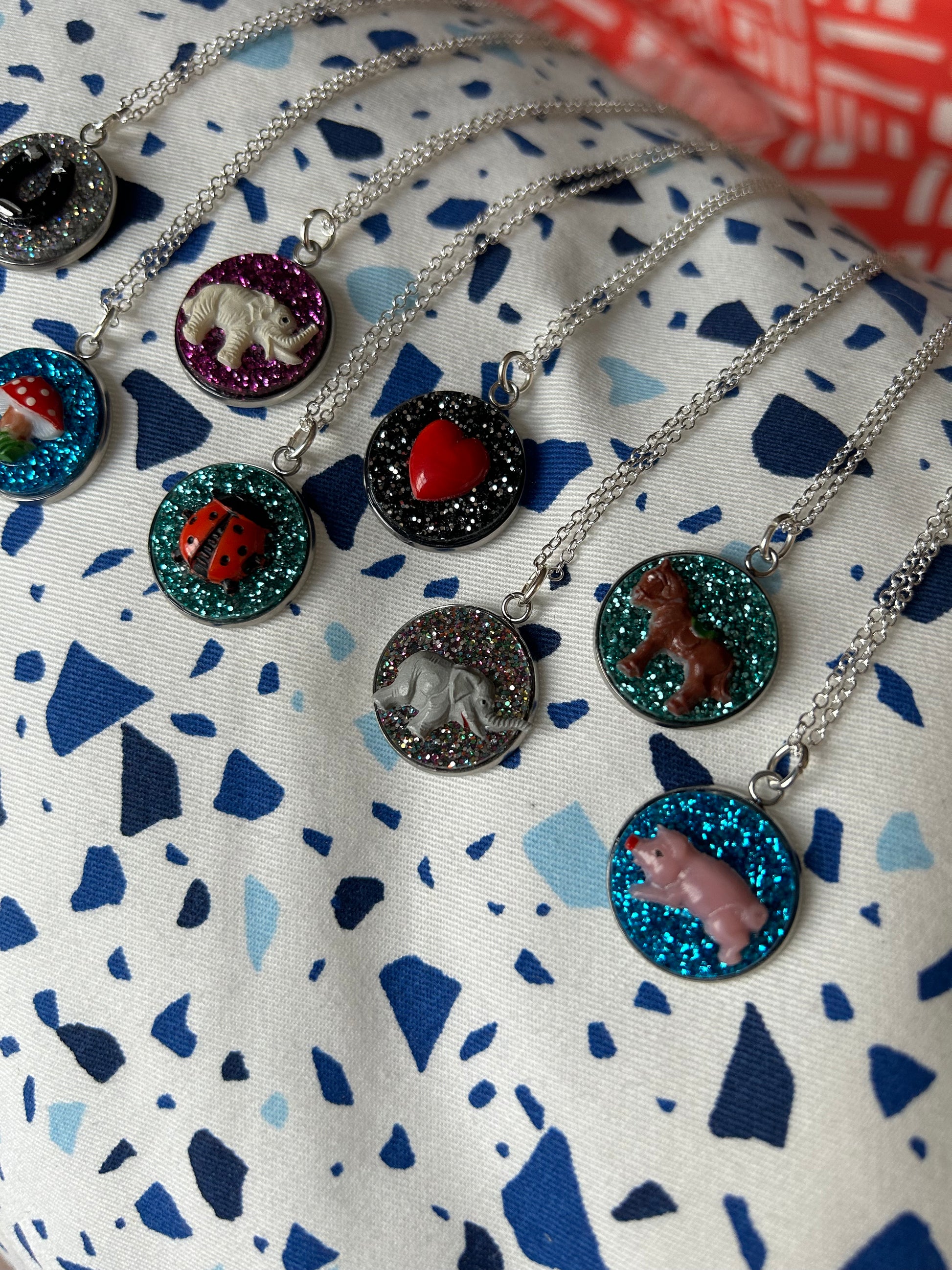 These pieces are made from rescued vintage charms from a 1950's charm bracelet. I turned them into cabochons. They're backed with glittery laser cut acrylic discs set into silver metal frames and suspended on silver plated chain with a lobster clasp. The necklaces are as follows: