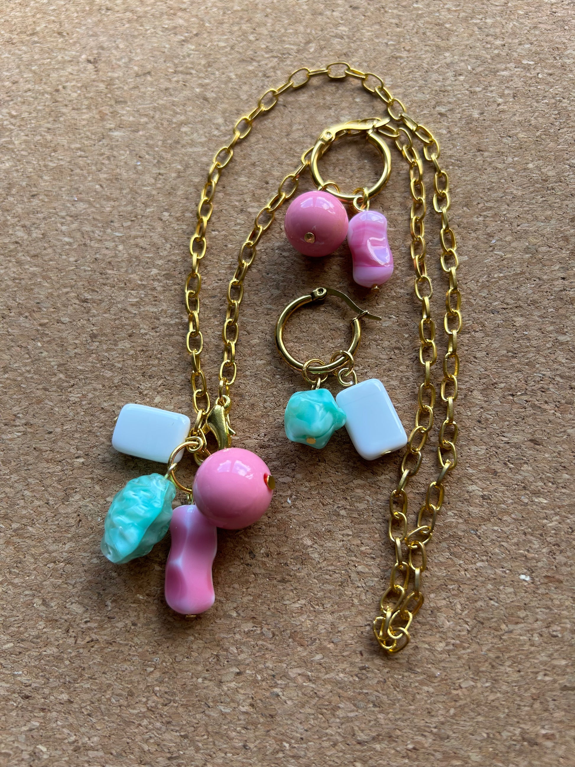 These necklaces are made from collected plastic and glass beads that look like chewing gum and bubble gum! Each necklace has a pink bubblegum bead and pink marbled chewed gum bead, with a green chewed gum bead and white gum bead.