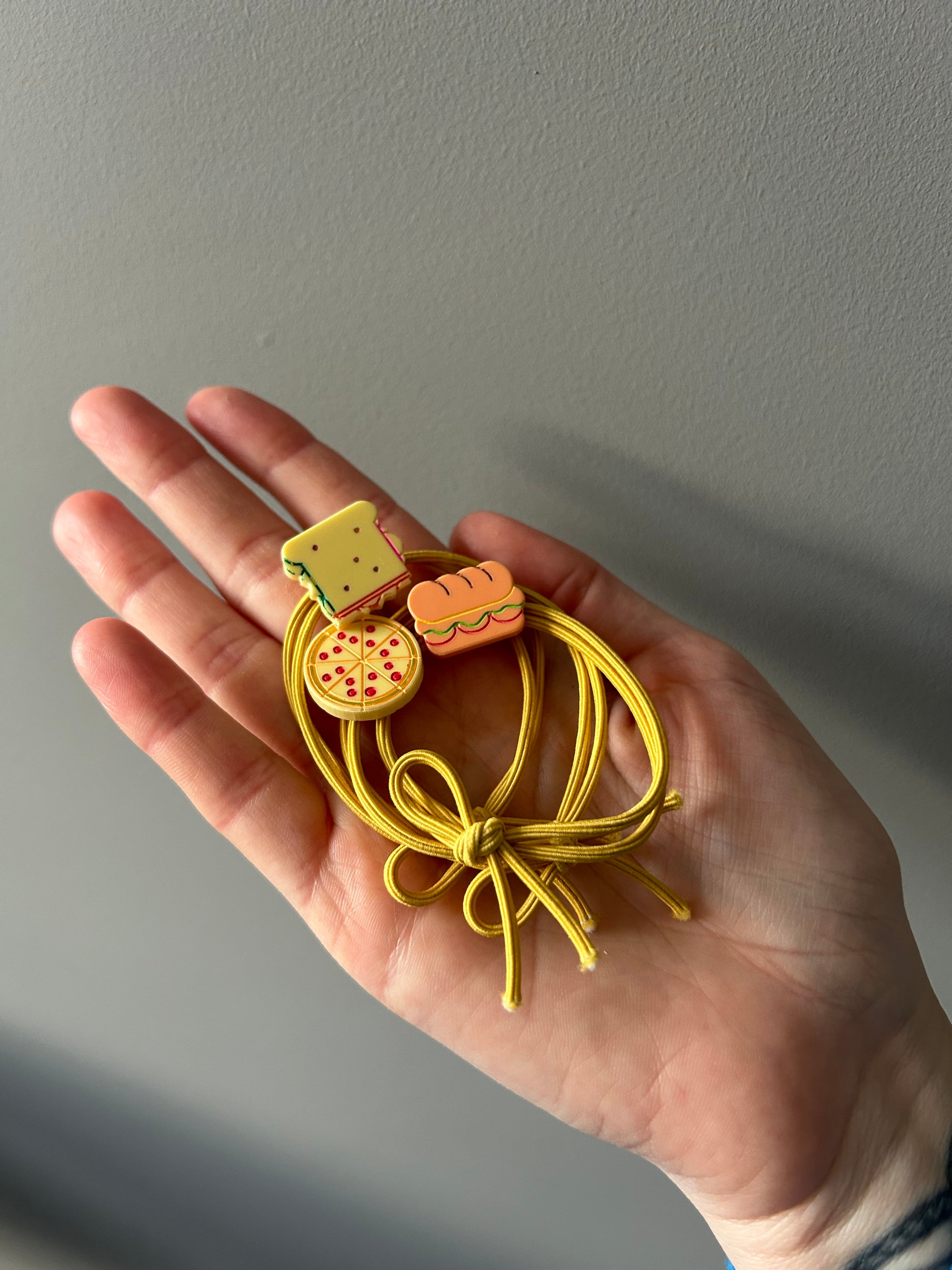 Mustard yellow hair ties featuring matte acrylic foods including a sub, a sandwich and a pizza!