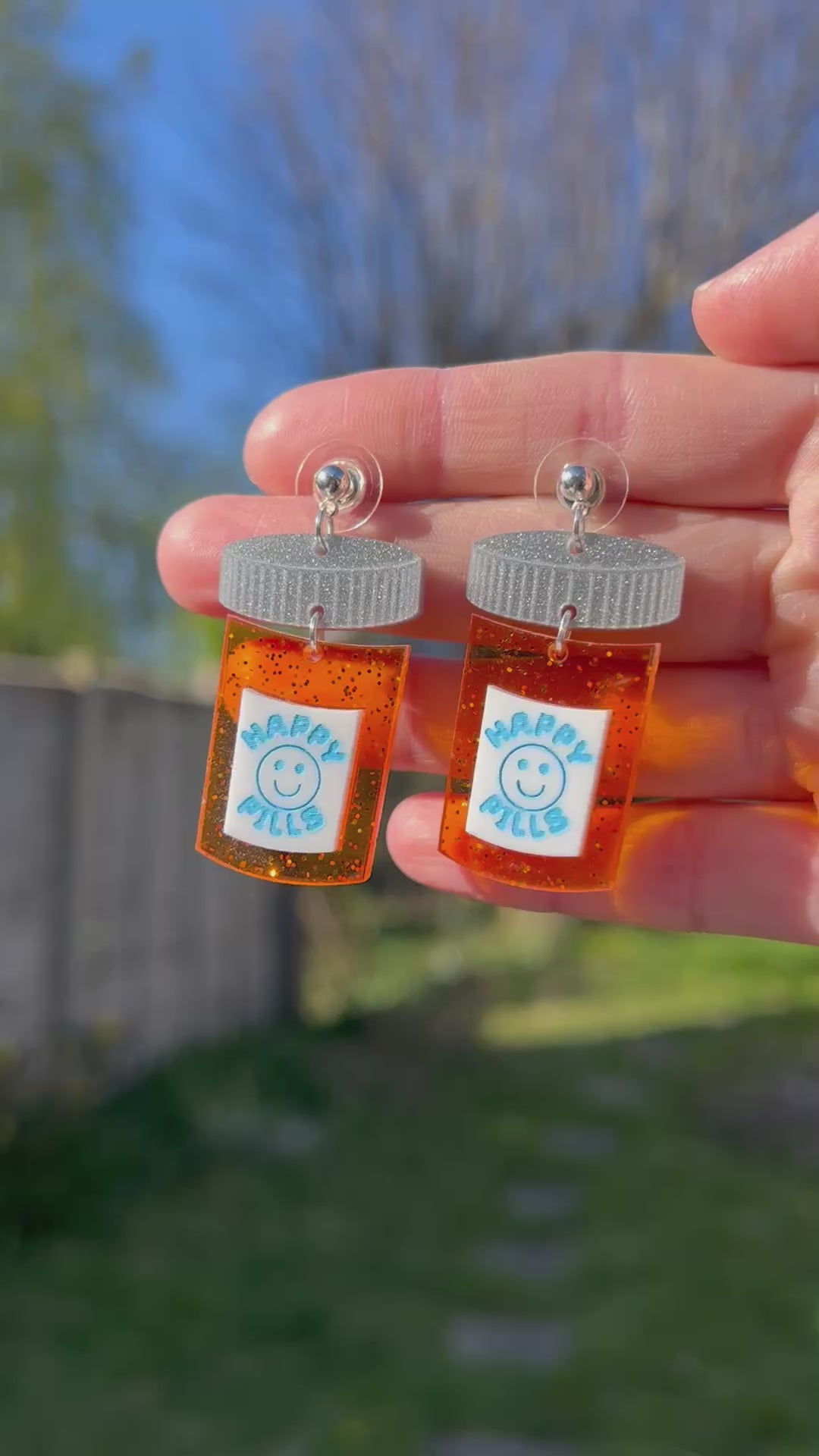 Orange glittery translucent acrylic makes these little pill bottles sparkle! With shimmery silver lids and smiley face labels on silver dot studs.