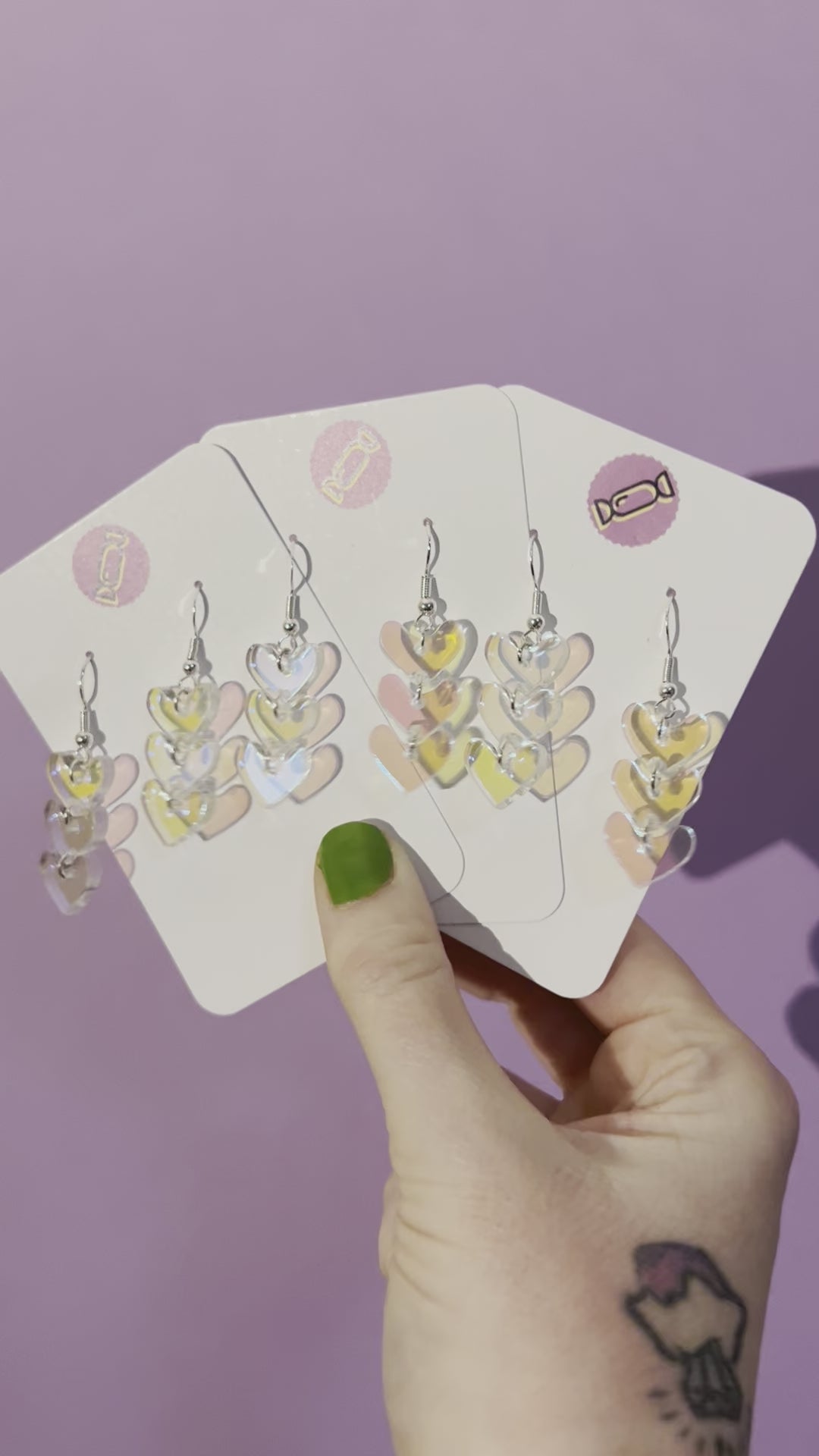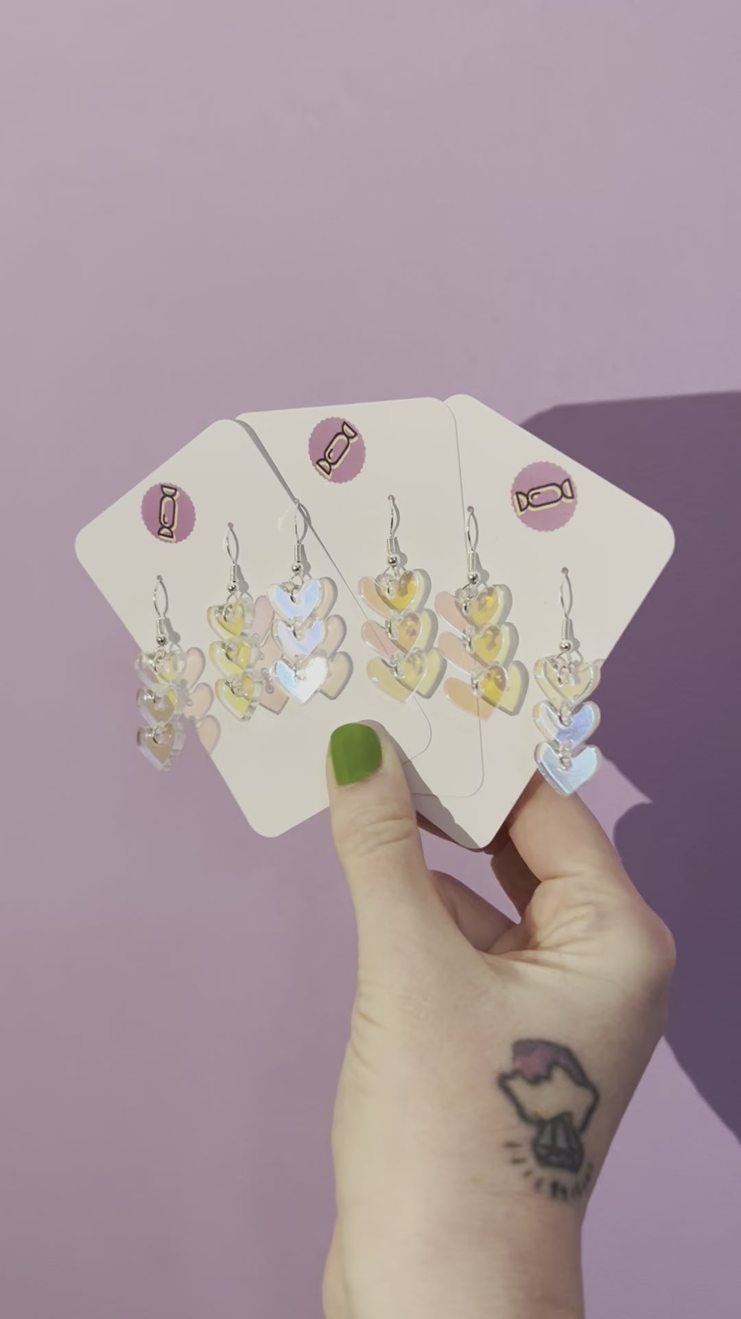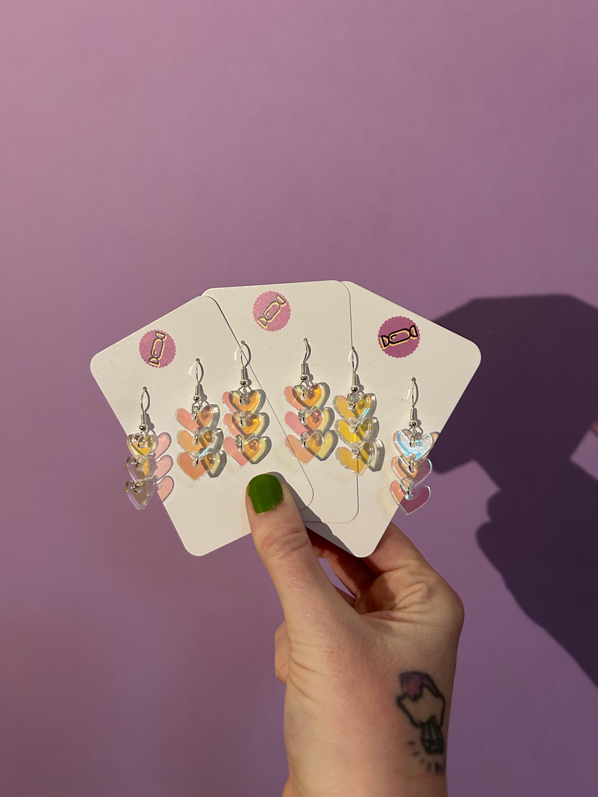 These earrings were made from pieces in an offcuts bag to reduce plastic waste. Each earring is made with a trio of iridescent acrylic hearts on silver metal hooks.