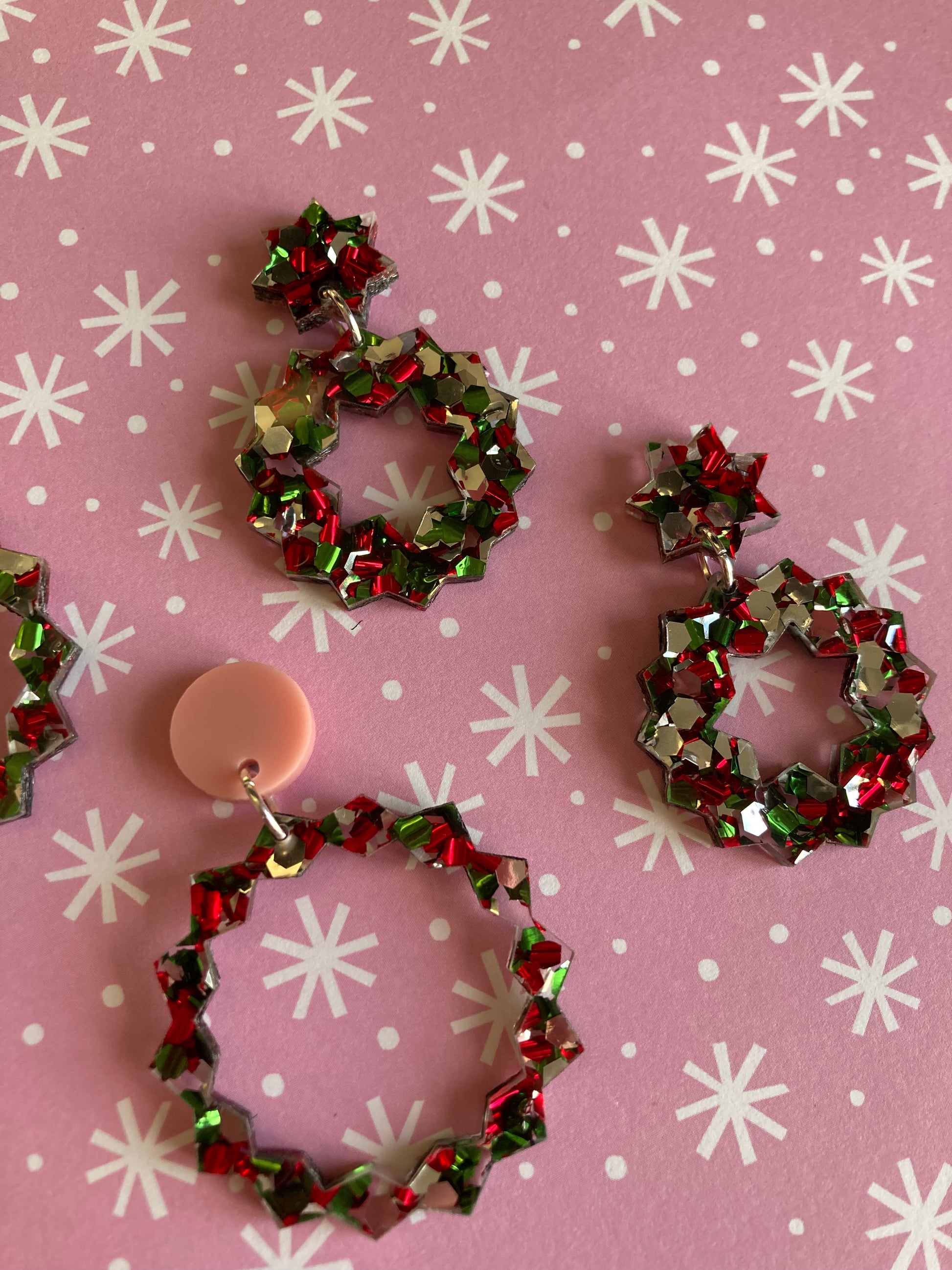 Two different types of earrings cut from one piece of acrylic! One pair features matte blush pink tops and large jagged festive glitter hoops and the other pair features starburst tops and chunky hoops. The festive glitter acrylic is speckled with red, greens and silvers.