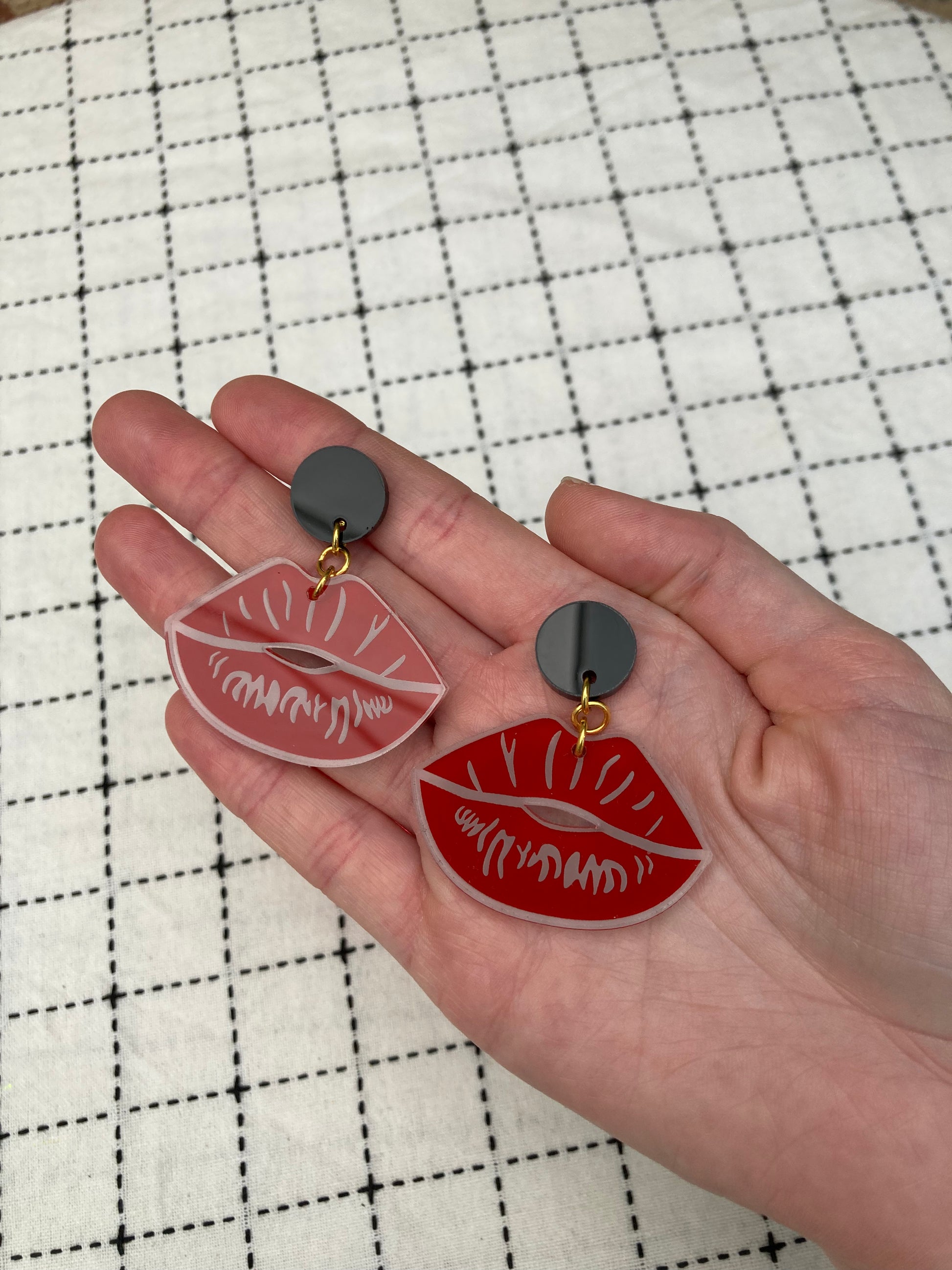 Red printed acrylic lip charms suspended from shiny black discs with gold metal findings for Valentines or a hot date. Photographed alongside the Full House Earrings