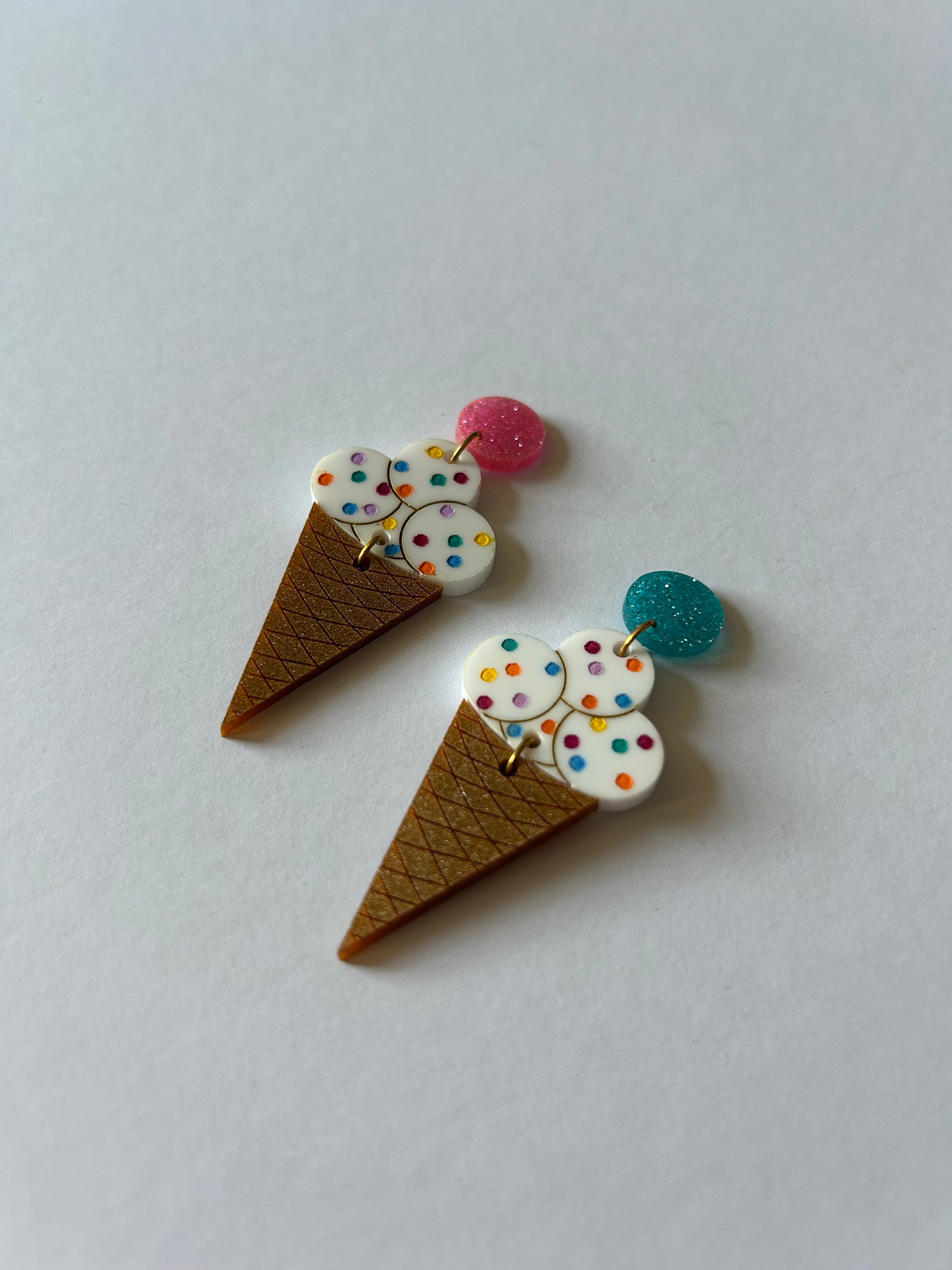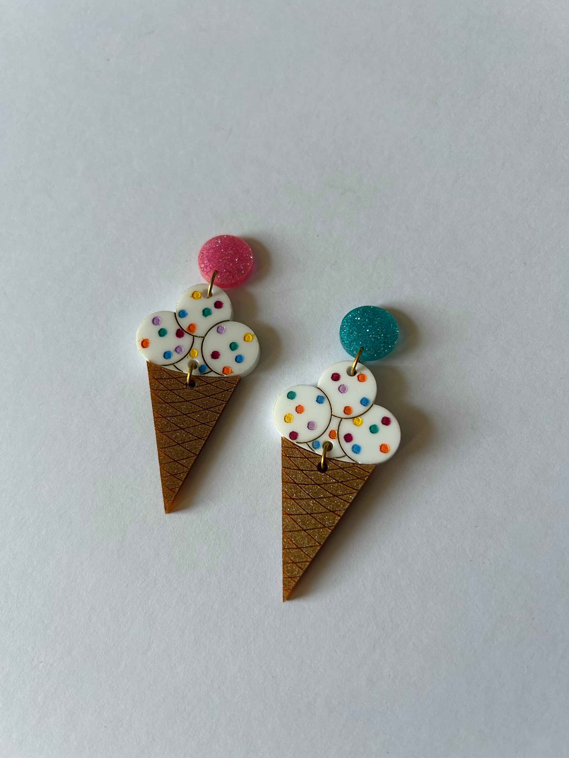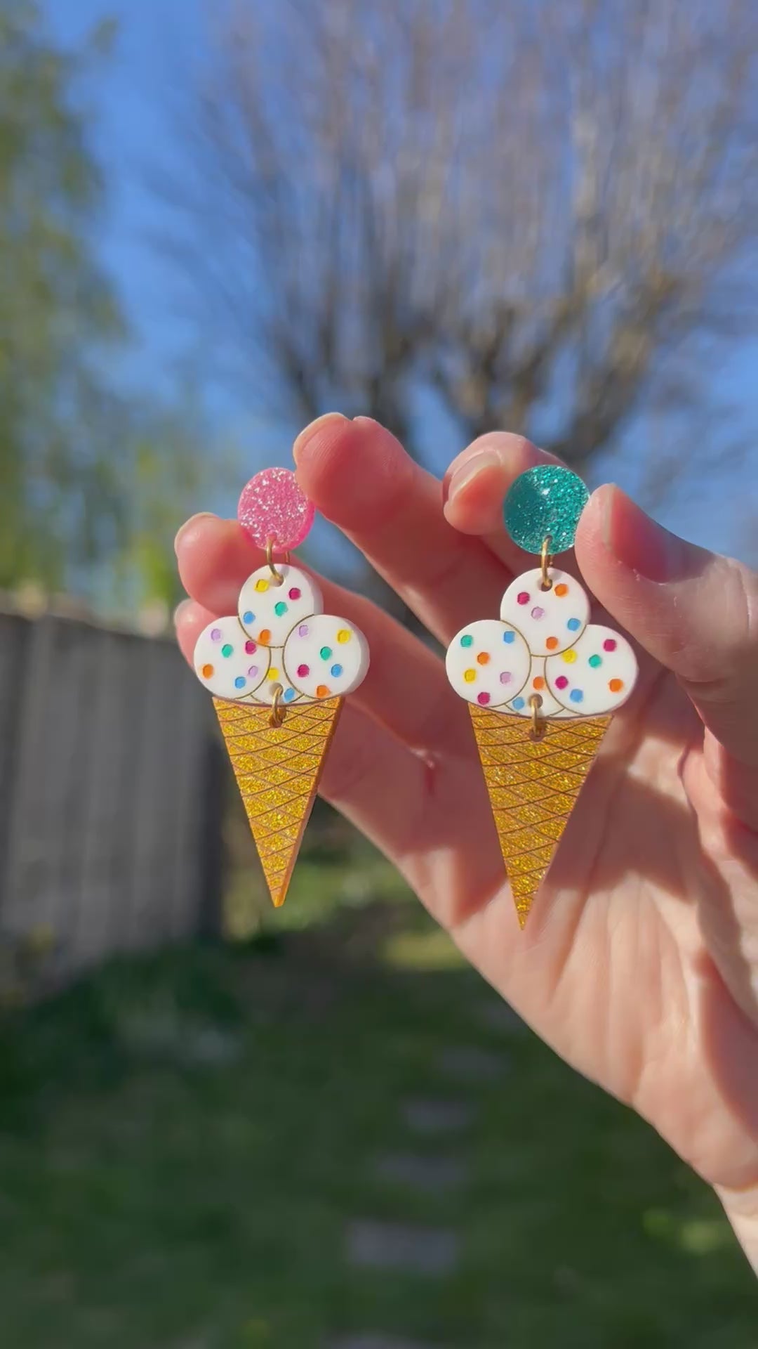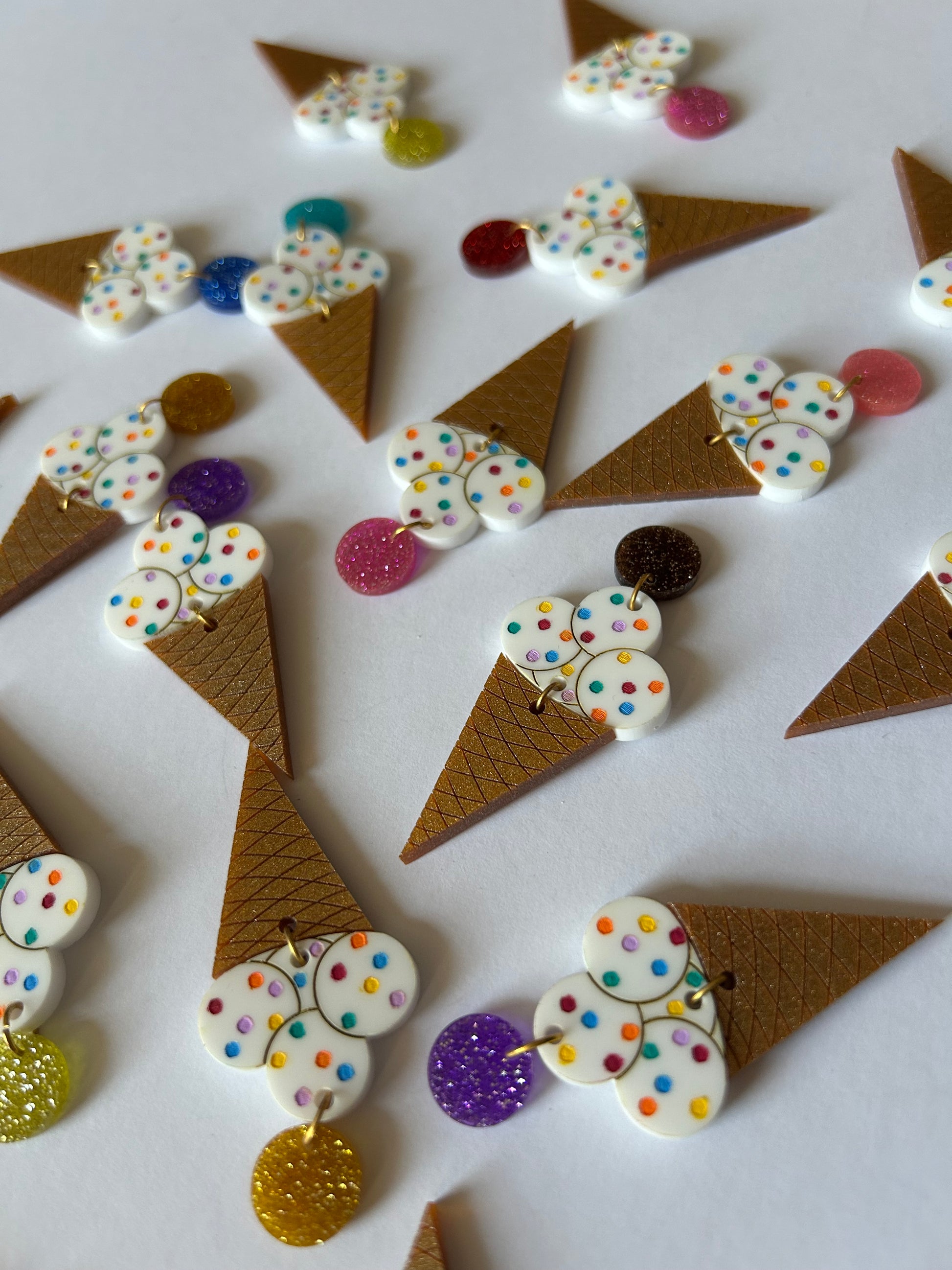 Gold shimmery cones, white dotted acrylic ice creams and glittery discs. Each earring is unique and each pair will have different coloured tops. If you have a preference please let me know.