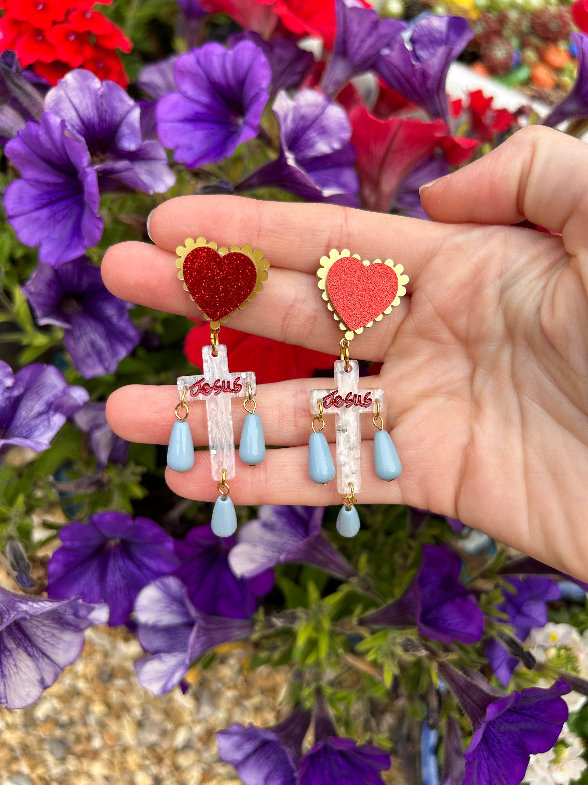 I had red glitter acrylic hearts and acetate Jesus cross charms in my stash and wanted to jazz them up! So....I added frilly gold shimmer acrylic heart cabochons and little dangly light blue beads. There are two variations to these earrings with the writing on the crosses. On some pairs the writing is a bold red and on some pairs is a burgundy colour - the choice is yours! They are beautiful, bold and lightweight with gold meal findings :)