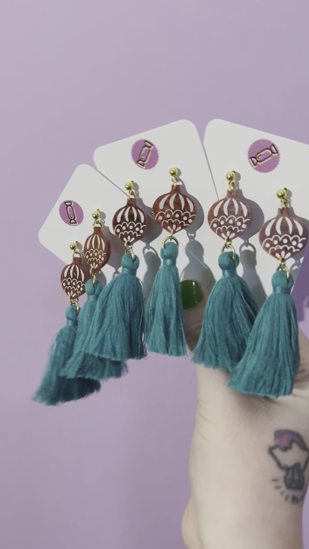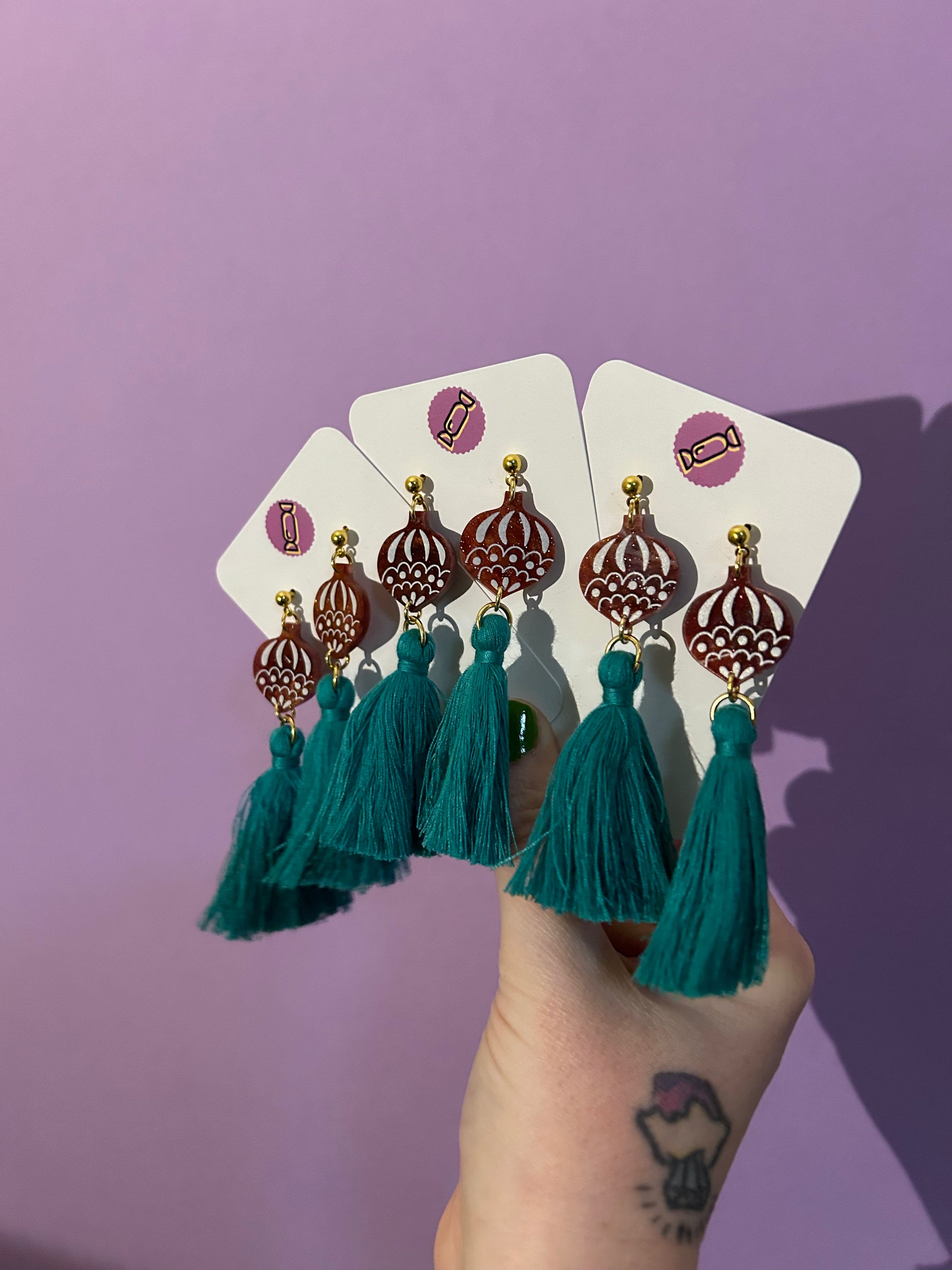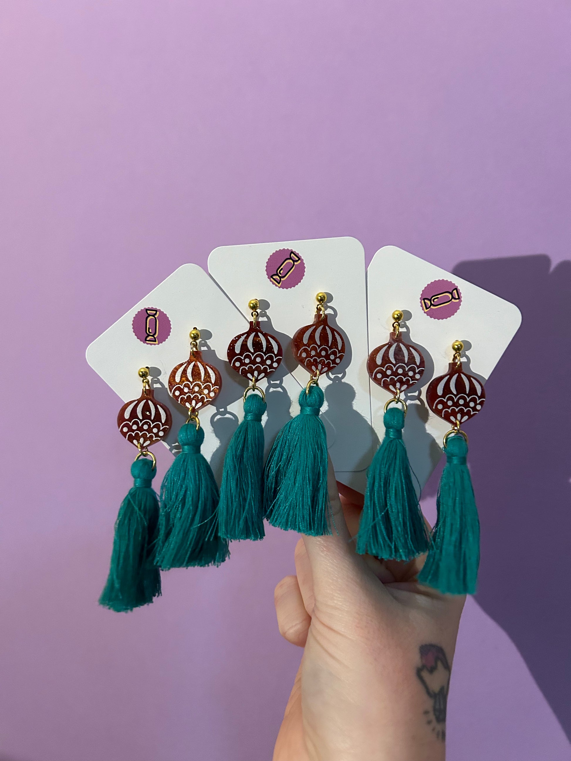 Burgundy sparkle acrylic lantern bauble charms suspended on gold dot studs with teal cotton tassels. These are gorgeous statement earrings for the festive season!