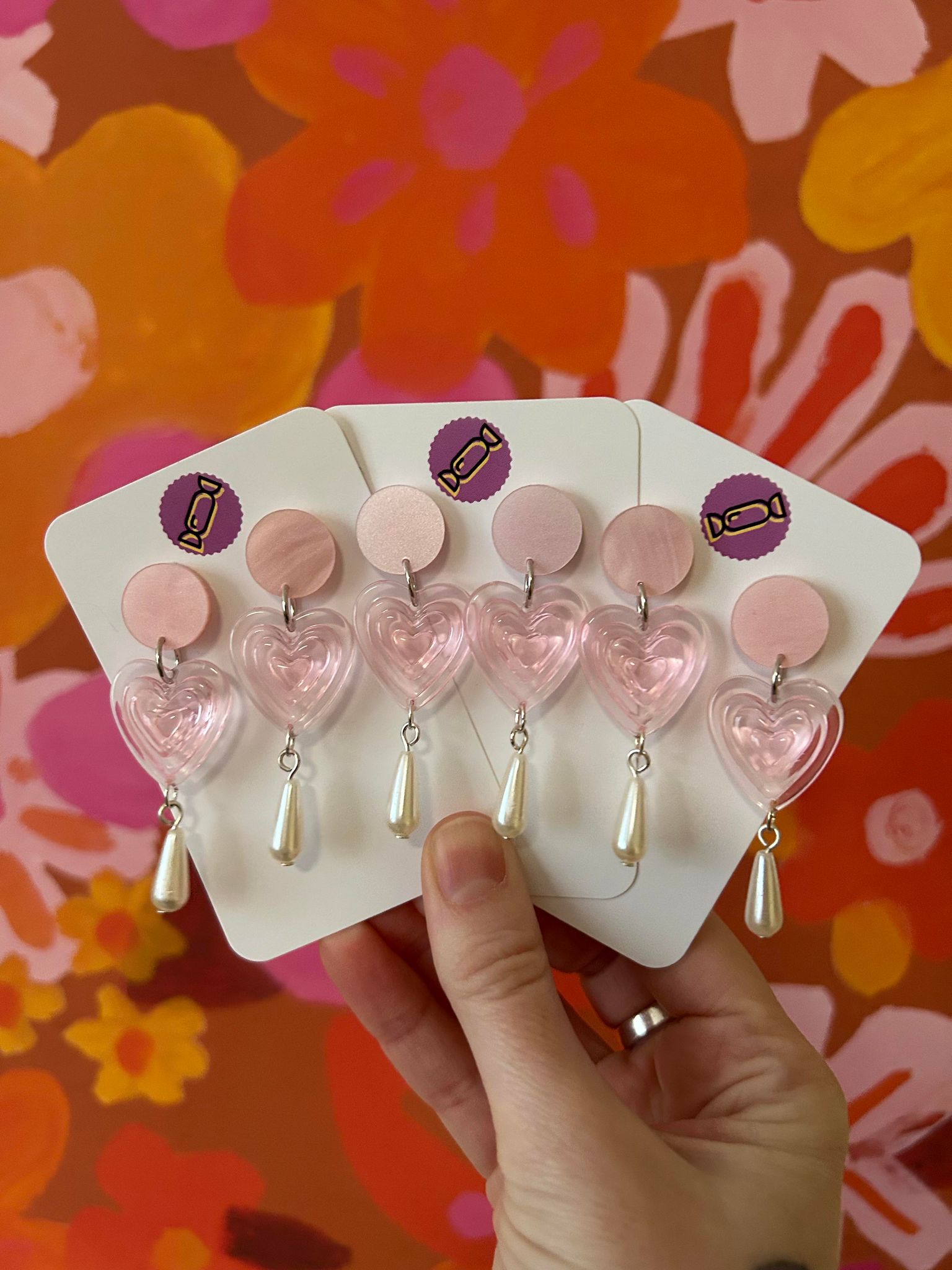 These earrings have been made from layered heart plastic beads with pearly teardrop beads and light pink shimmery acrylic discs with silver metal findings.