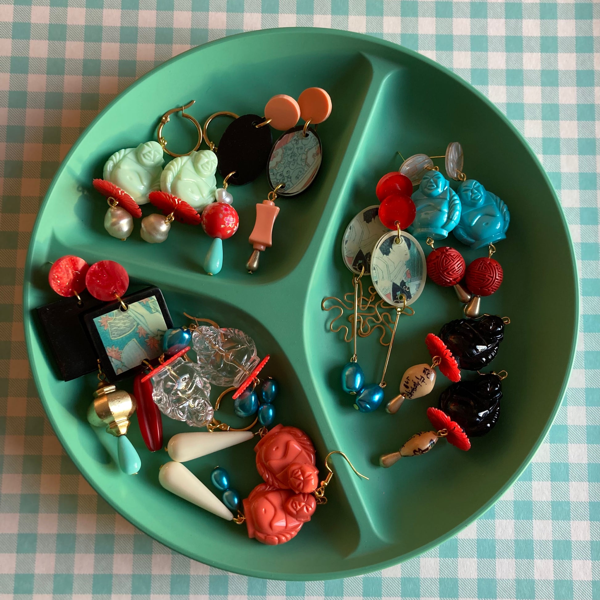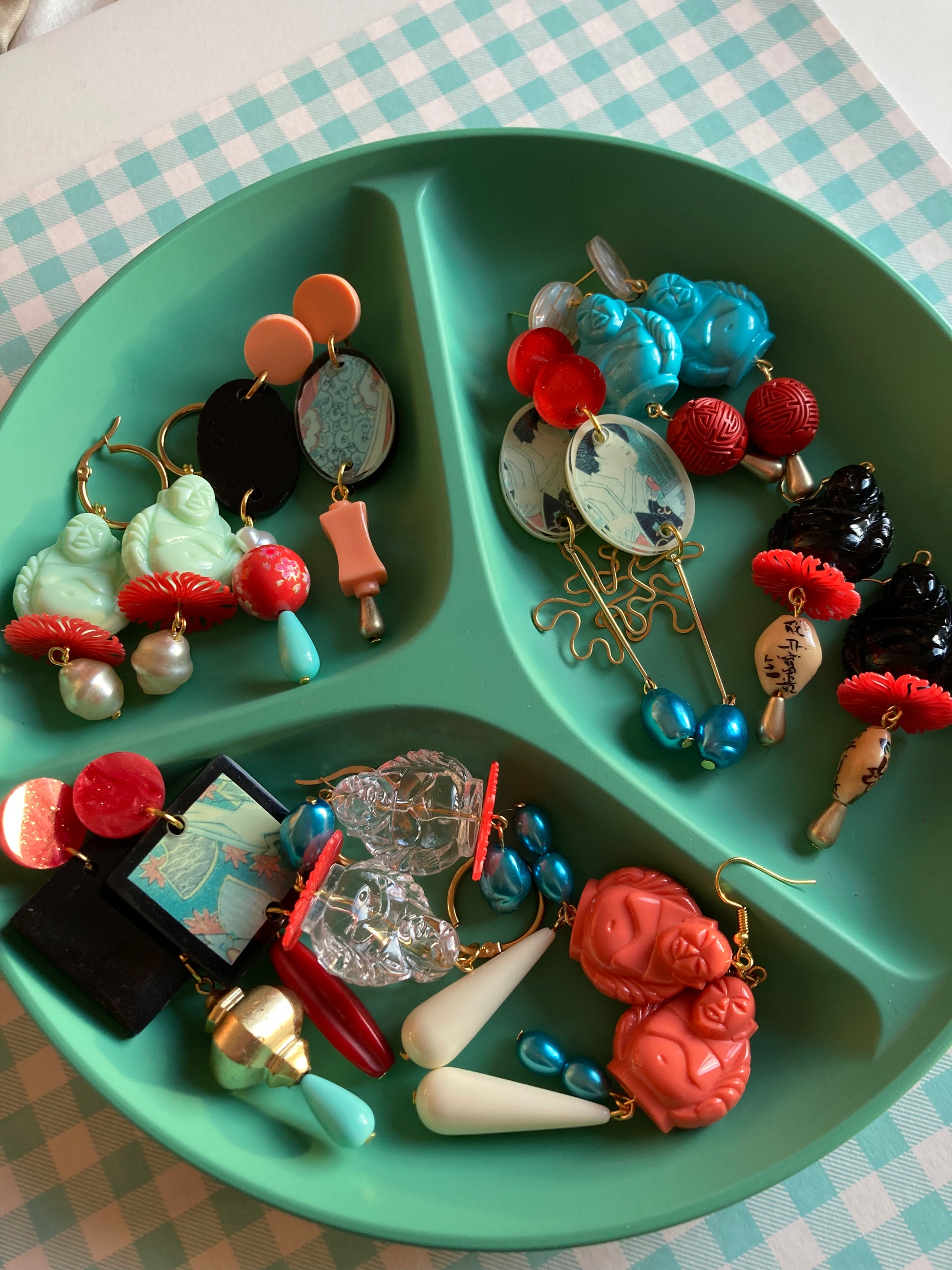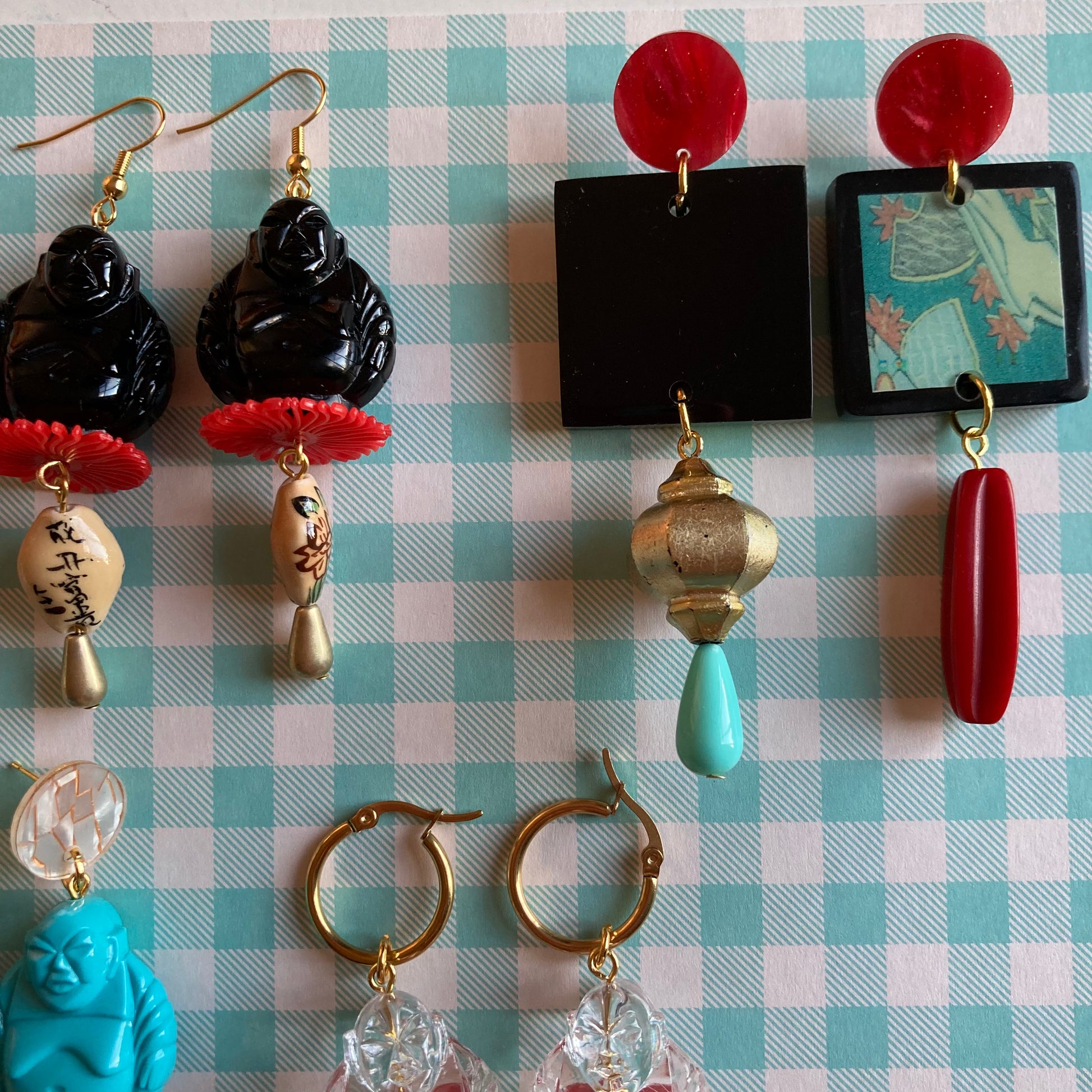 A gorgeous collection of oriental bead and charm earrings inspired by family trips to Hong Kong... They are numbered in the second picture: