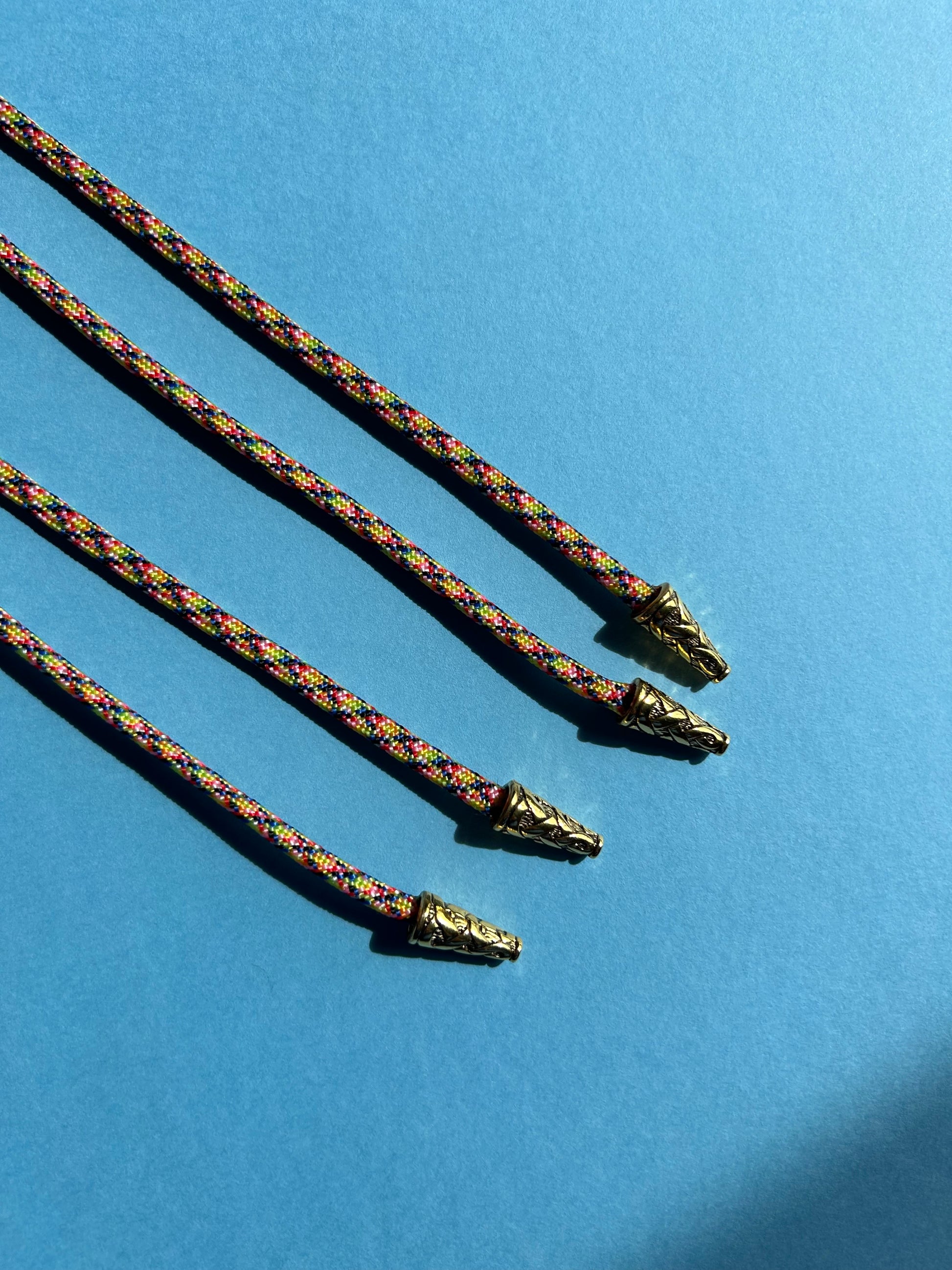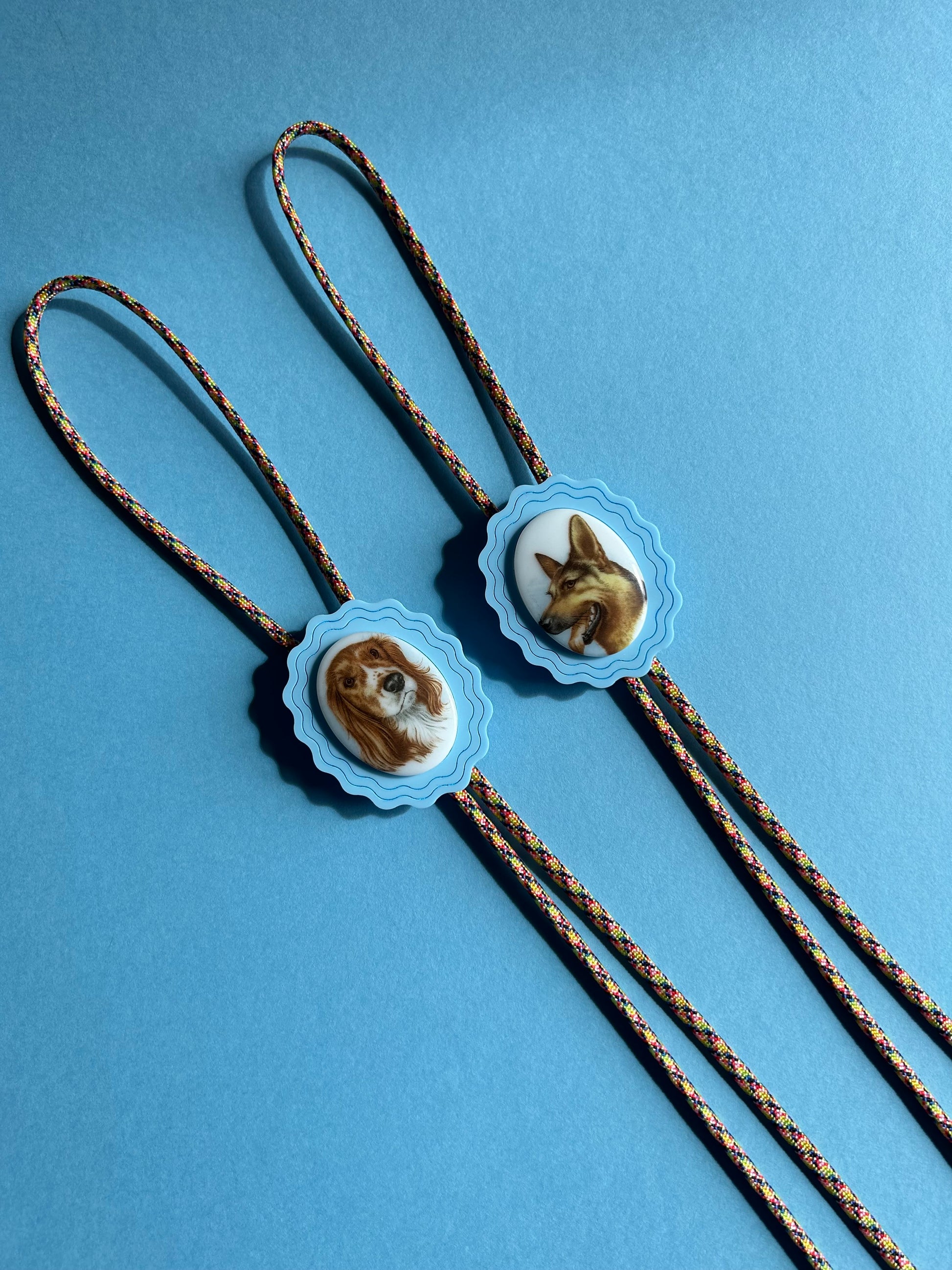 OH MY GOODNESS! These have been sitting in my 'to do' pile for a very long time but I finally found some rope for these beauties! Each of these ties features a vintage cat cabochon on pastel blue acrylic, cut and engraved by me! The tie ends are gold metal bead caps with a woven pattern on them and rope is multicoloured. These are pretty fabulous if I must say so! They are labelled as so: