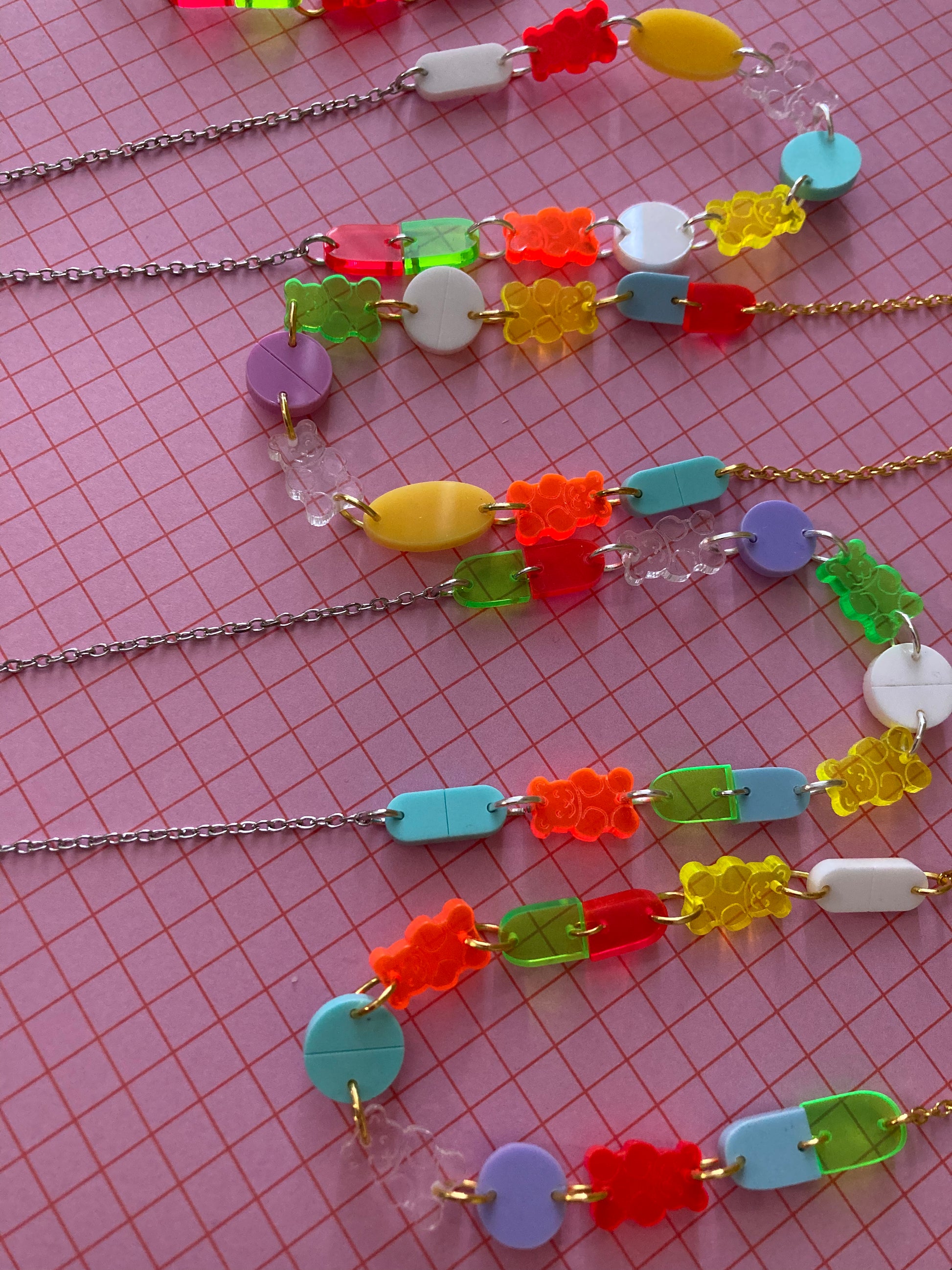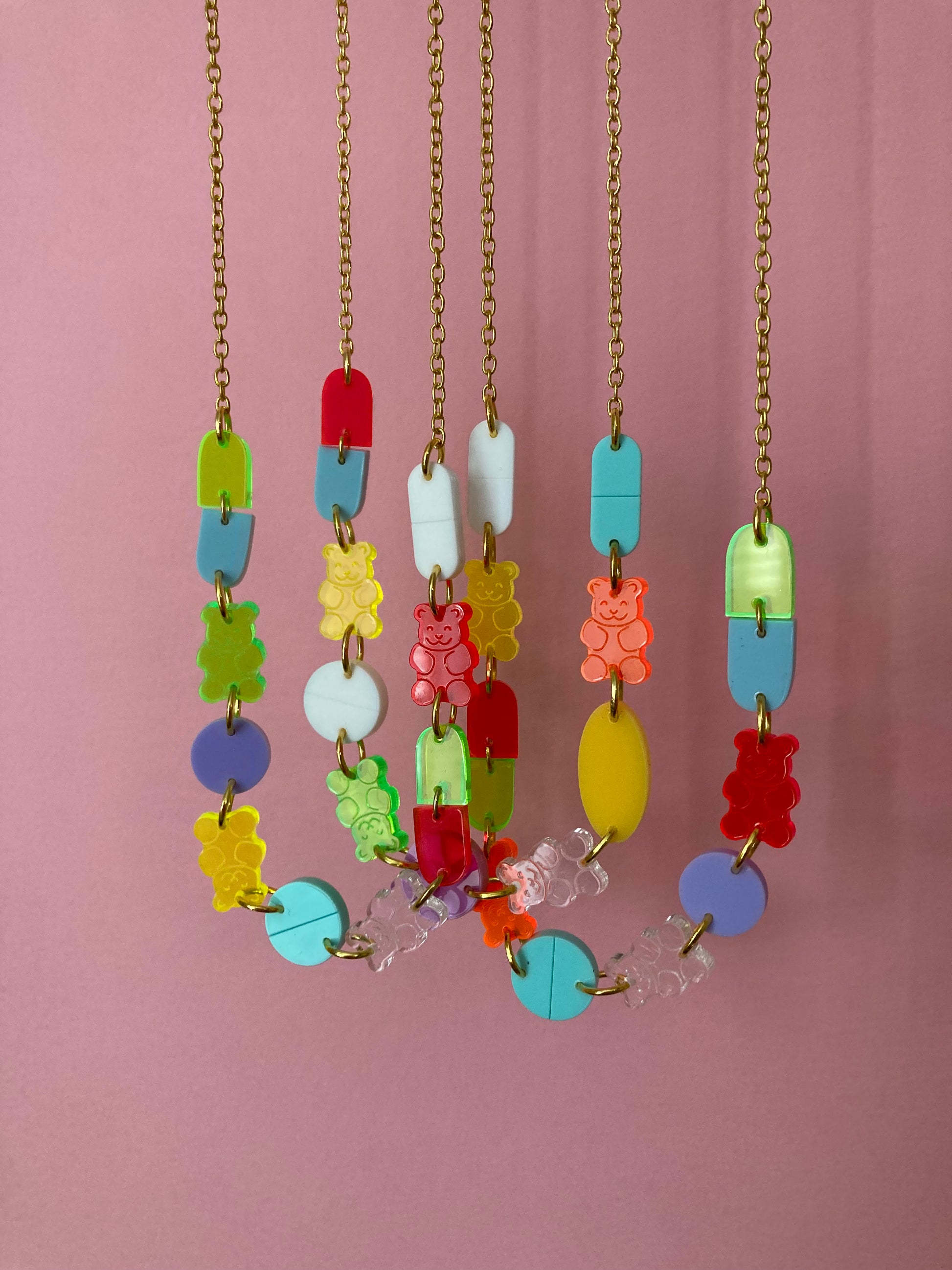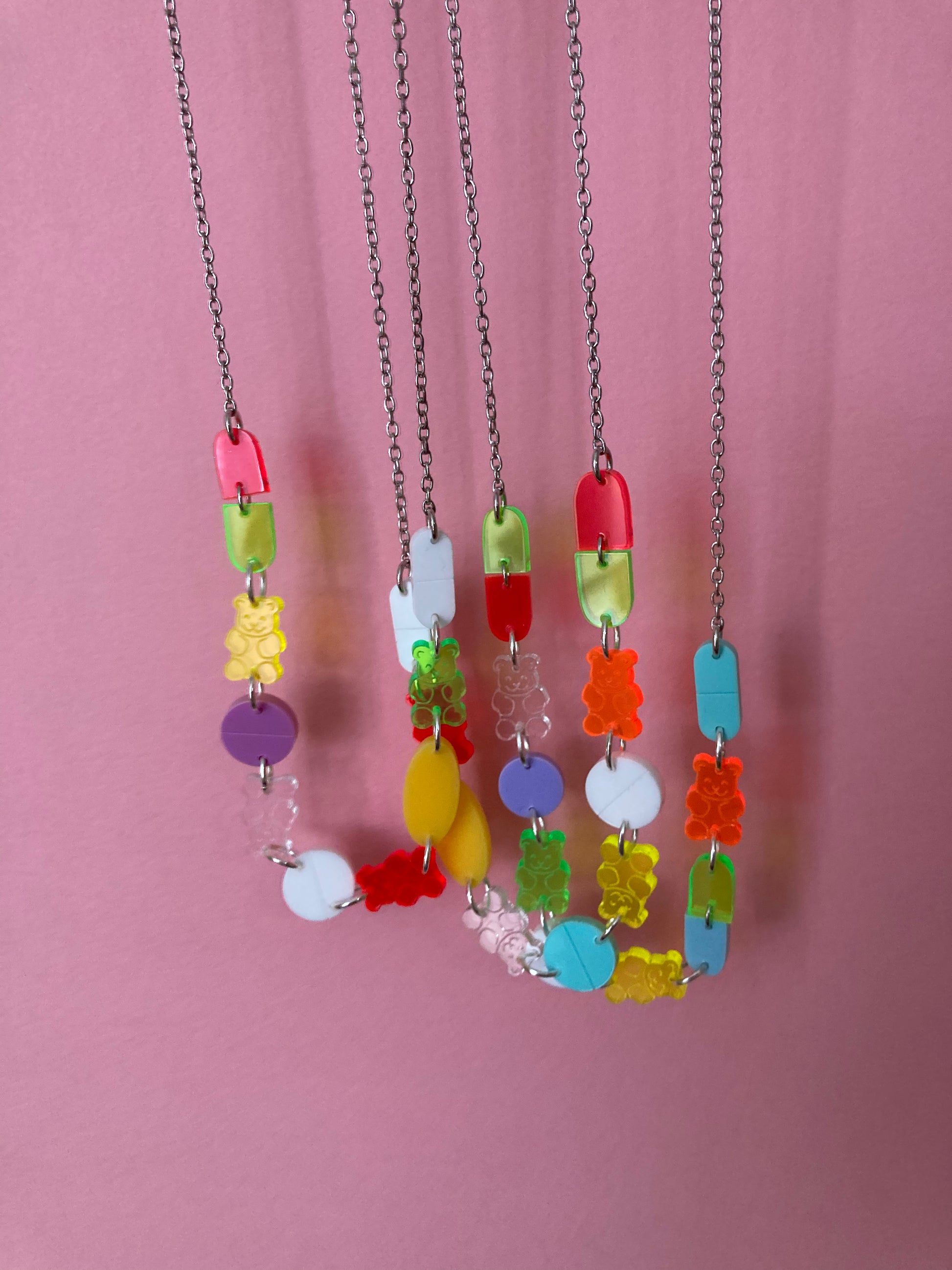 These awesome necklaces are a mix of pills and gummy bears in neon, pastel and translucent colours. All charms are made of laser cut acrylic and will be chosen at random. Some are on gold metal chains and some on silver. If you have a preference please message me.