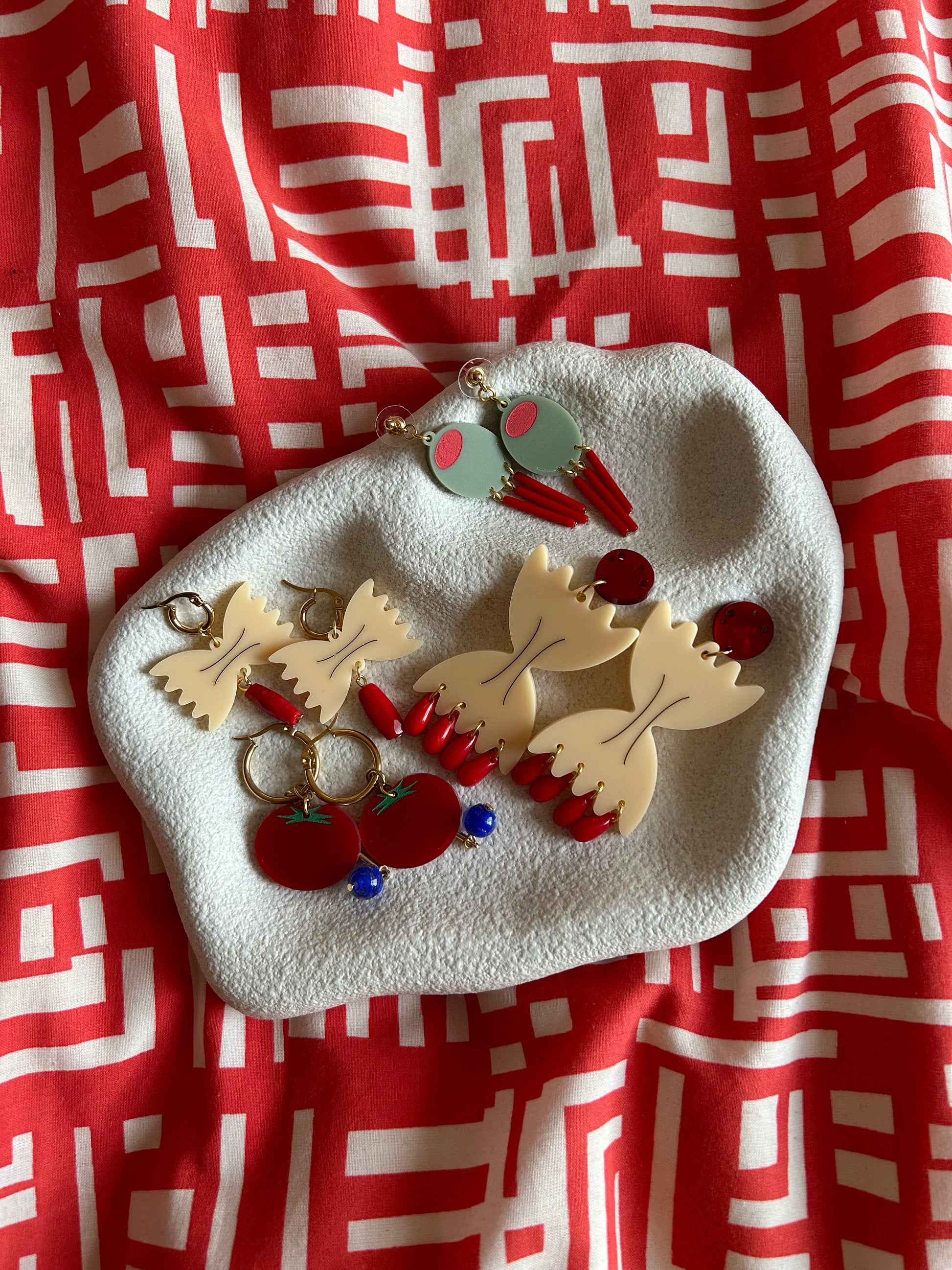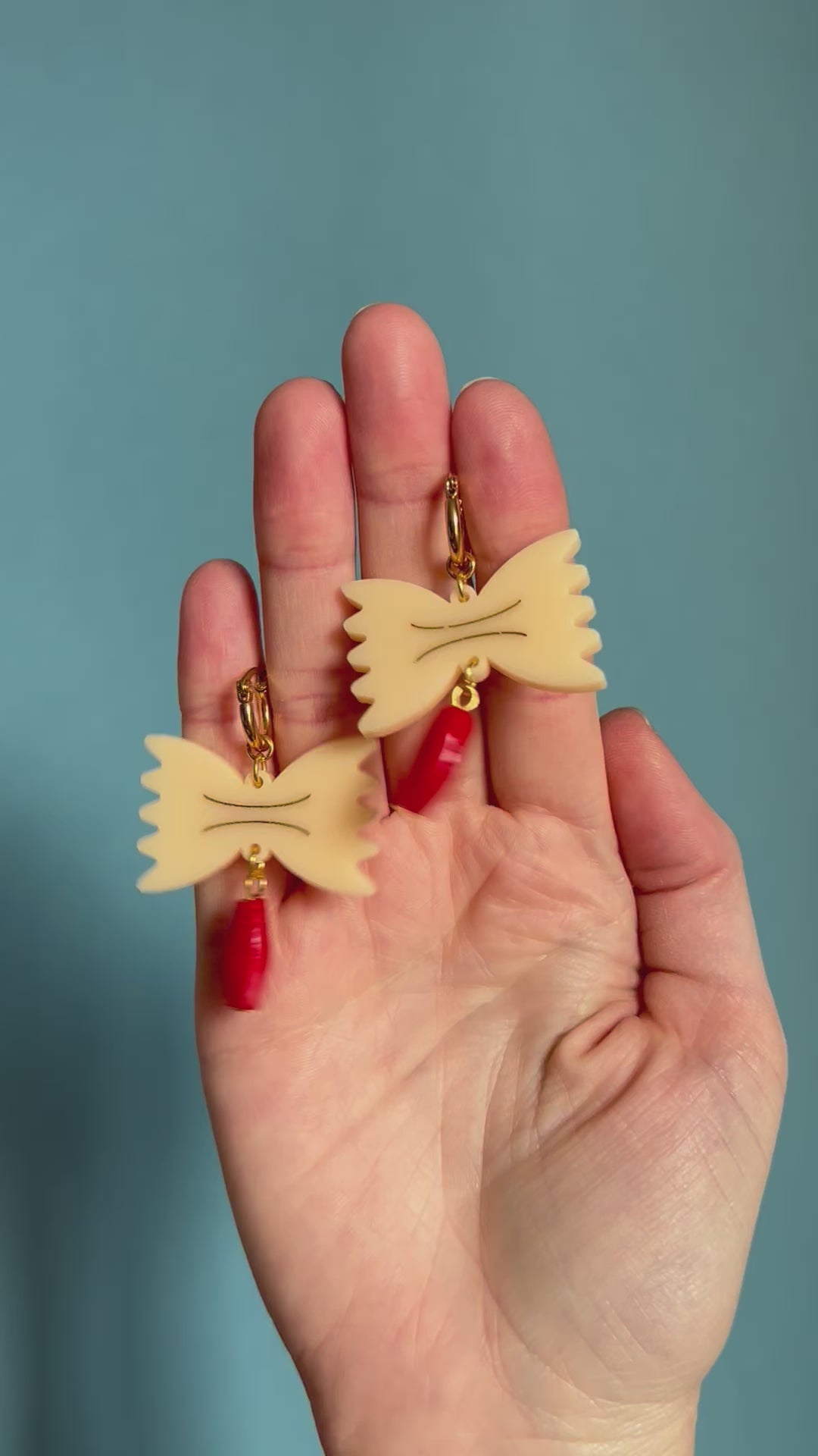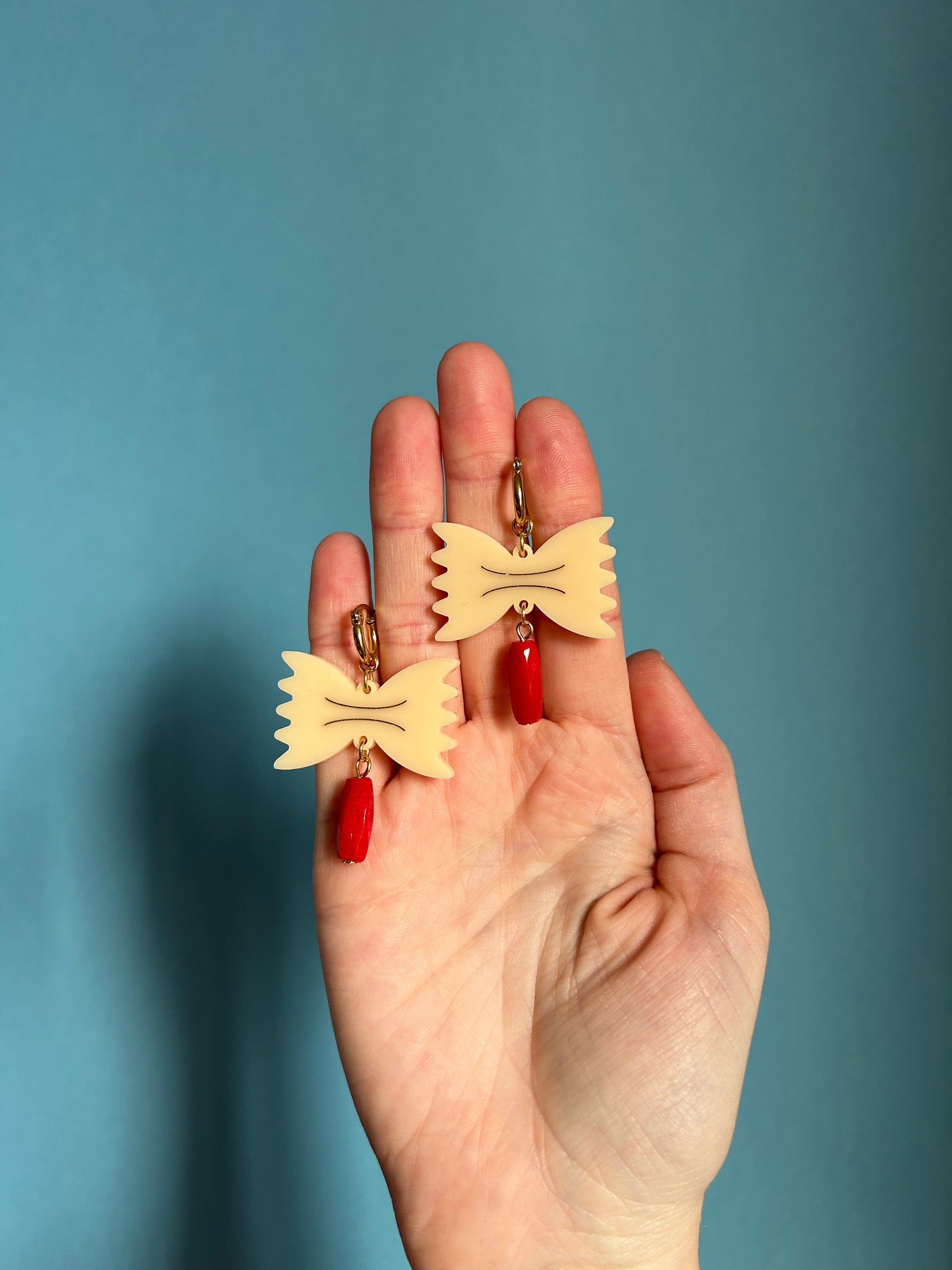 These earrings are adorable, lightweight and perfect for any pasta lover! Mini acrylic engraved pasta bow suspended from mini gold metal hoops with red vintage glass beads.