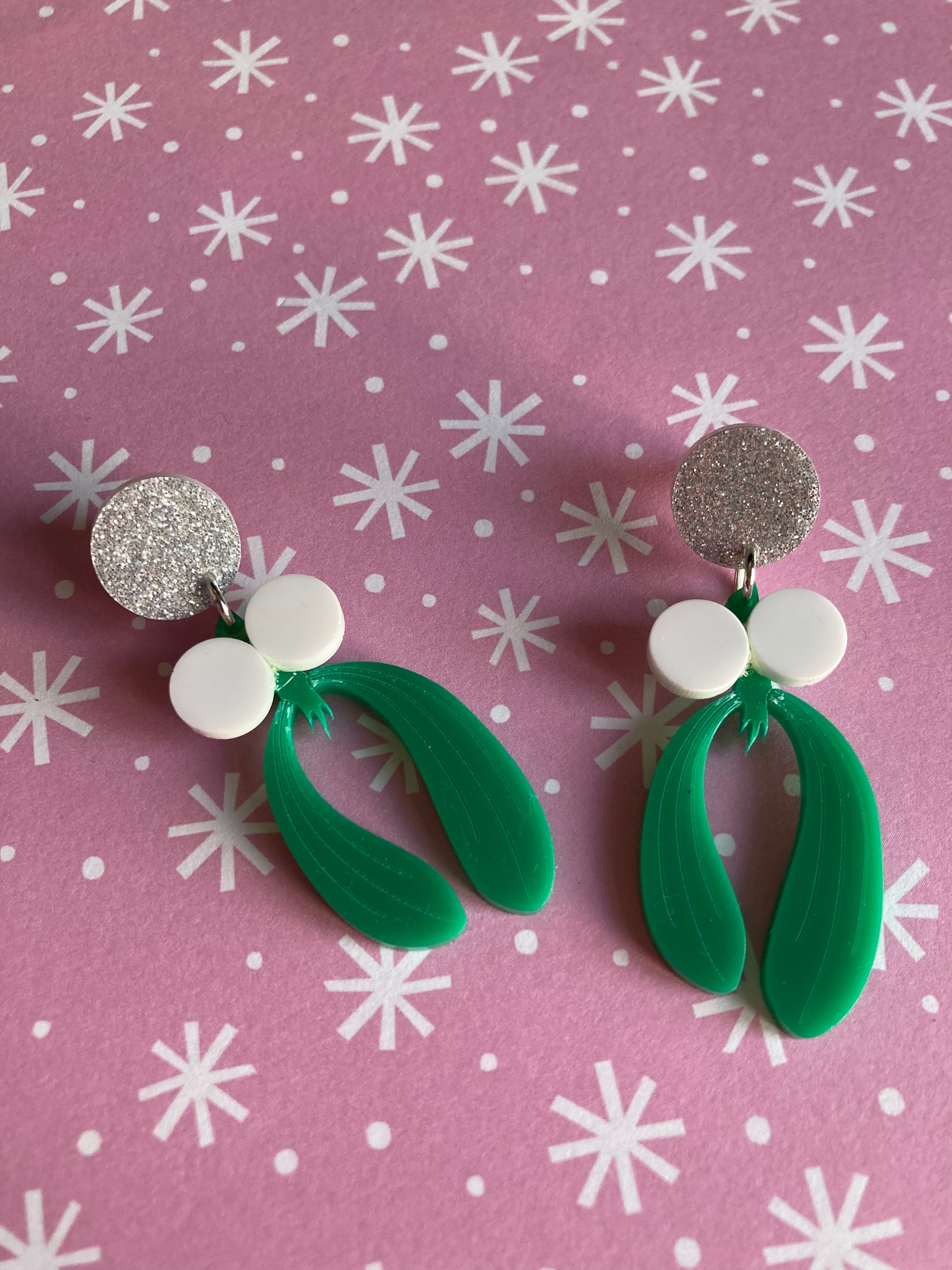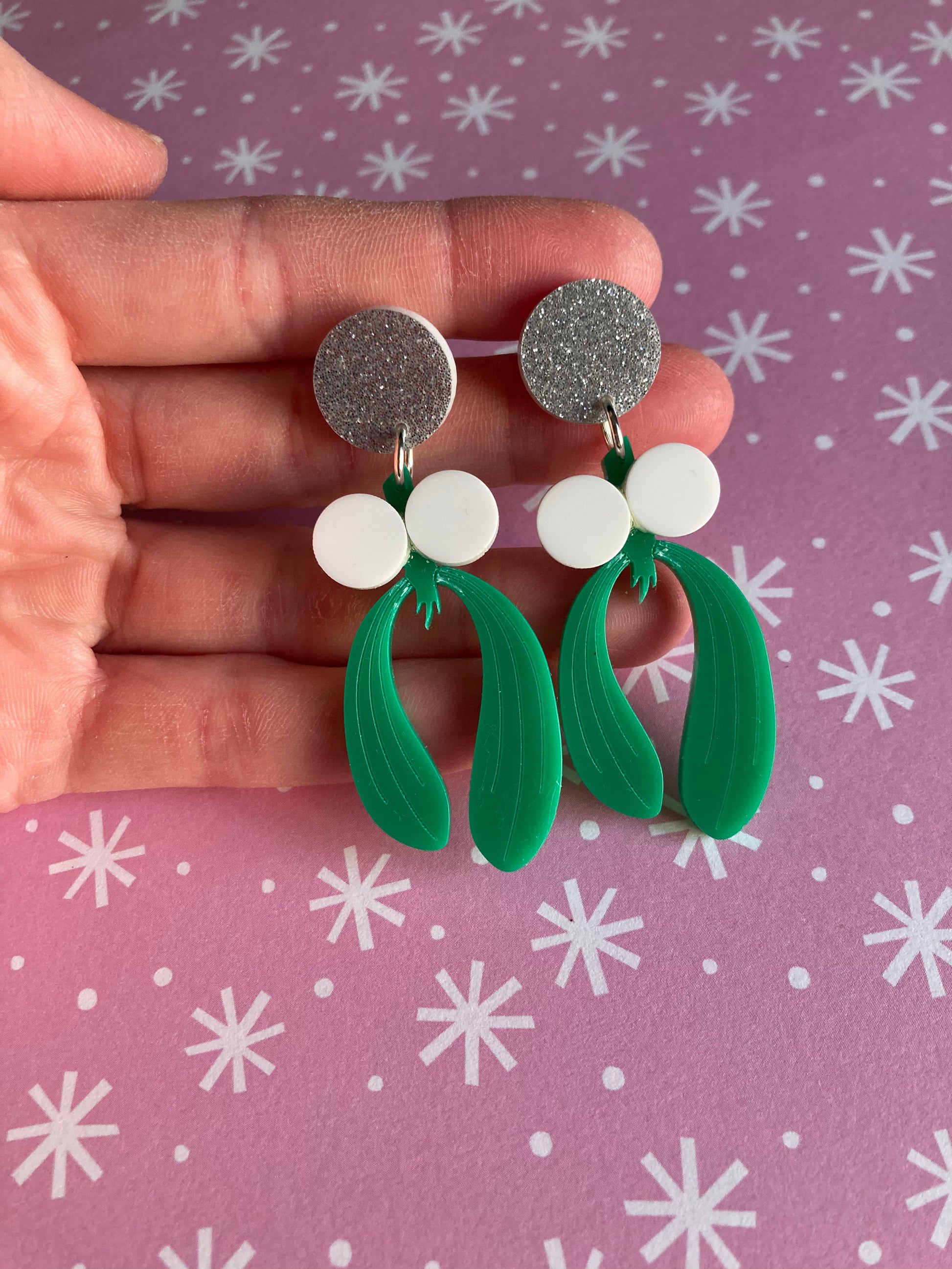 These are simple yet gorgeous and feature silver glitter tops, green mistletoes with white acrylic details. They are a festive classic!