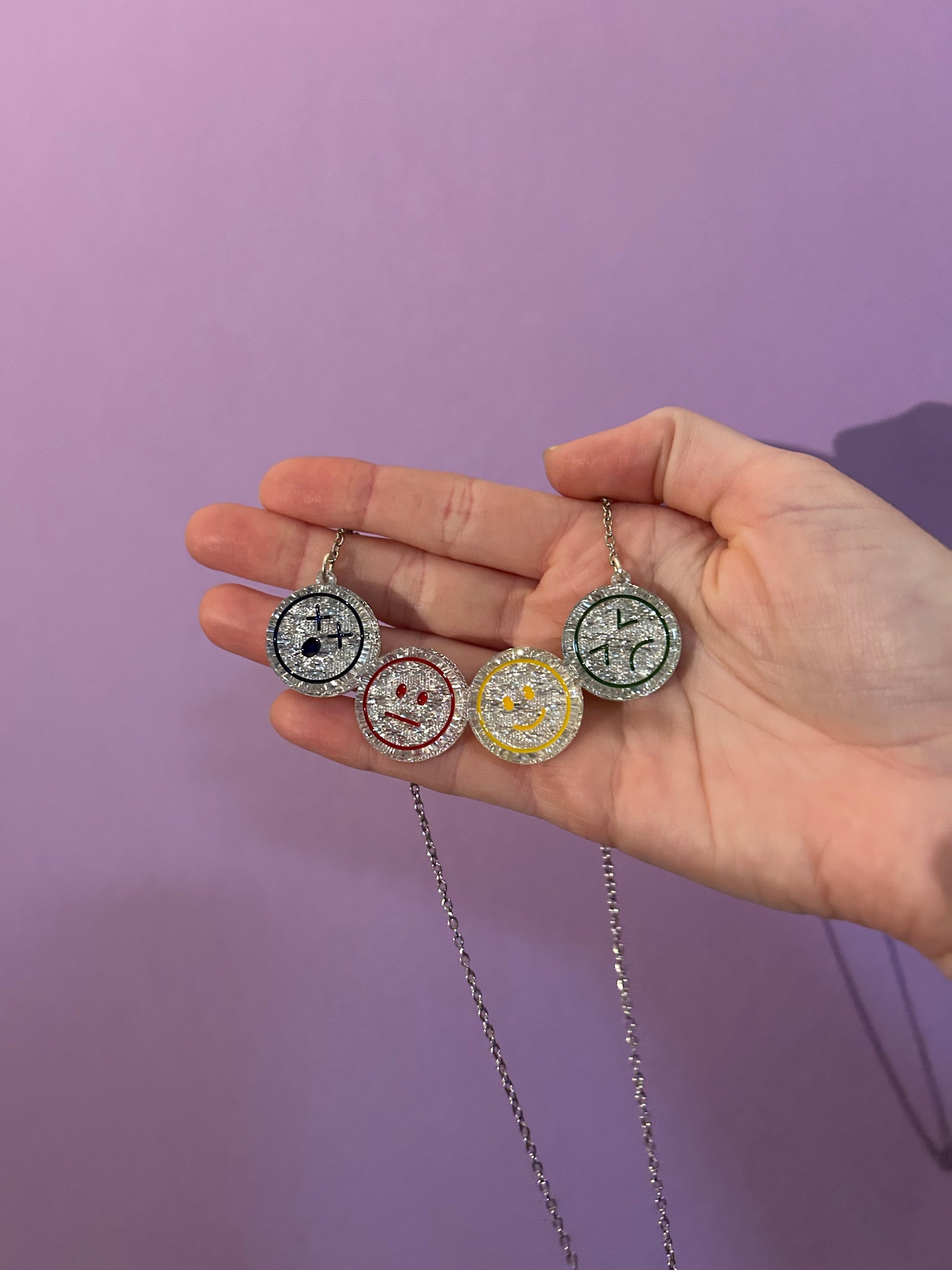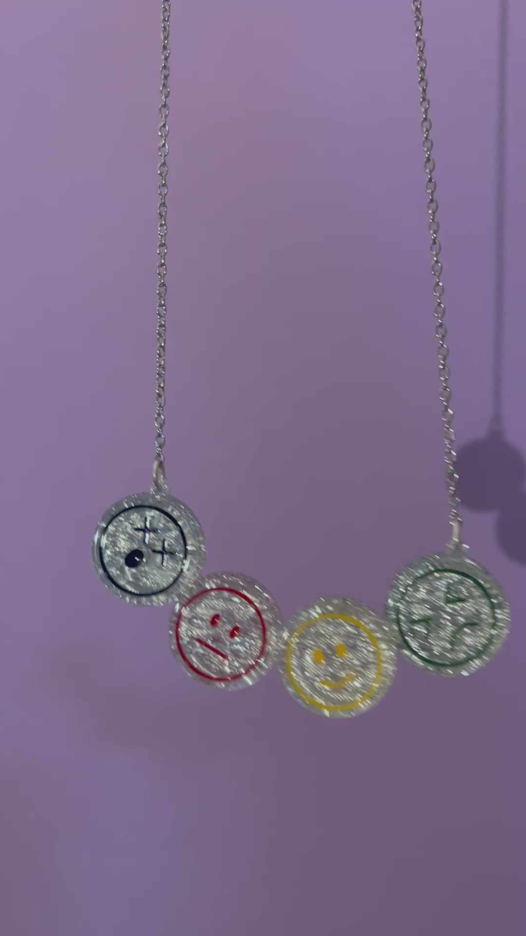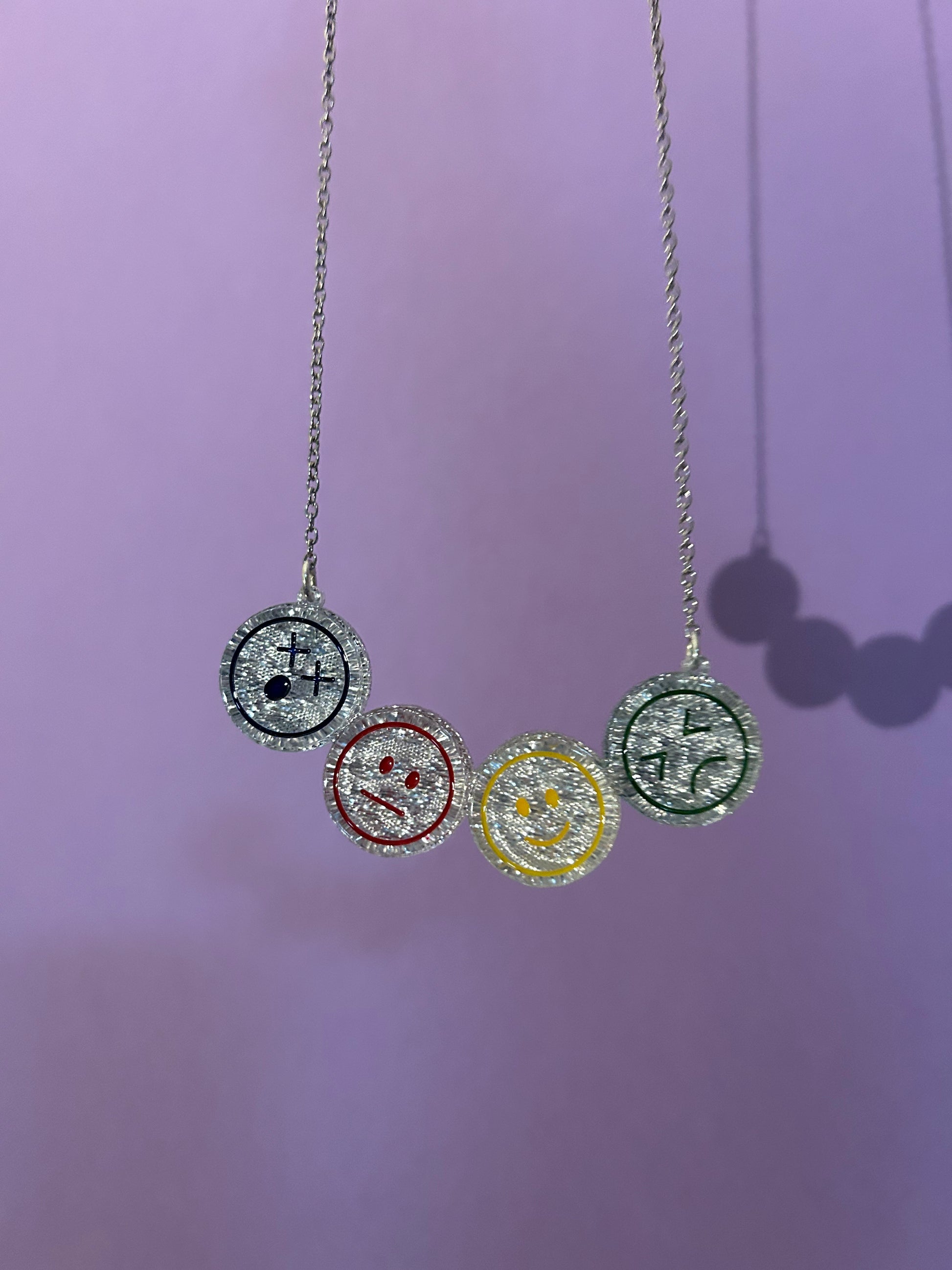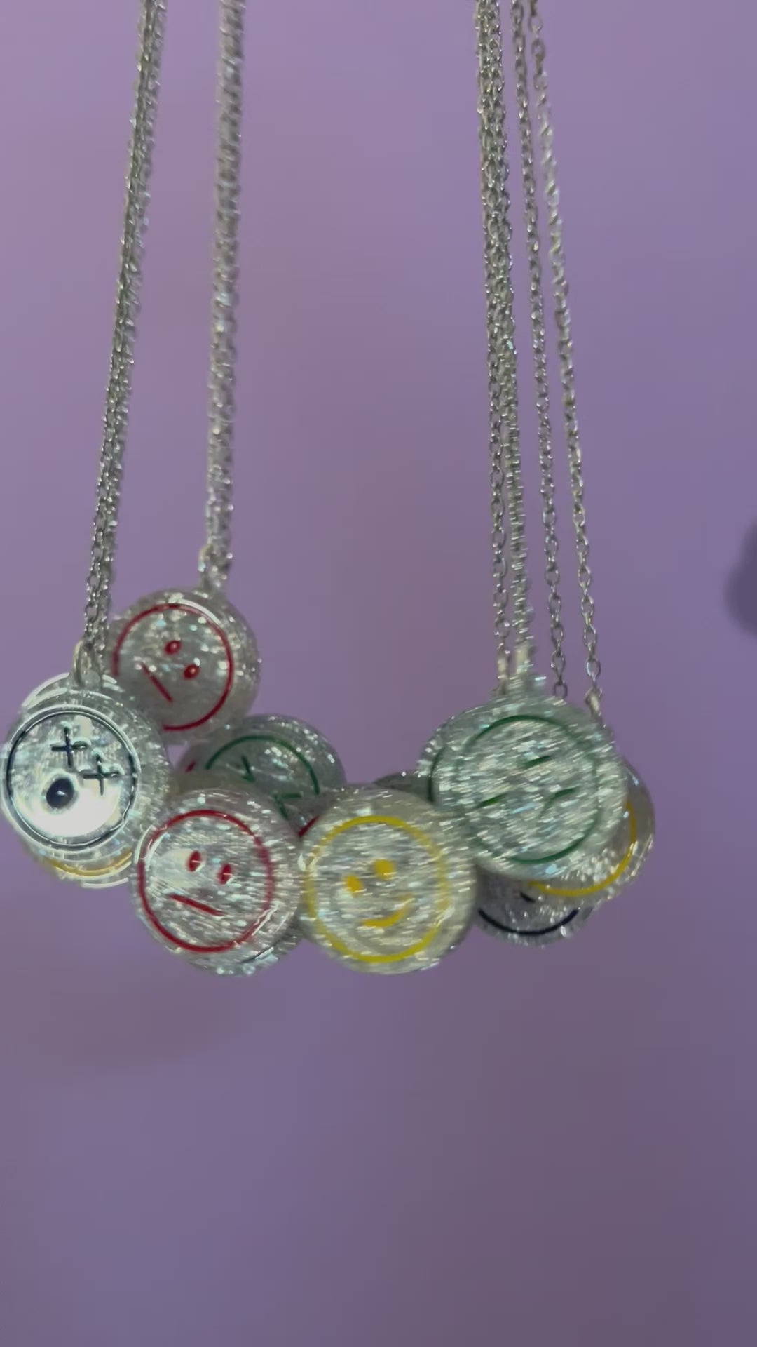 I got these funky acetate faces with mixed emotions and thought they'd look cool all together on a necklace. The base is made of silver fabric inlaid acrylic, with each necklace hanging on silver plated chain with a lobster clasp. Each necklace has the faces in a different order and will be picked at random.