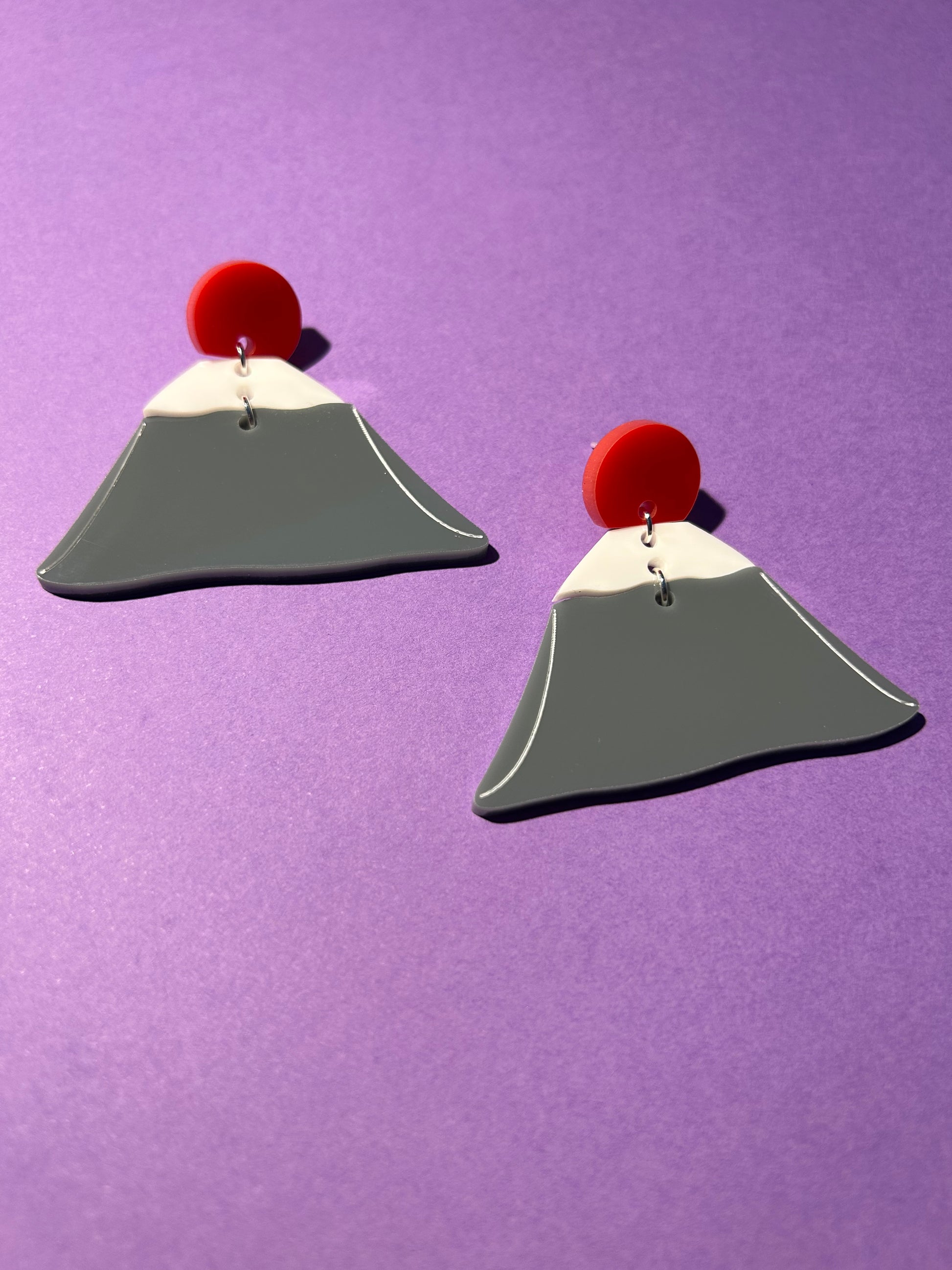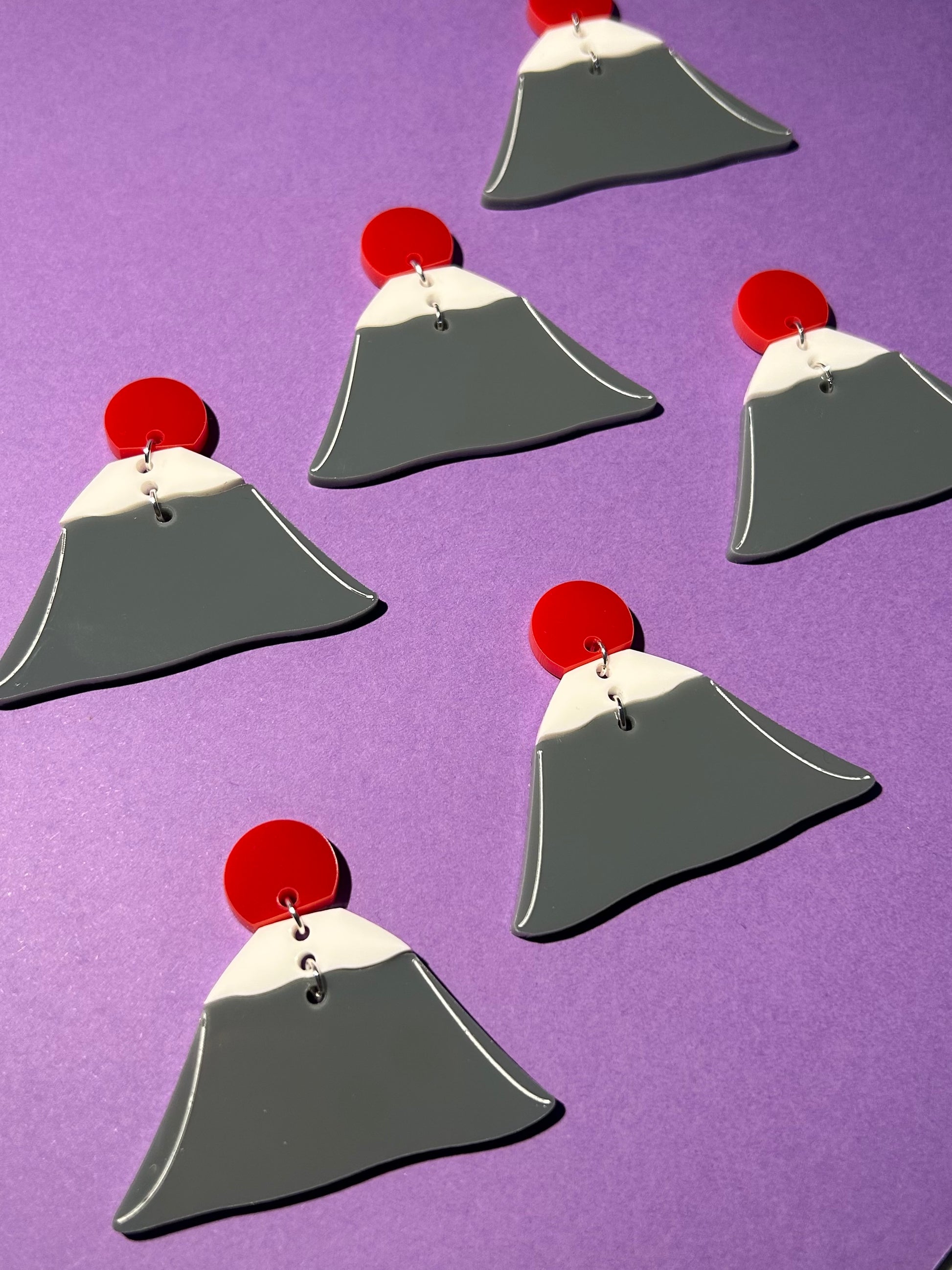 I am going to Japan soon to see this beautiful mountain and I hope to wear these earrings when I get there. Tomato red acrylic suns rising above white and dark grey acrylic mountains with light engraving. They are super cool and iconic.