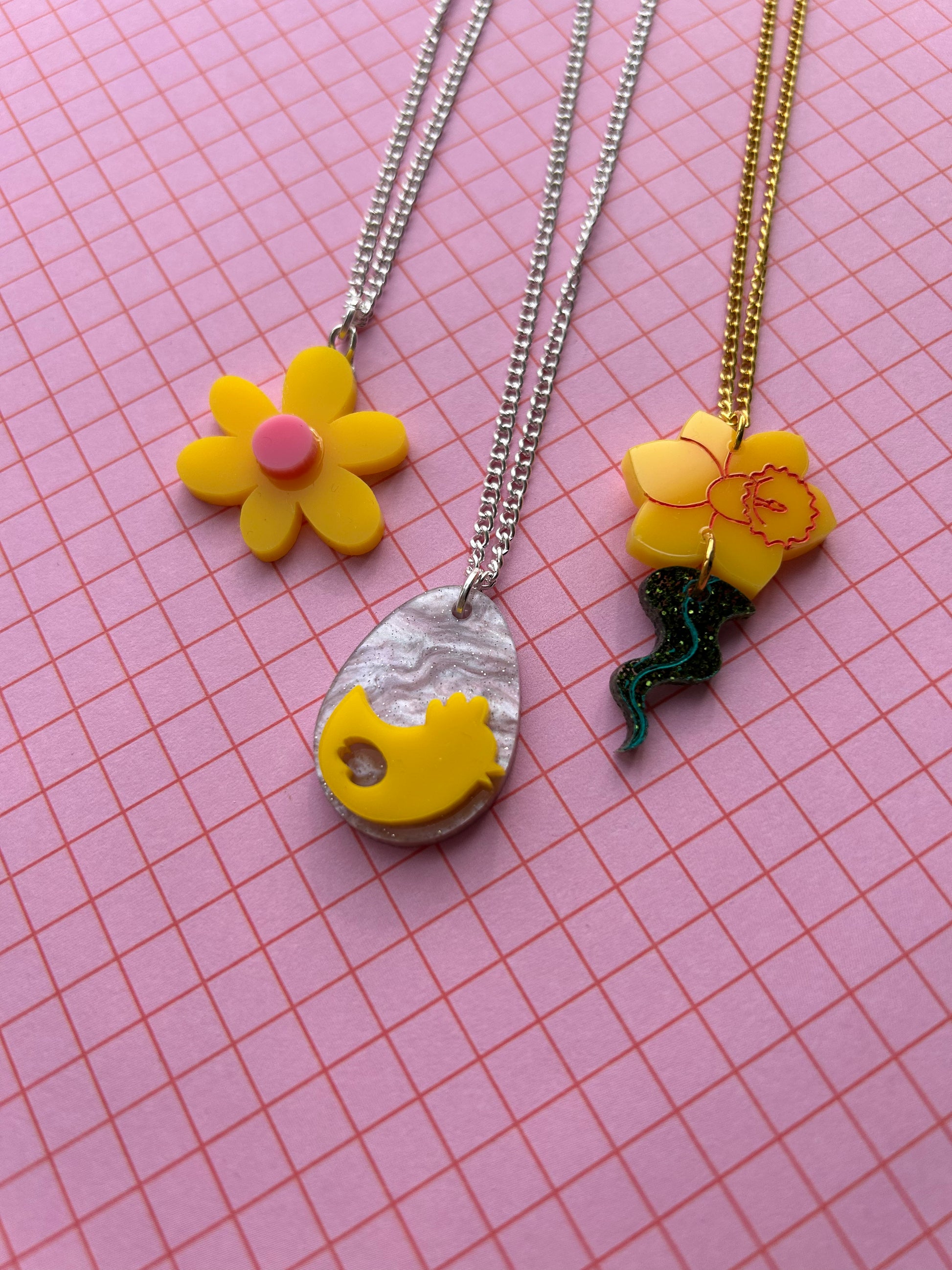 These necklaces are part of the Spring and Easter collection featuring yellow acrylic daisies with pink dots, lilac marble acrylic eggs with yellow chicks and yellow engraved acrylic daffodils with green glitter acrylic leaves. All strung on a metal chain with a lobster clasp.